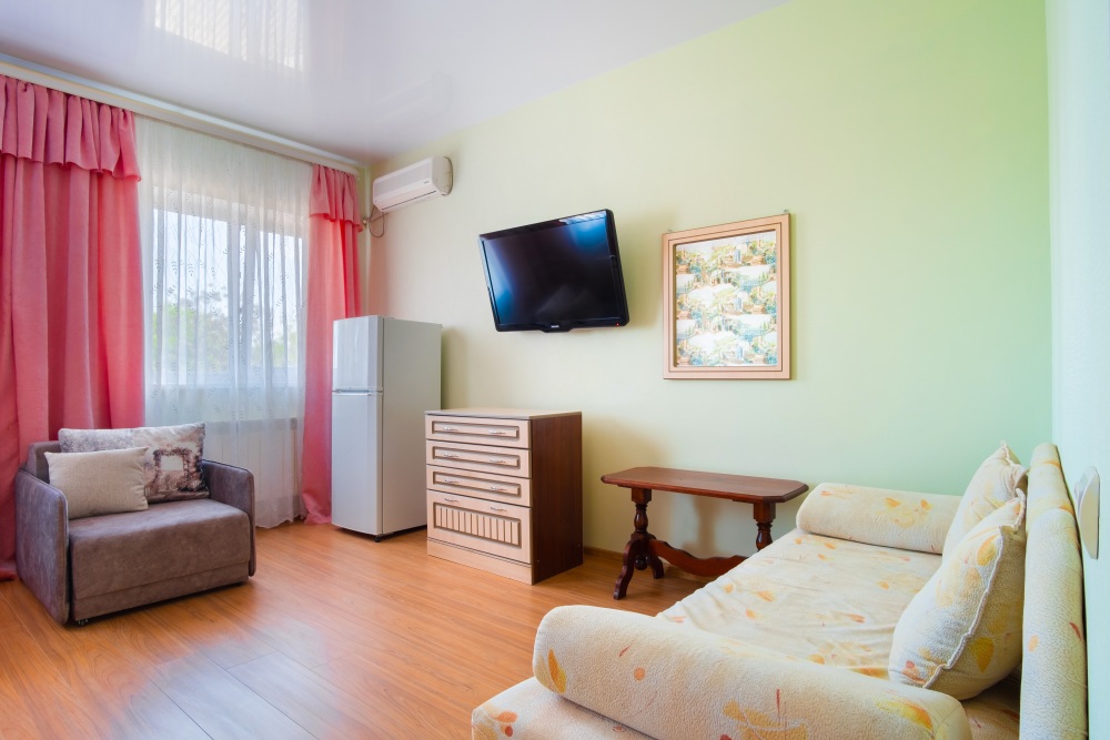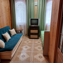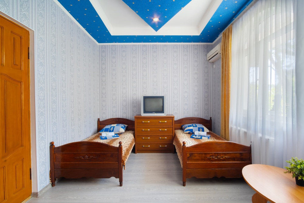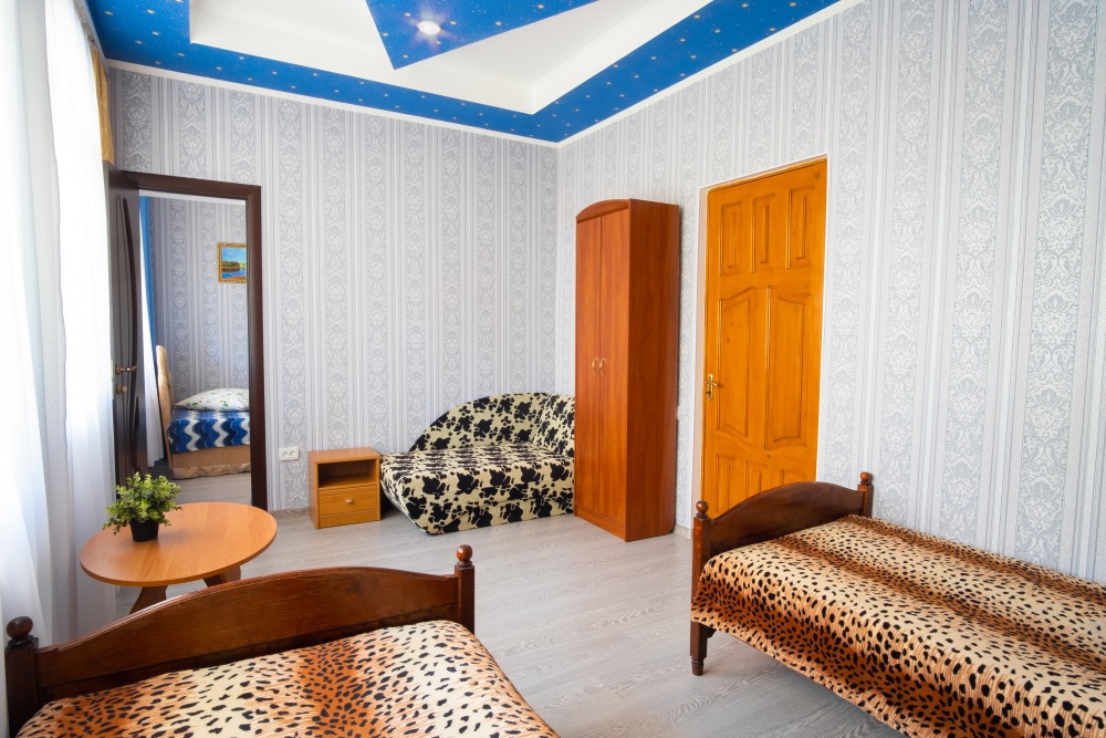 Номер «Звёздный» - название данного номера дали сами гости отеля. Это семейный люкс, полностью реновирован, и добавлена ванная комната с ванной, что особенно удобно для семей с детьми. Почему же «Звёздный»? Всё просто это из-за звёзд, которыми усыпан весь потолок. Номер получился звёздным в прямом смысле этого слова. Особенностью номера является также наличие двух окон, выходящих на балкон, вид на кроны деревьев. Выход на балкон через гостиную, там также расположена кухня, где можно что-то приготовить.