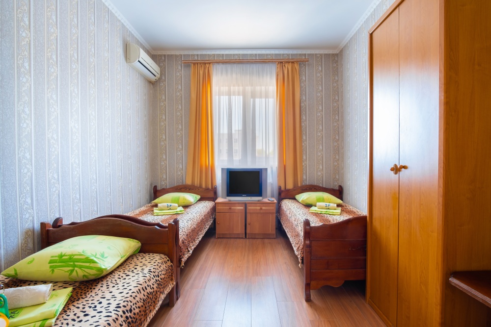 Номер «Твикс» - номер со смыслом. Две палочки твикс, как в шоколадке. Такое название получил, так как здесь установлены две раздельные кровати. Приятный номер, выполненный в спокойных тонах. Имеет интересное название и пользуется спросом, так как один такой в своей категории. Все остальные номера с большими двухспальными кроватями, а здесь две полуторные. Материал из которого сделаны кровати - дуб. Номер находится на втором этаже, напротив номера «Кокос». Часто бронируют семьи: в одной комнате живут родители, другой дети. Душ и туалет общие на два номера, на этаже.