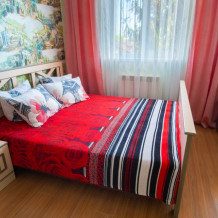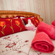 Номер «Малиновый рай»- уединённый, романтичный номер. Мебель сделана из дуба ручной работы. Номер находится на 1-м этаже, подойдёт для всех желающих отдохнуть у нас. Мы называем его универсальным, из-за его расположения часто пользуется спросом. Душ и туалет общие на два номера, на этаже.
