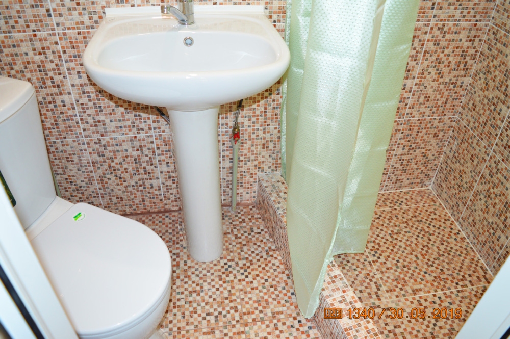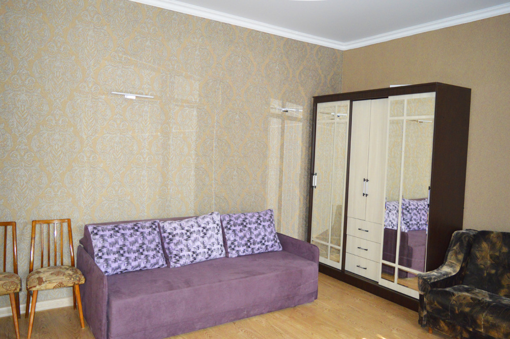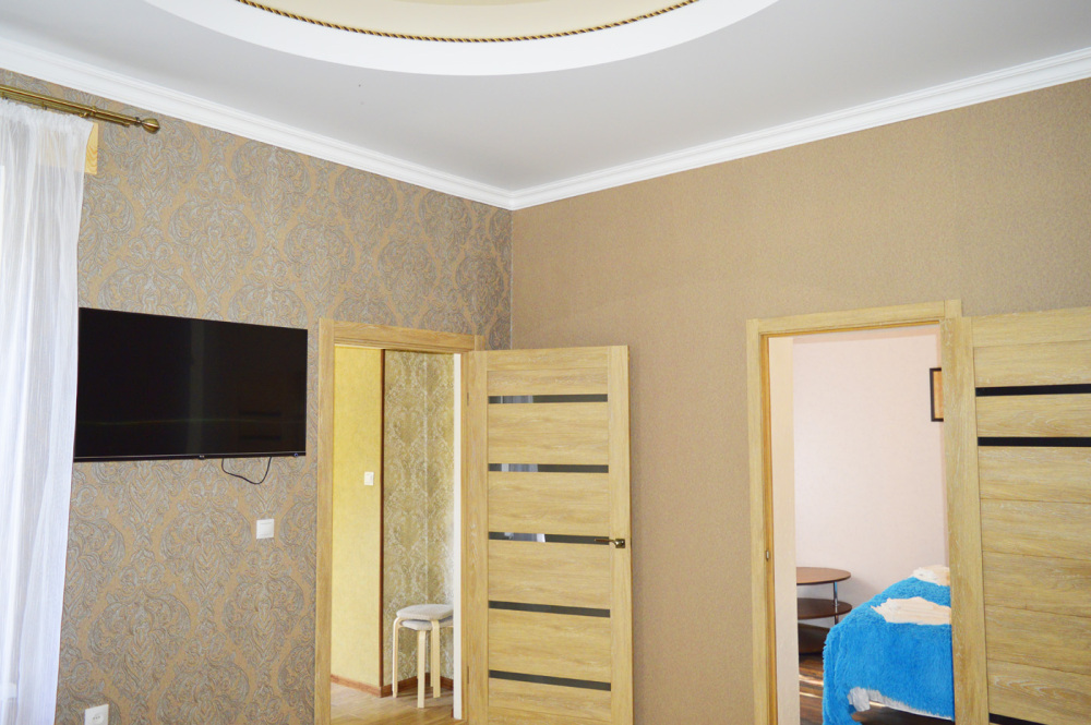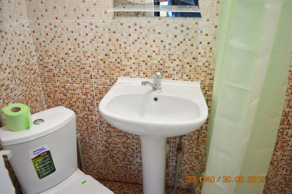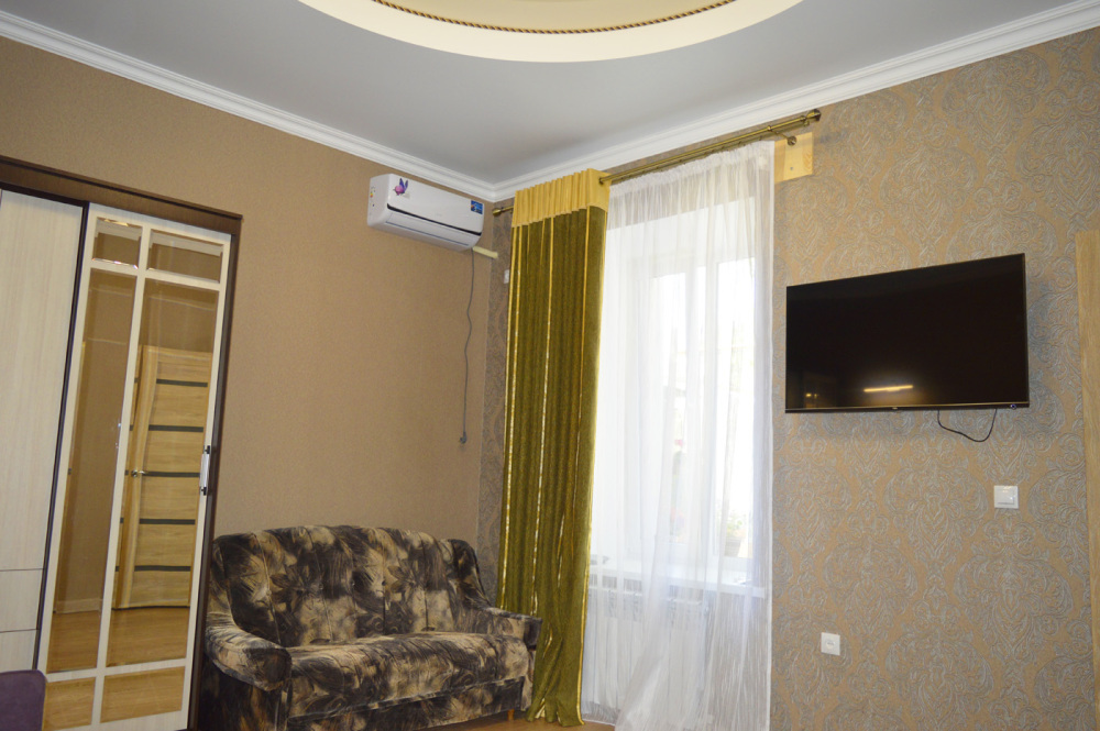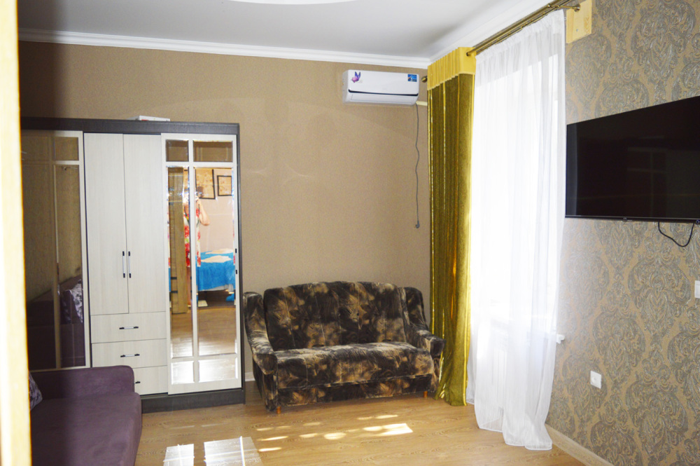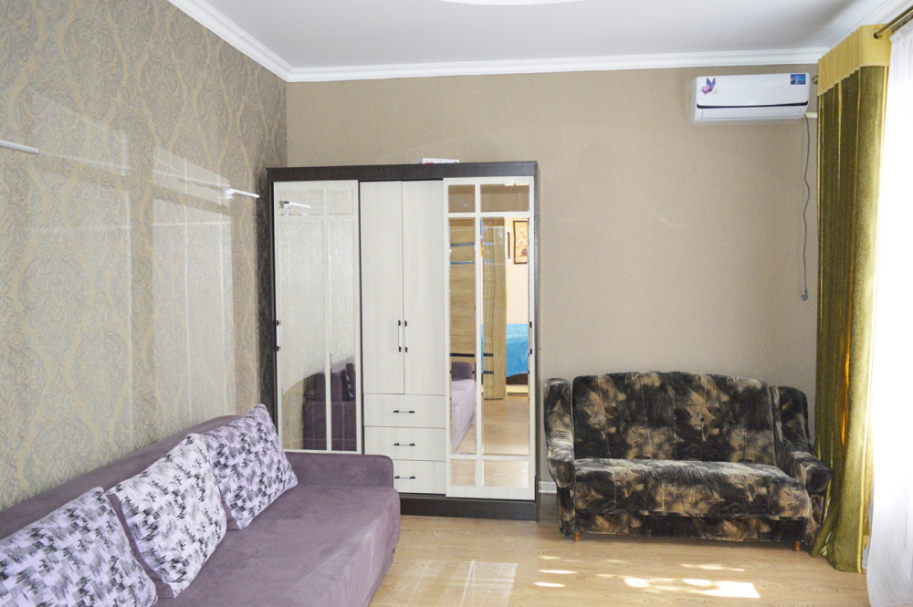 В доме: две смежные комнаты. Первая комната- спальня. Двуспальная кровать, 1600 см. Вторая комната-зал. В комнате двуспальный диван, детский диванчик, зеркальный шкаф для белья. В доме кондиционер, телевизор и интернет. Дом имеет кухню с набором посуды, холодильник, санузел, стиральную машинку.