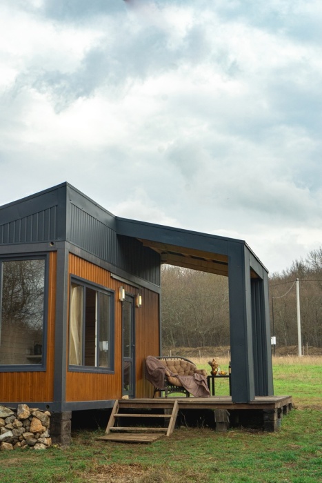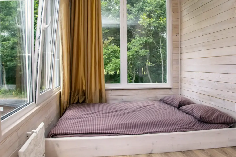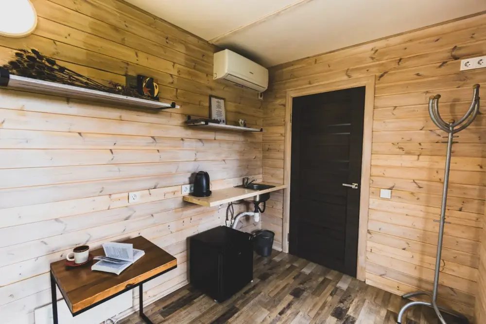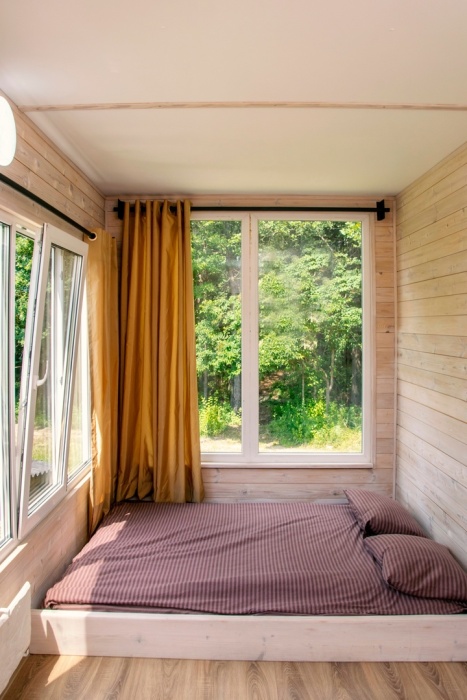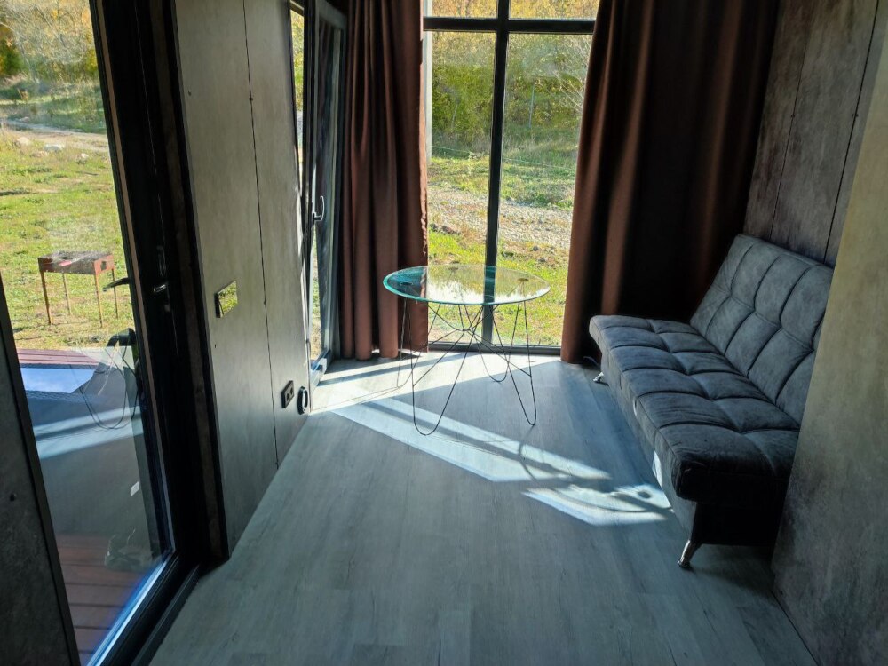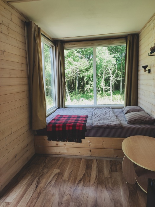 Уютный домик - в нем Вам точно понравится, для Вас панорамные окна с видом на лес (кухня в домике не предусмотрена, есть эл. чайник, холодильник, приходите в наш фудтрак). В домиках - теплый пол, обогреватель, кондиционер, холодильник, будет комфортно.