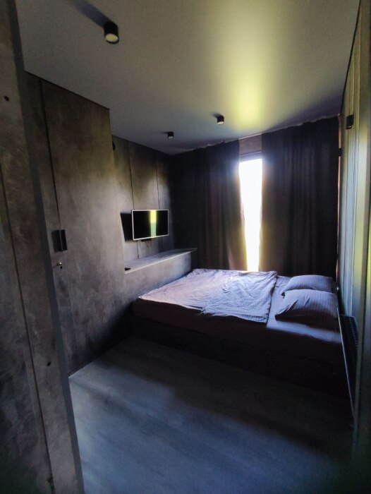 Отдельная спальня: с двуспальной кроватью, шкафом и панорамными окнами, вид на горы.
