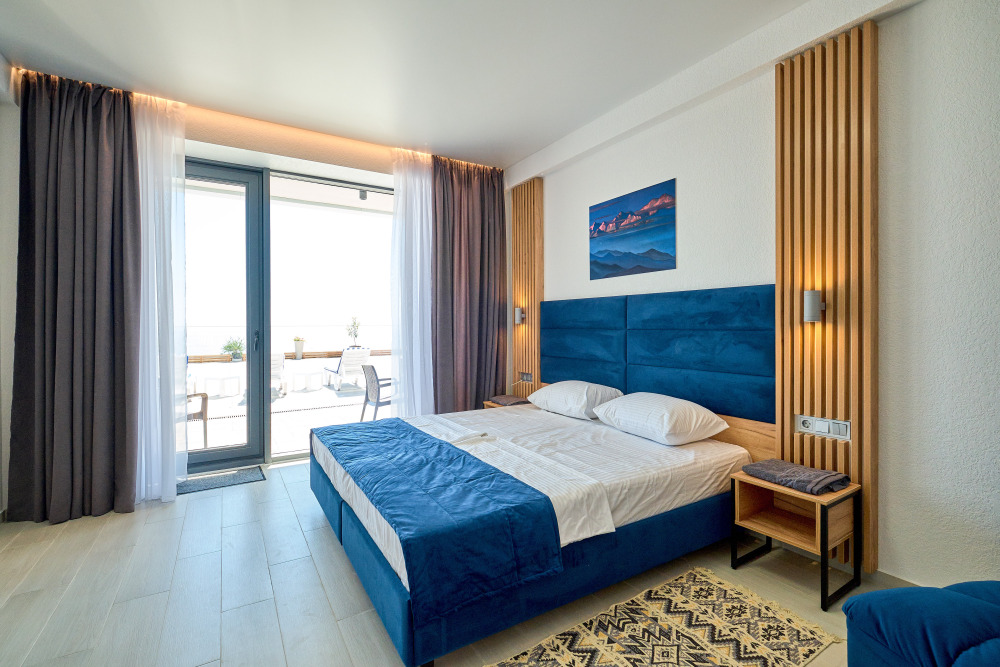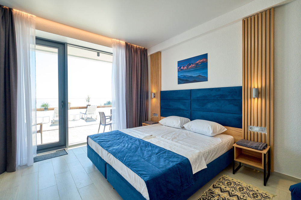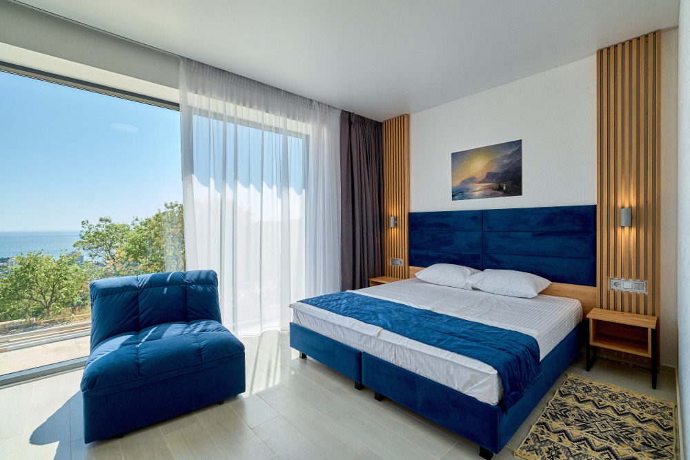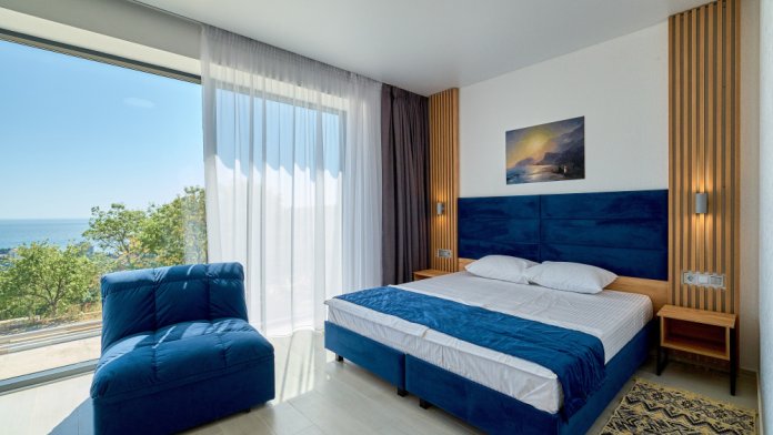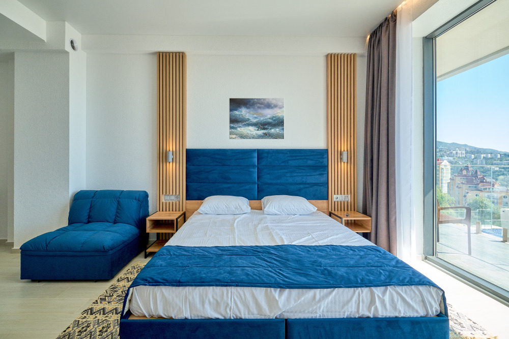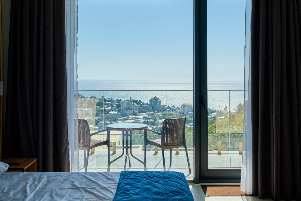 Увидеть море и центр Ялты не вставая с кровати - парящая над морем стильная студия в новой вилле комфорт-класса с закрытой территорией с панорамным остеклением и балконом, выходящим на море и город поможет Вам исполнить эту мечту.