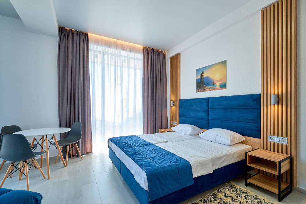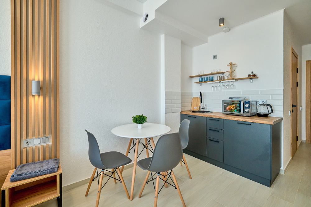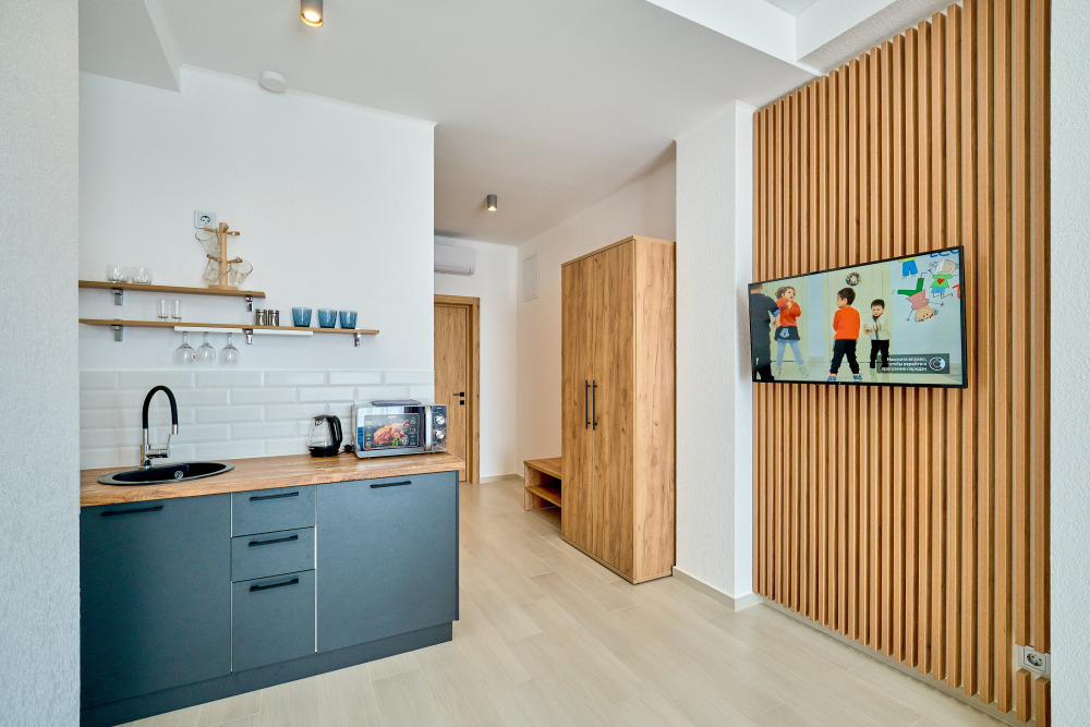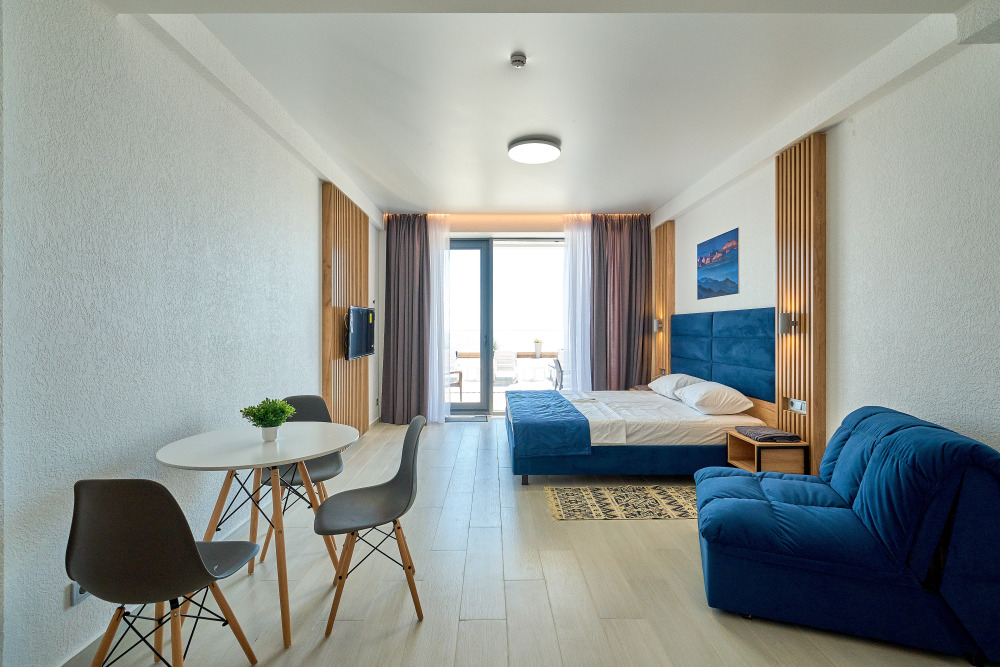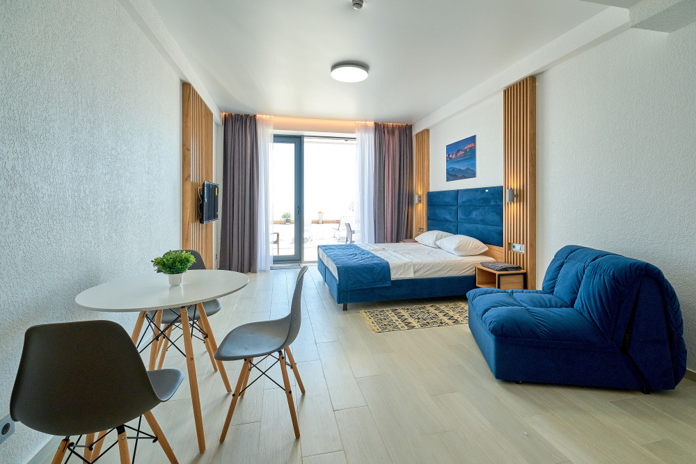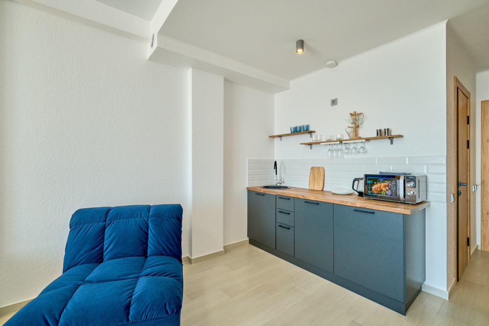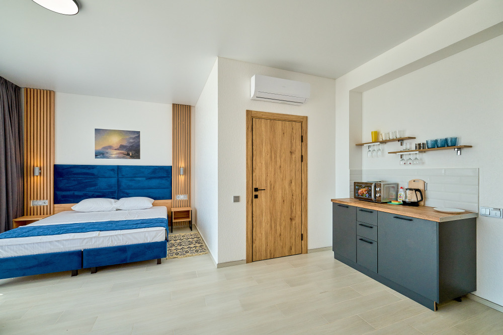 В апартаменте имеется спальная зона с удобной двуспальной кроватью или двумя односпальными кроватями, кухонной зоной с функциональным рабочим столом, тостером, микроволновой печью, столовой посудой. Бокалами, рюмками, стаканами, чашками, столовыми приборами, салатником, разделочной доской, ножами. Туалет с индивидуальными туалетными принадлежностями. В номере: столик с тремя стульями, настенное зеркало, шкаф, светильники, мини-холодильник, чайник, тостер, кондиционер. WI-FI, одноразовые тапочки.