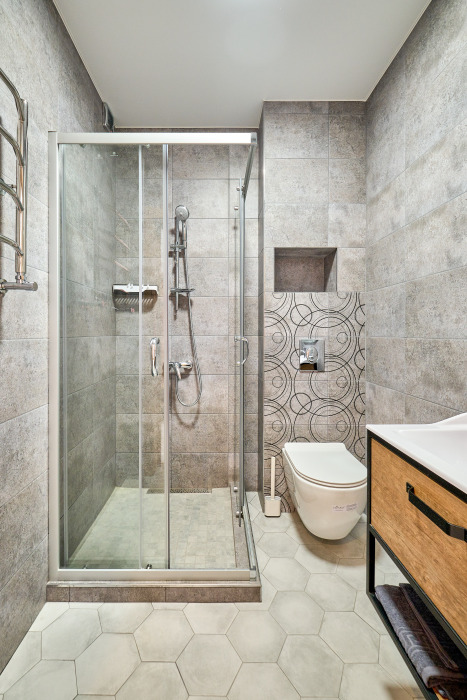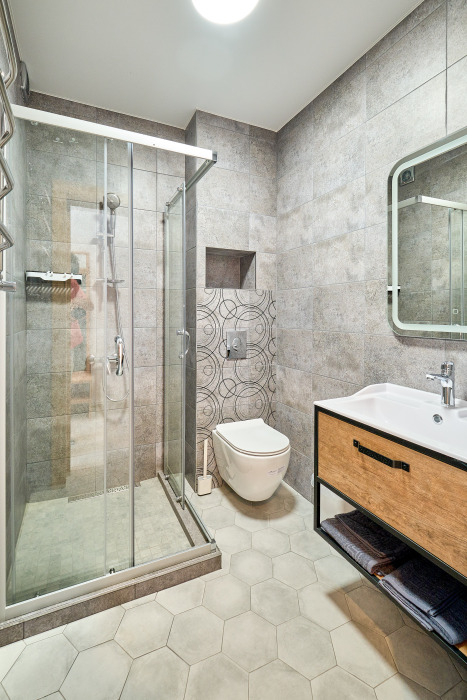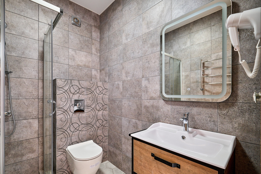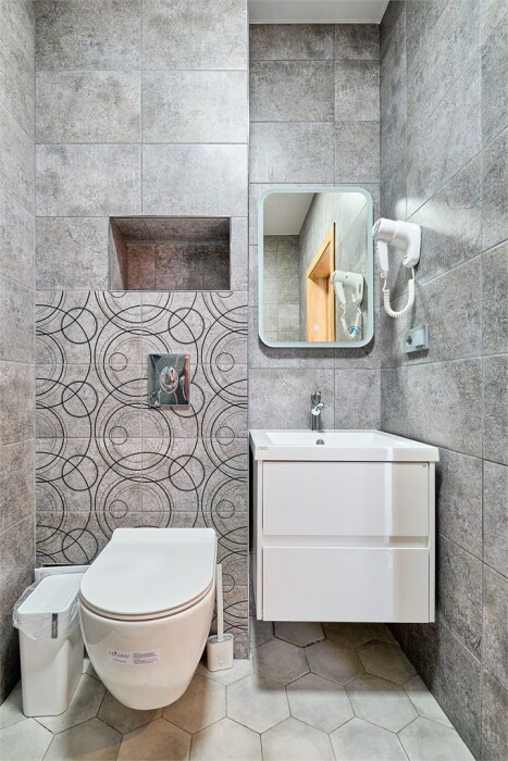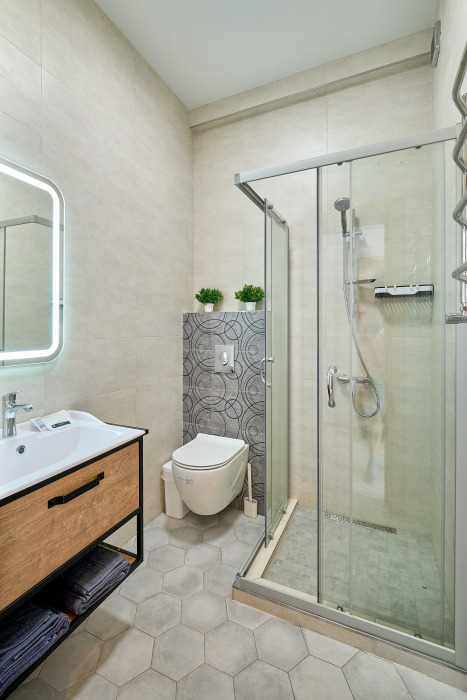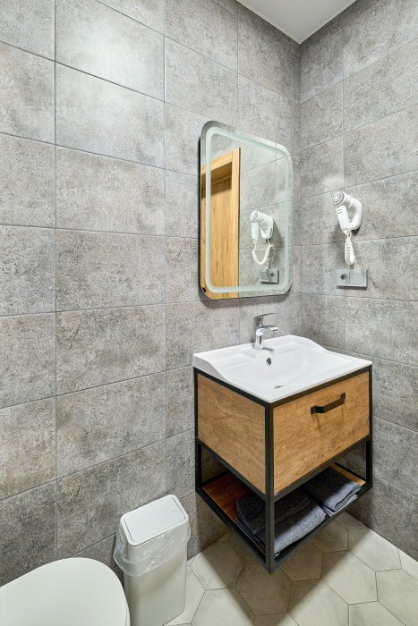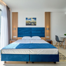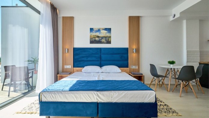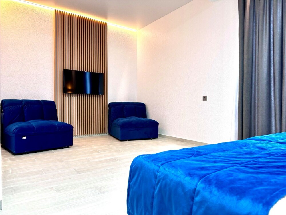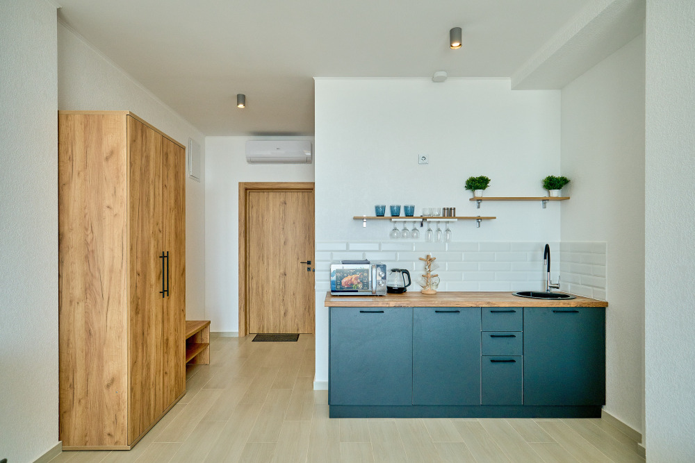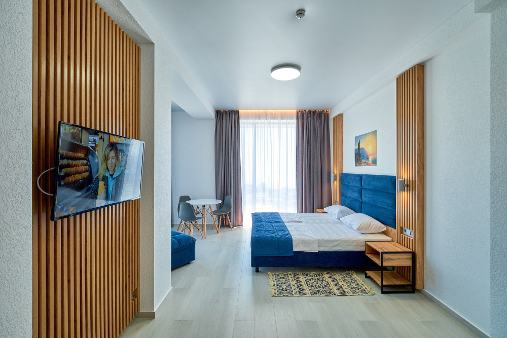 В апартаменте имеется спальная зона с удобной двуспальной кроватью или двумя односпальными кроватями, кухонной зоной с функциональным рабочим столом, тостером, микроволновой печью, столовой посудой. Бокалами, рюмками, стаканами, чашками, столовыми приборами, салатником, разделочной доской, ножами. Туалет с индивидуальными туалетными принадлежностями. В номере: столик с тремя стульями, настенное зеркало, шкаф, светильники, мини-холодильник, чайник, тостер, кондиционер. WI-FI, одноразовые тапочки.