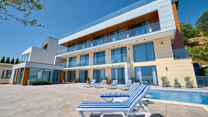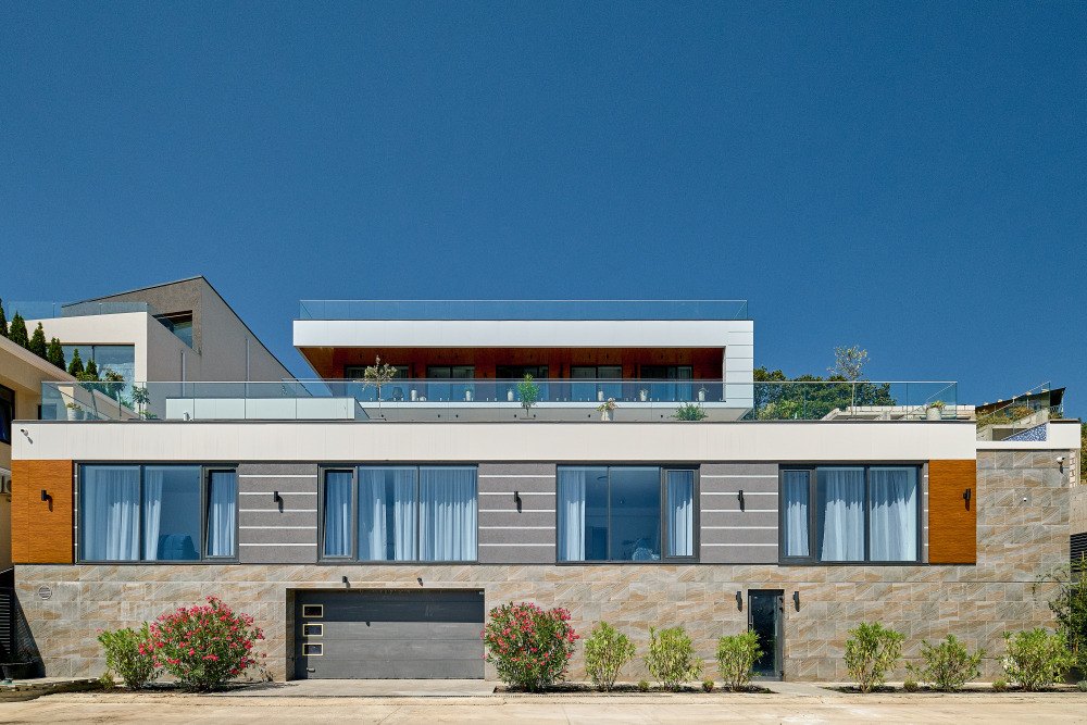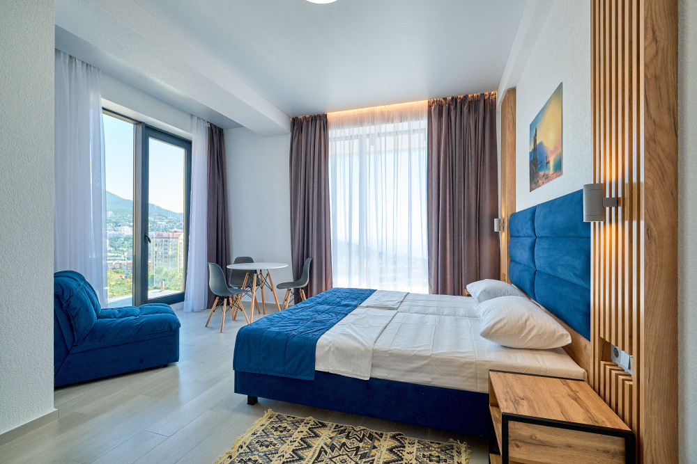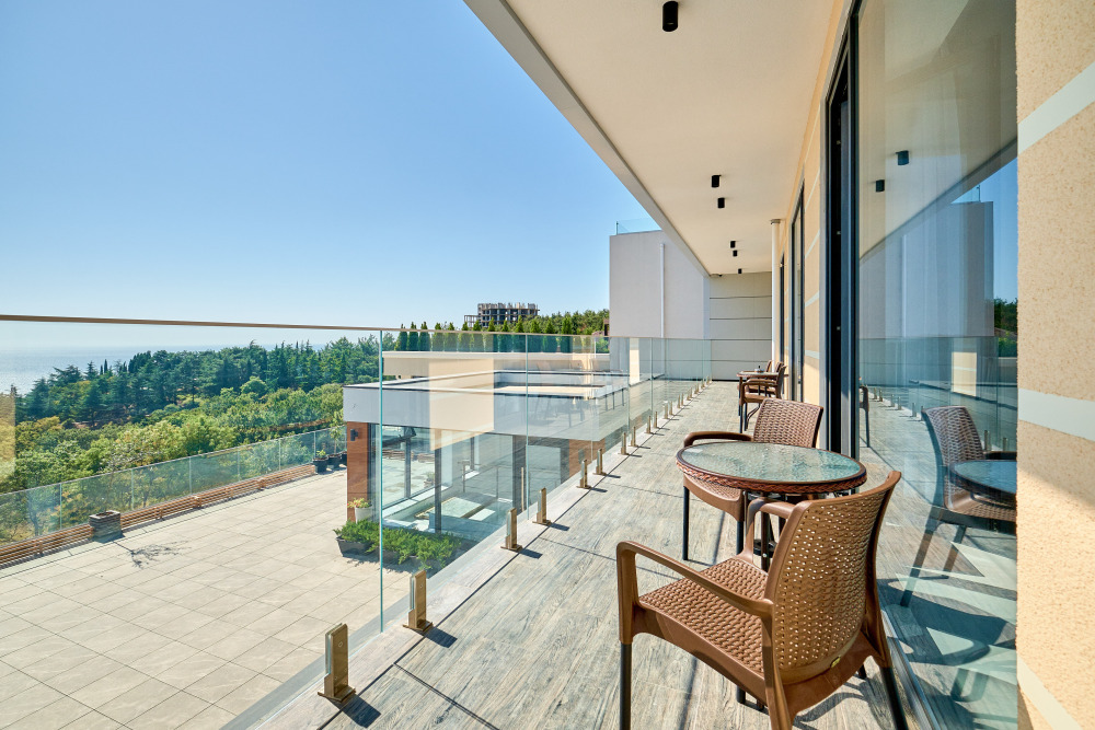 Парящая над морем стильная студия с закрытой территорией, с панорамным остеклением и балконом, выходящим на море и город.