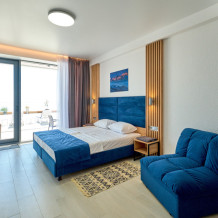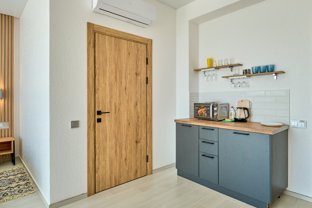 В апартаменте имеется спальная зона с удобной двуспальной кроватью или двумя односпальными кроватями, кухонной зоной с функциональным рабочим столом, тостером, микроволновой печью, столовой посудой. Бокалами, рюмками, стаканами, чашками, столовыми приборами, салатником, разделочной доской, ножами и т. д. Туалет с индивидуальными туалетными принадлежностями. В номере: столик с тремя стульями, настенное зеркало, шкаф, светильники,, мини-холодильник, чайник, тостер, кондиционер. WIFI, одноразовые тапочки.