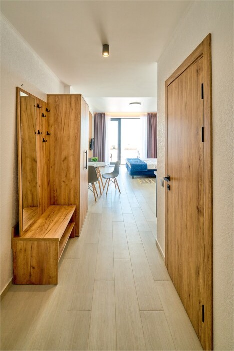 В апартаменте имеется спальная зона с удобной двуспальной кроватью или двумя односпальными кроватями, кухонной зоной с функциональным рабочим столом, тостером, микроволновой печью, столовой посудой. Бокалами, рюмками, стаканами, чашками, столовыми приборами, салатником, разделочной доской, ножами. Туалет с индивидуальными туалетными принадлежностями. В номере: столик с тремя стульями, настенное зеркало, шкаф, светильники,, мини-холодильник, чайник, тостер, кондиционер. WIFI, одноразовые тапочки.