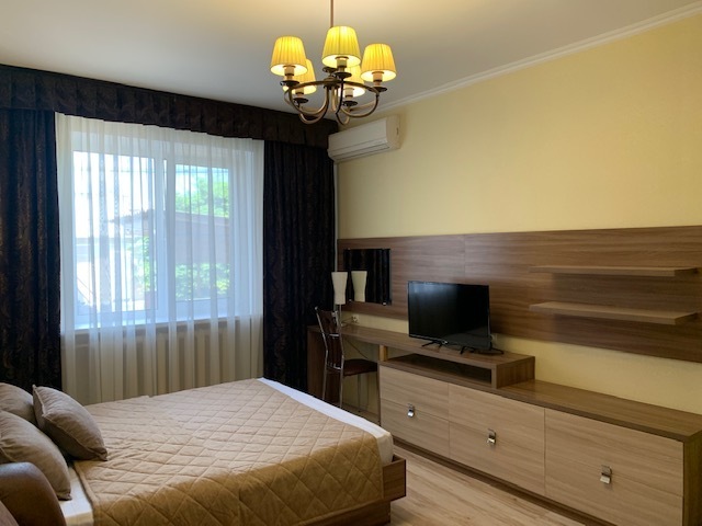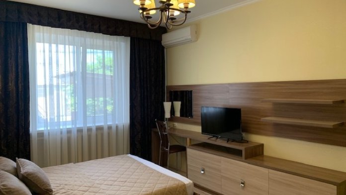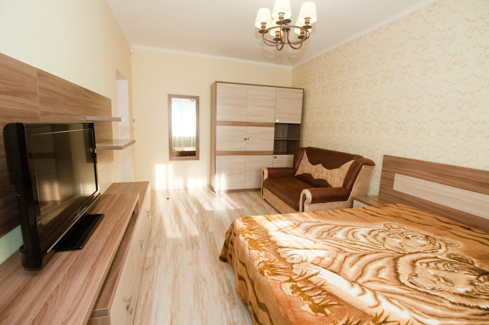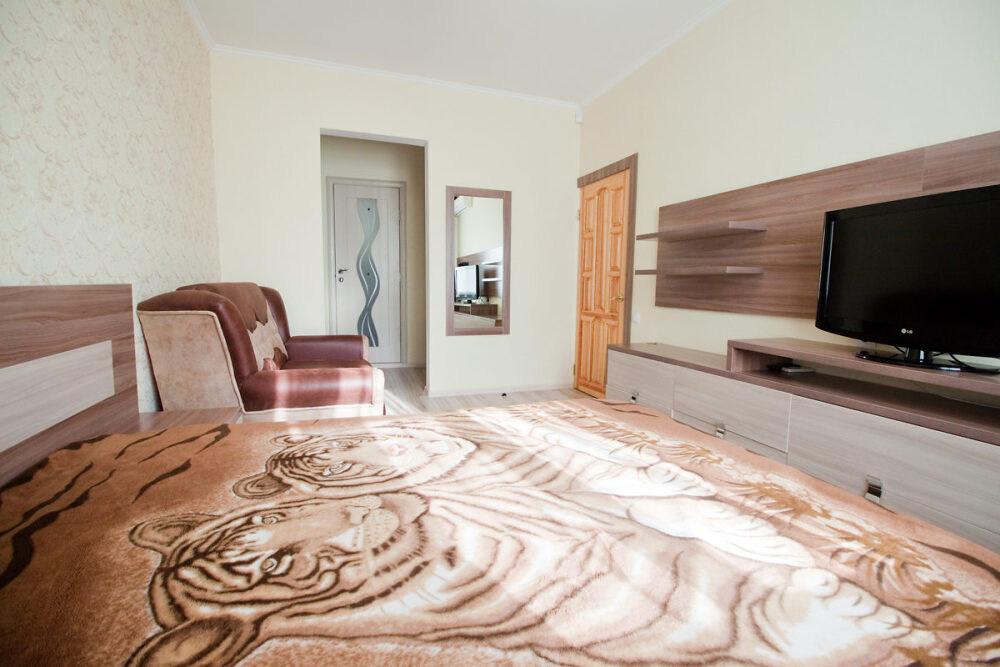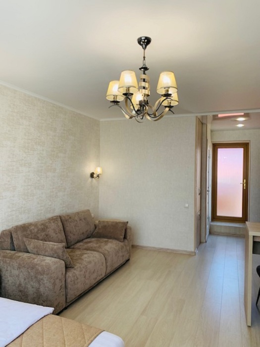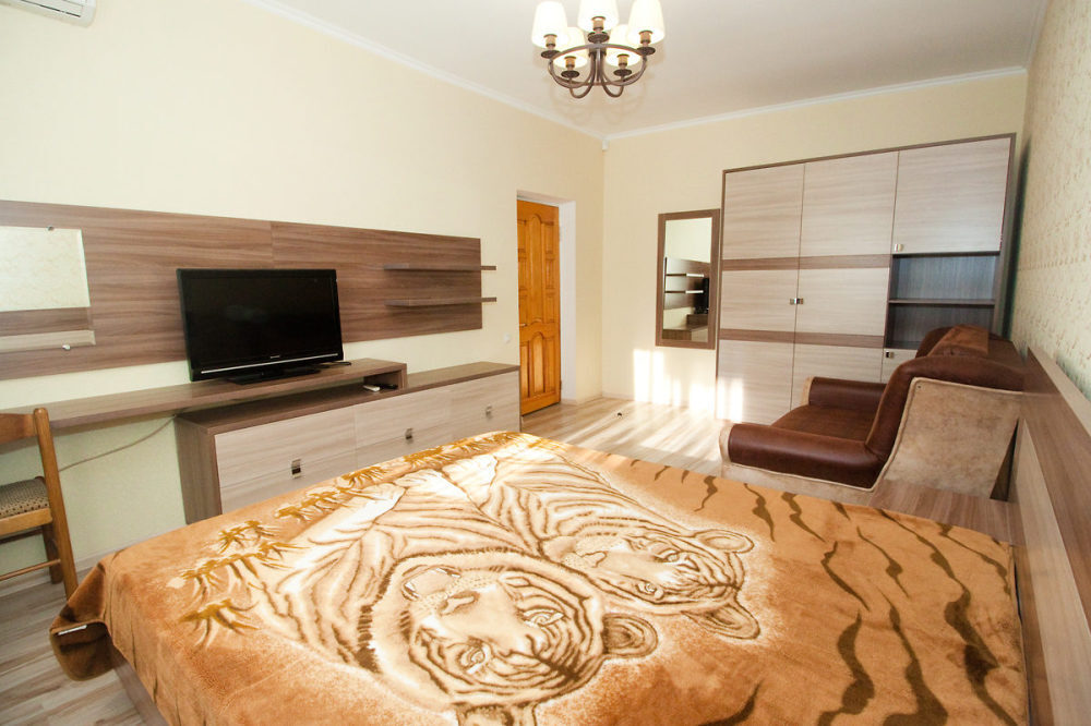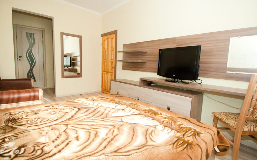 В номере: туалет, душ, кондиционер, два телевизора, холодильник. Wi-Fi - (роутер рядом с номером). Из мебели: кровать двуспальная, 2 дивана двуспальных, две прикроватных тумбочки, тумбочка для телевизора, пенал для белья, внутренний шкаф для чемоданов, сумок. Рабочий стол для компьютера, журнальный столик, парфюмерный столик. Кухня на этом же этаже, рядом с номером (на три семьи,), где находится вся не обходимая посуда, для приготовления пищи, микроволновка, газовая плита.