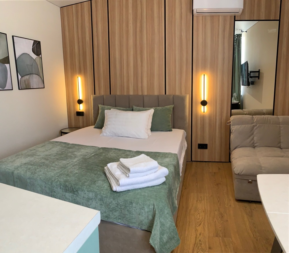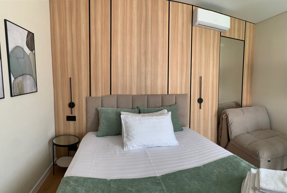 Двуспальная кровать и двуспальная кровать-диван. В номере туалет, душ, кондиционер, телевизор, холодильник.
