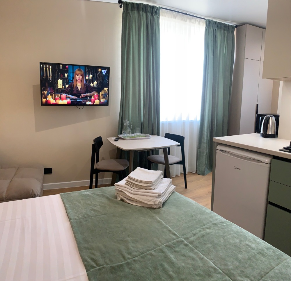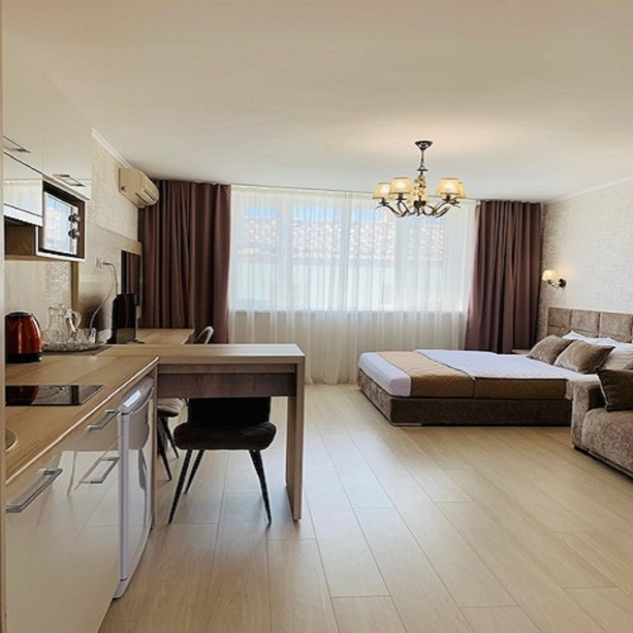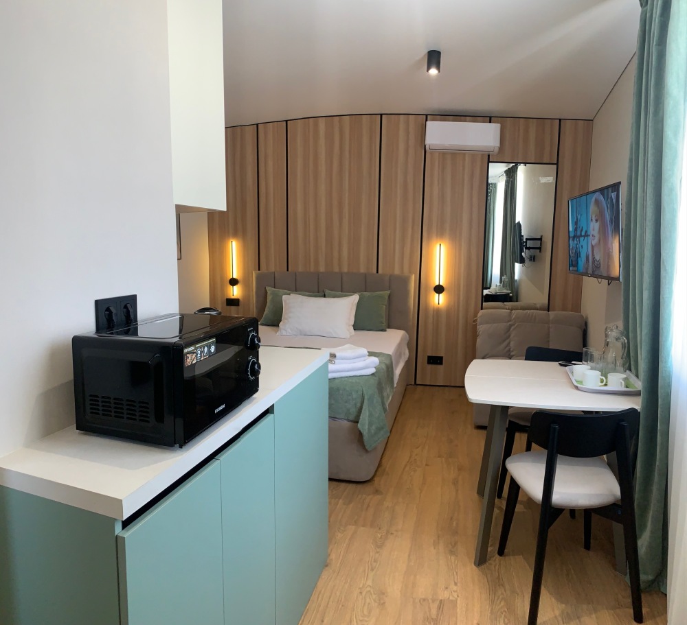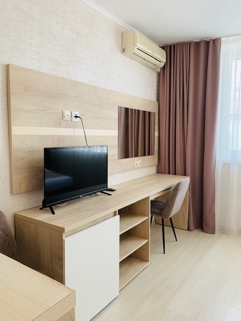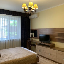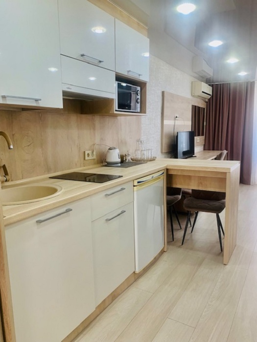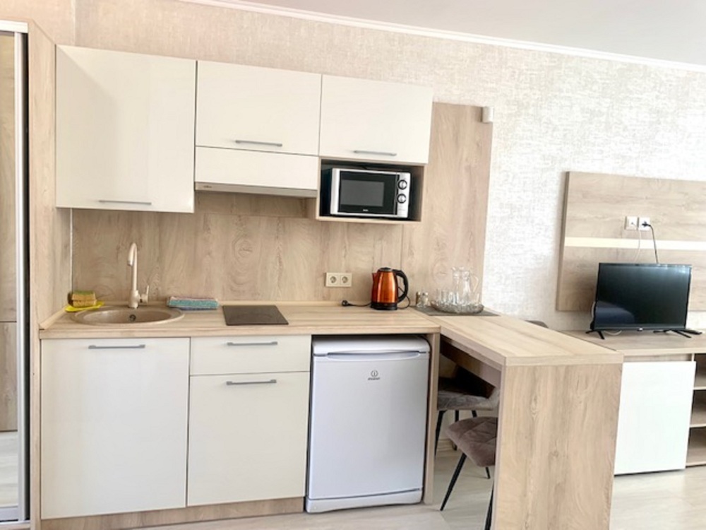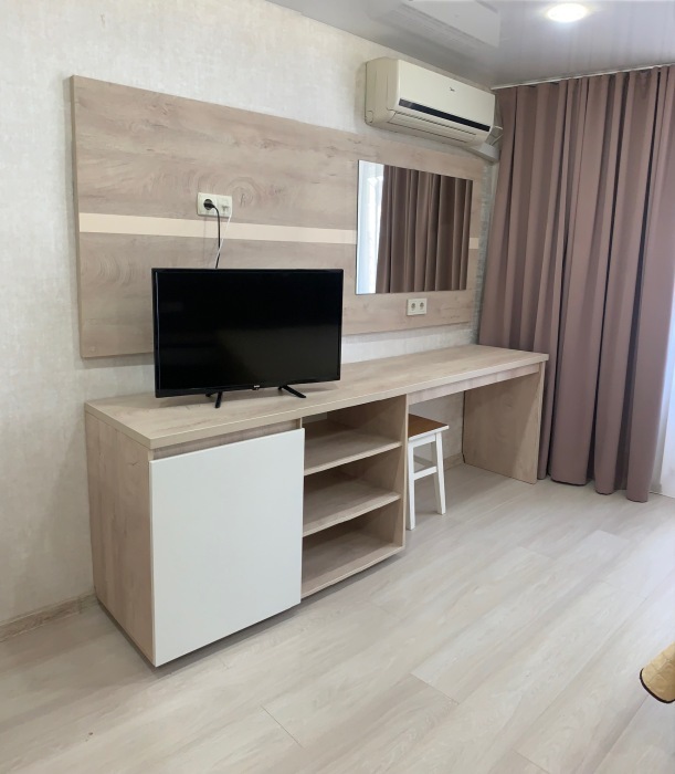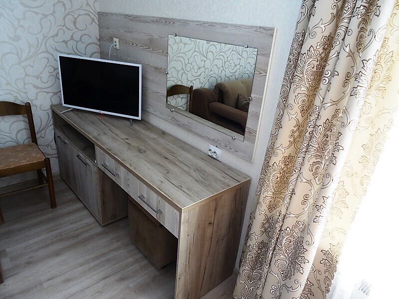 Из мебели: платяной шкаф, парфюмерный столик, тумбочки под телевизор, два журнальных столика, стулья. Кухня в номере: имеет вытяжку, электроплитку, СВЧ-печь, посуда вся не обходимая - для готовки завтраков, обедов, ужинов.