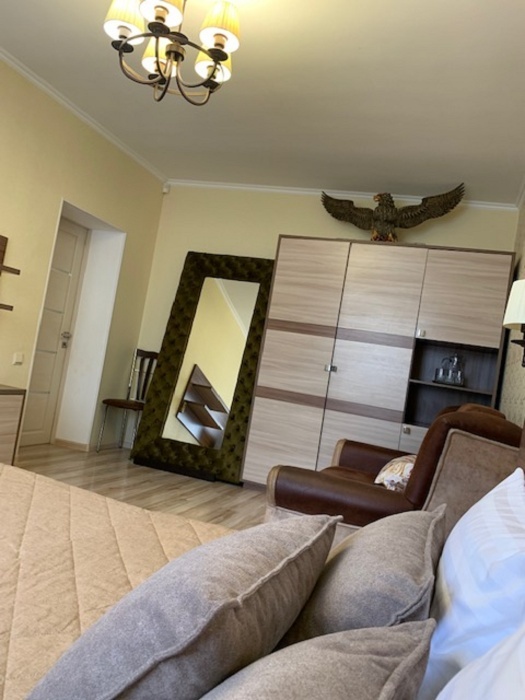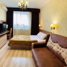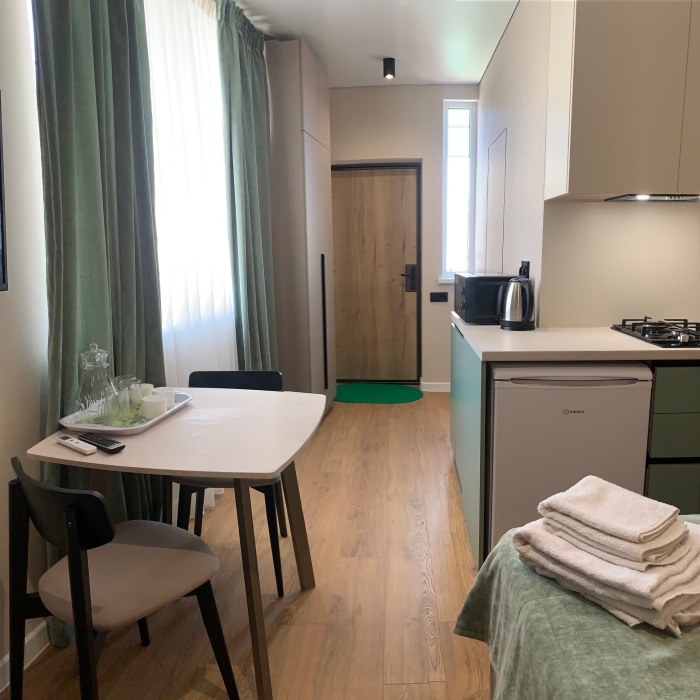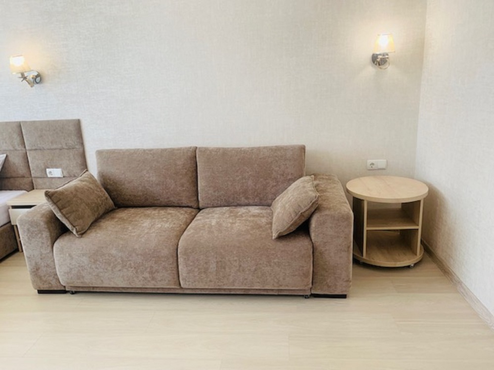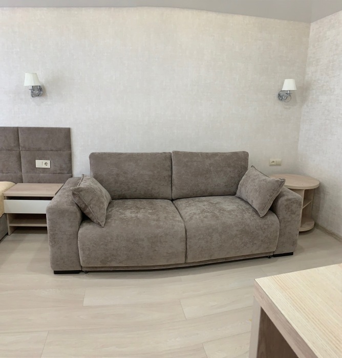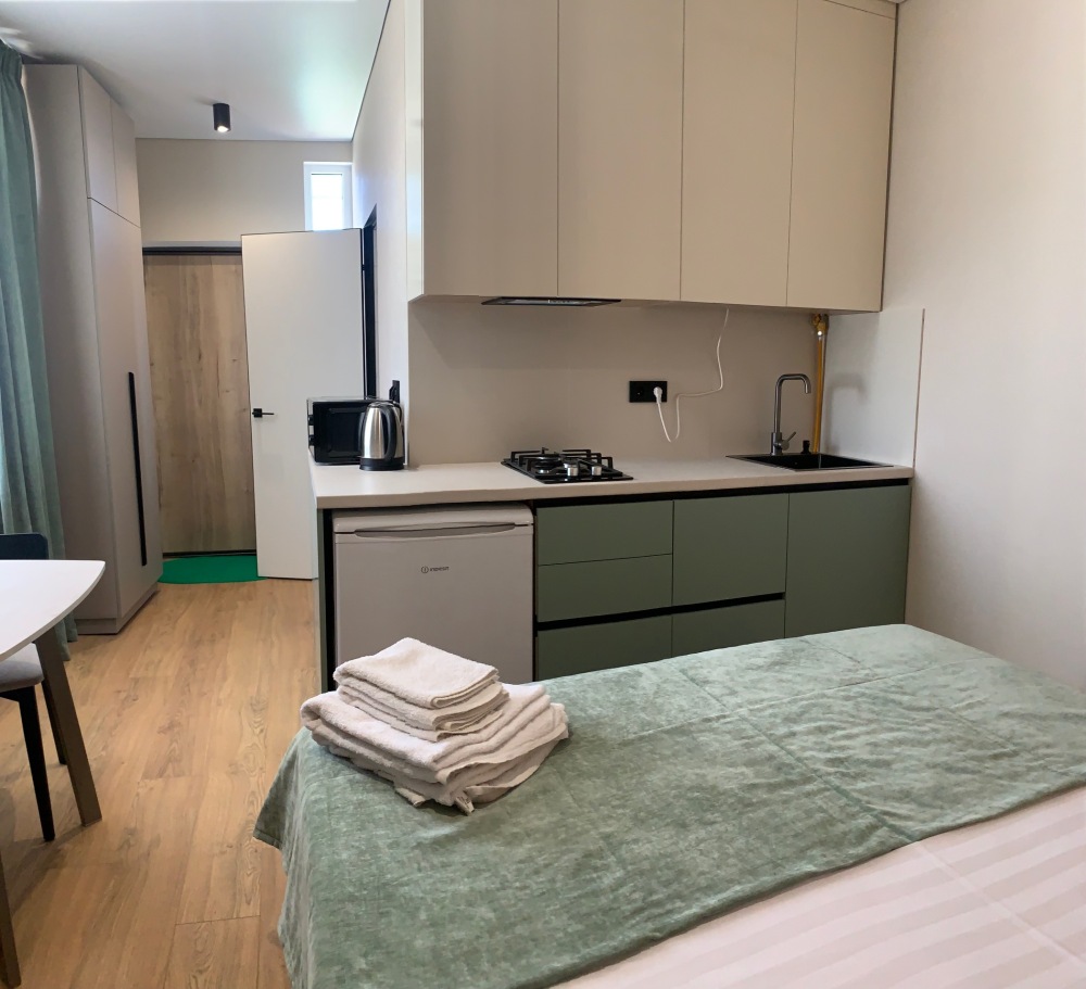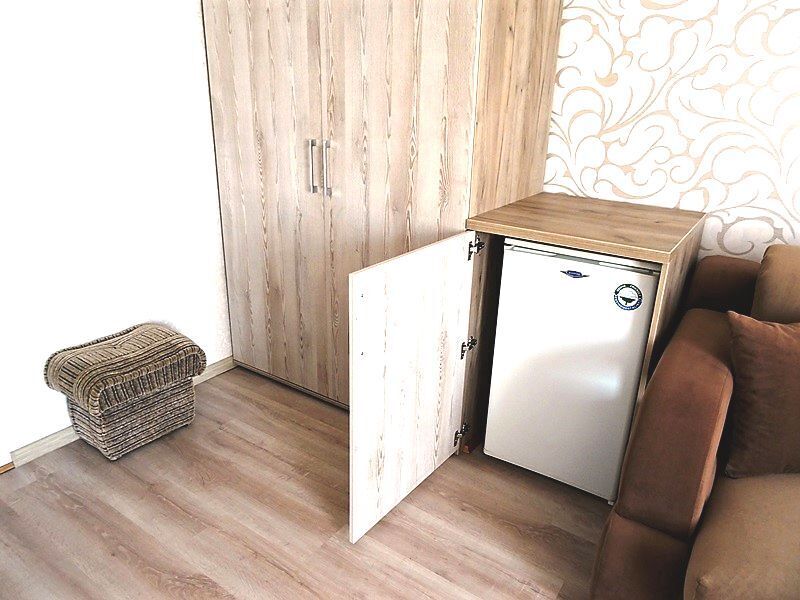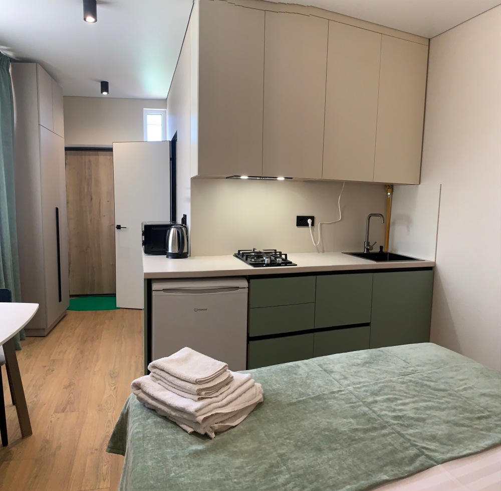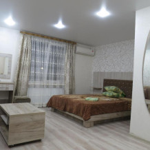 Из мебели: платяной шкаф, парфюмерный столик, тумбочки под телевизор, два журнальных столика, стулья. Кухня в номере: имеет вытяжку, электроплитку, СВЧ-печь, посуда вся не обходимая - для готовки завтраков, обедов, ужинов.