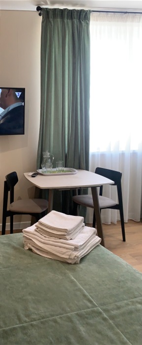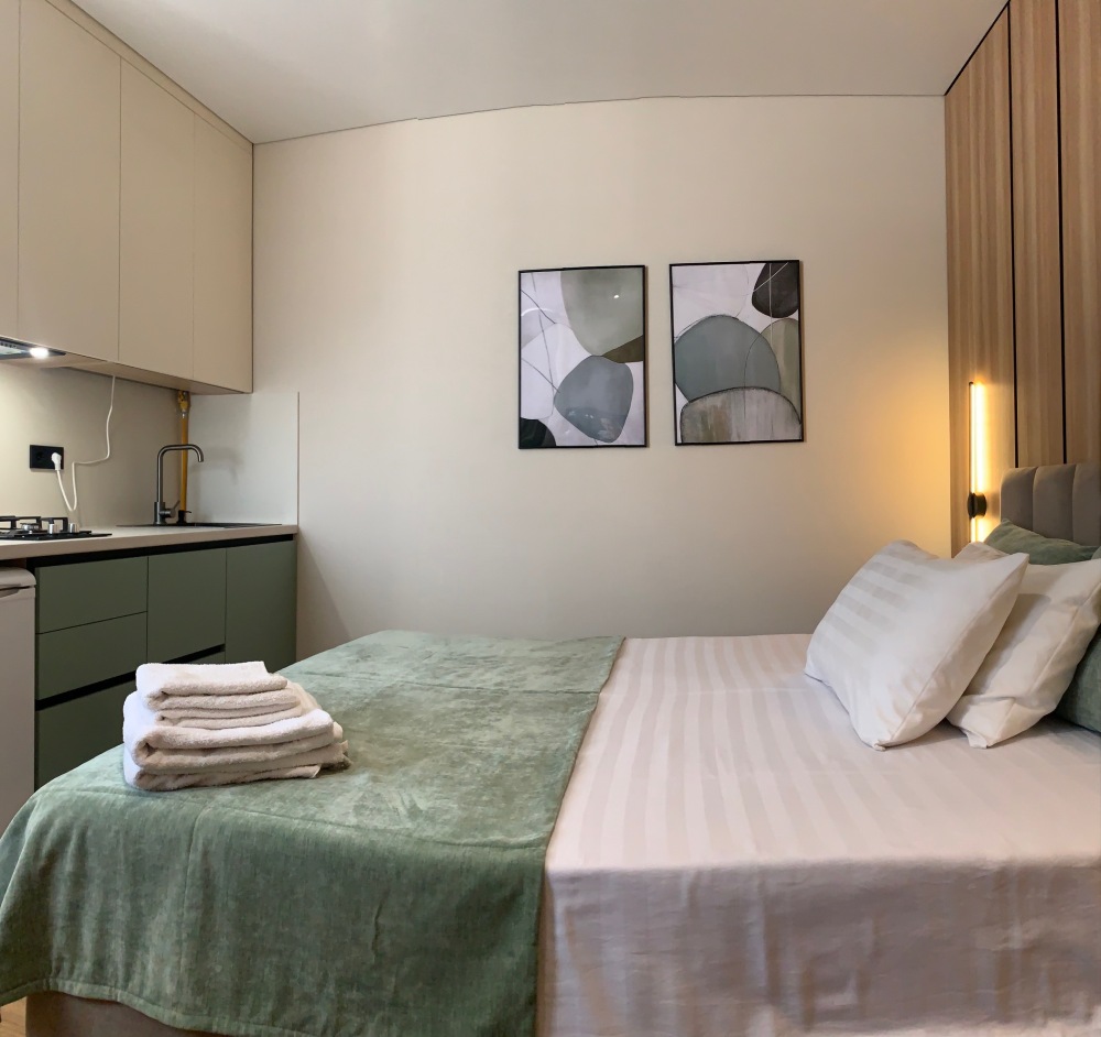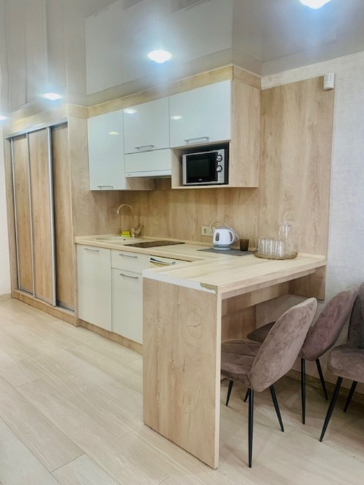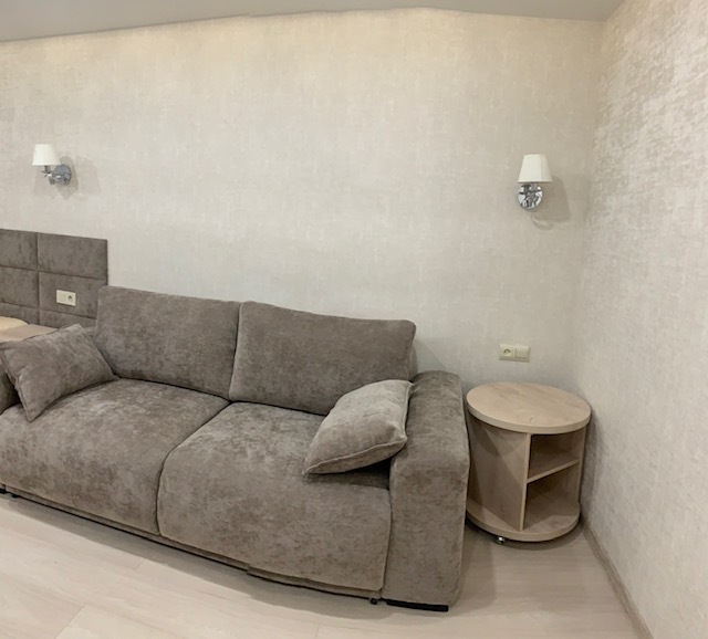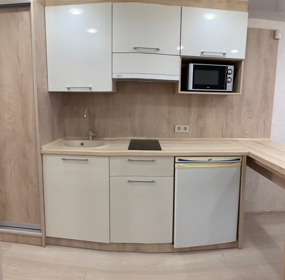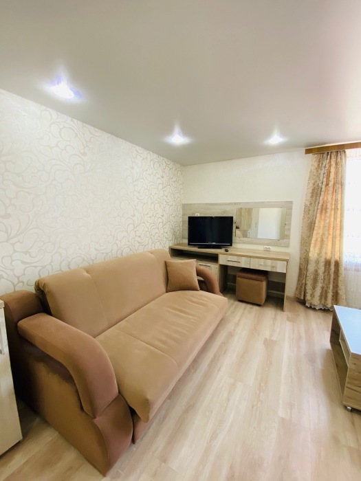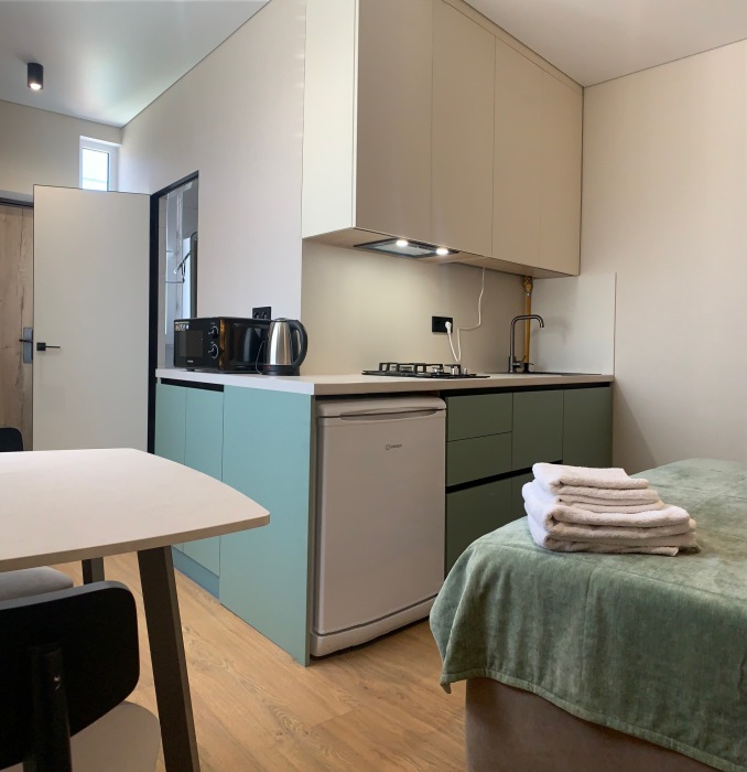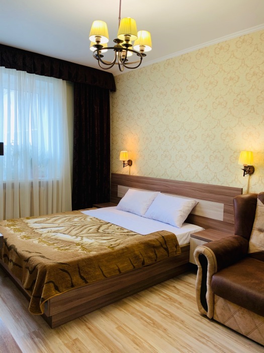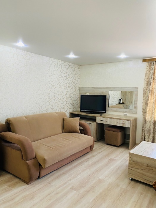 Из мебели: платяной шкаф, парфюмерный столик, тумбочки под телевизор, два журнальных столика, стулья. Кухня в номере: имеет вытяжку, электроплитку, СВЧ-печь, посуда вся не обходимая - для готовки завтраков, обедов, ужинов.