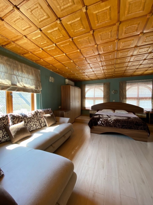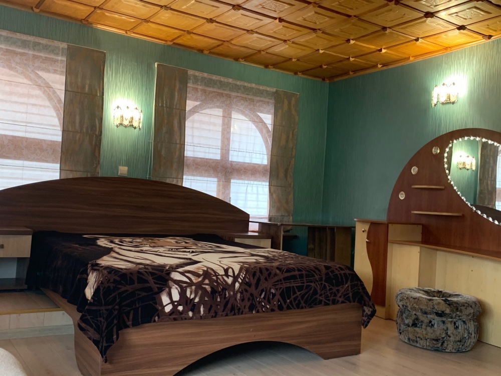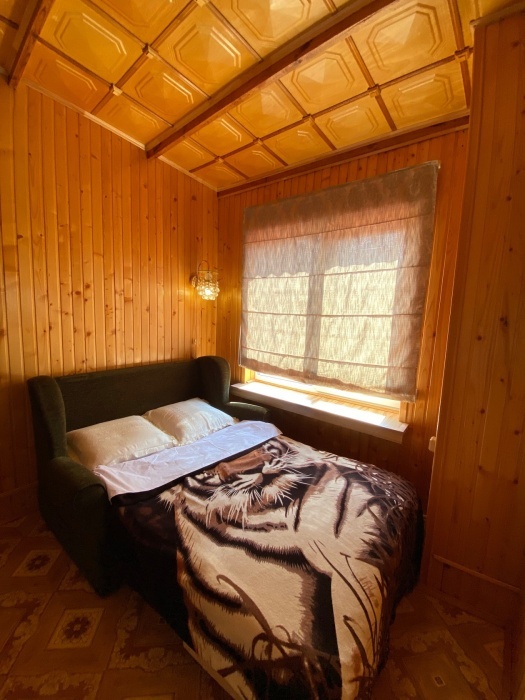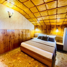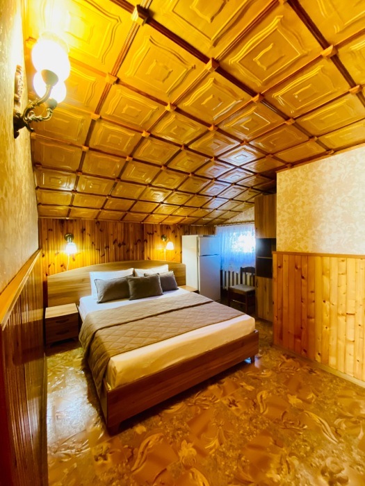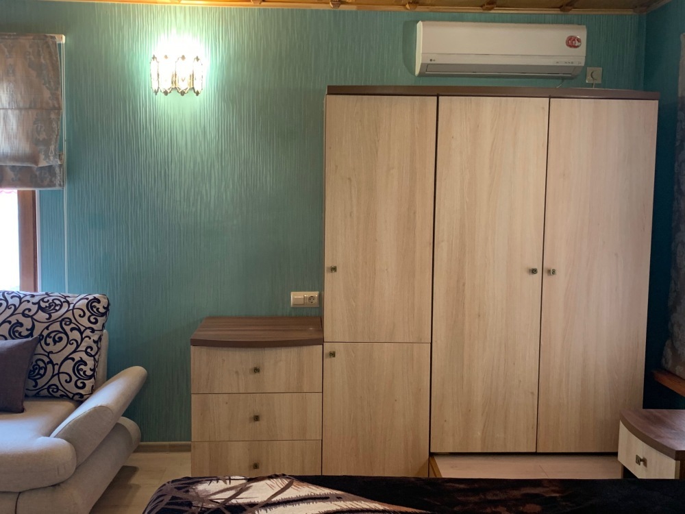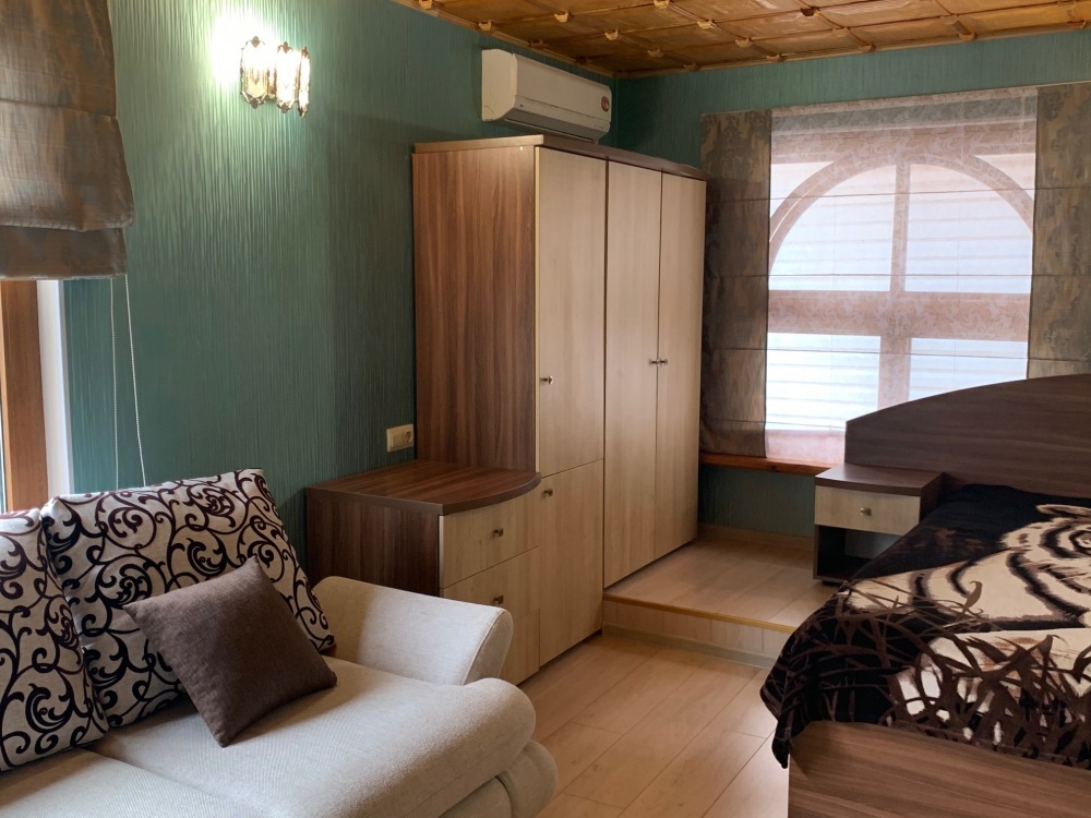 Номер находится на втором этаже, двухэтажного коттеджа. В комнате все условия: кровать двуспальная, диван двуспальный, телевизор, холодильник. кондиционер, утюг, интернет. Кухня в номере: со всей не обходимой посудой. Имеется не большой балкончик.
