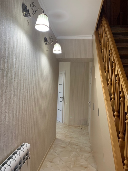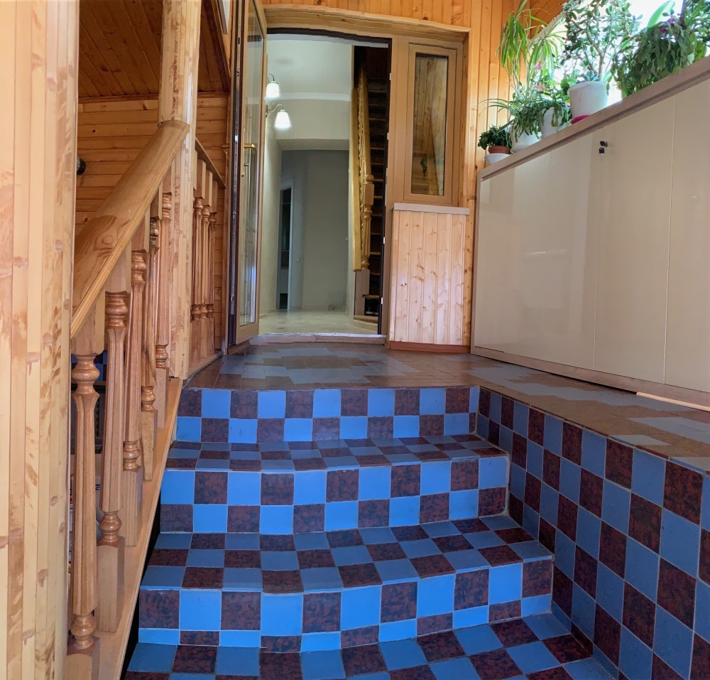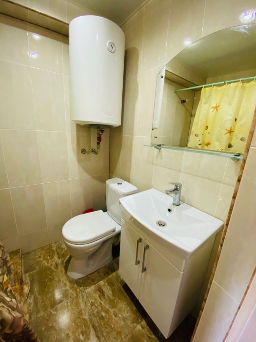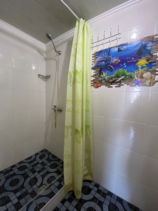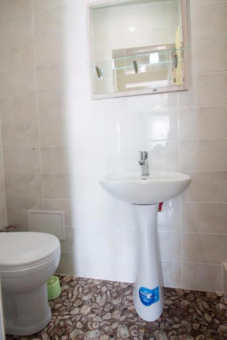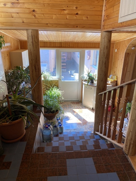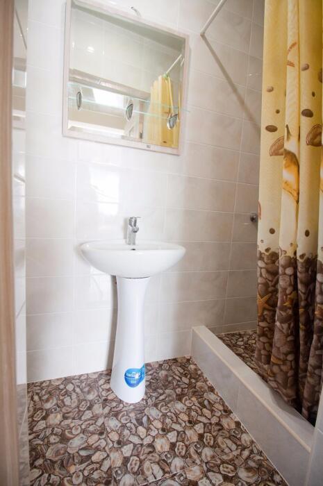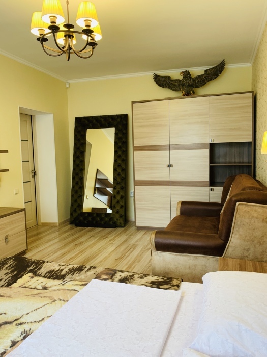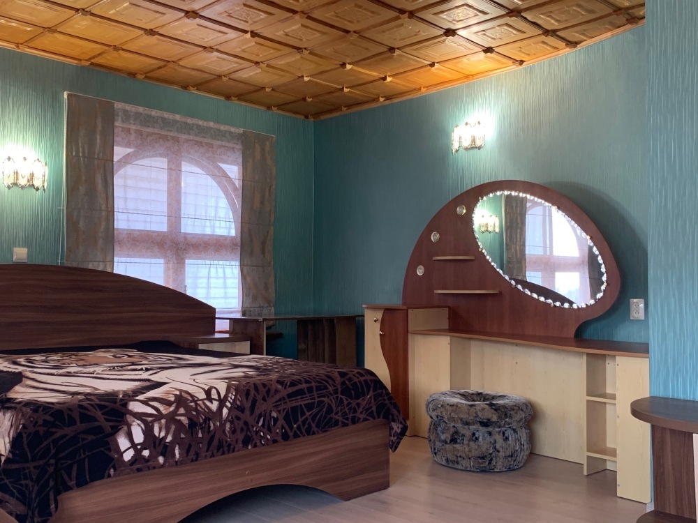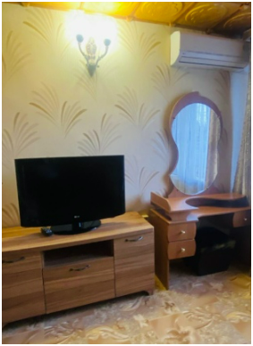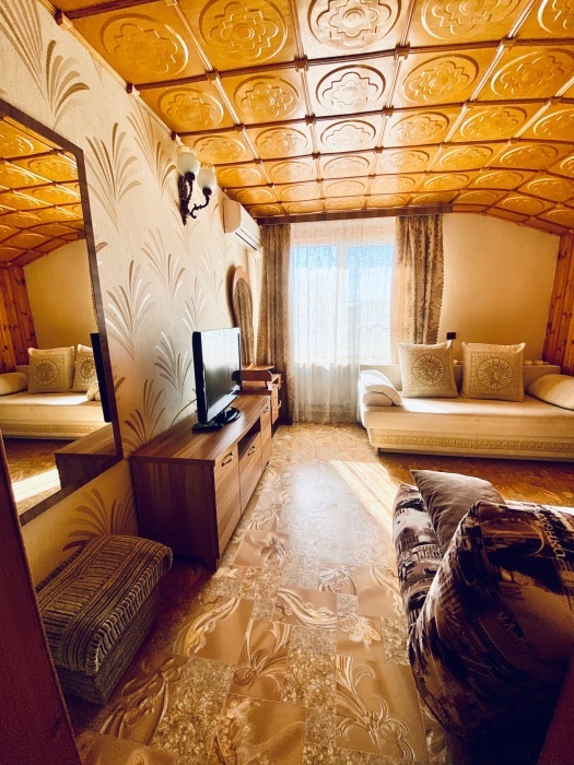В номере: туалет, душ, (вода горячая постоянно), телевизор, кондиционер, интернет. Из мебели: плательный шкаф, мебельная стенка со шкафчиками для белья и рабочим местом для компьютера. Спальные места: двуспальная кровать и двуспальный диван. Окна номера выходят во двор дома. Во дворе мангал и беседка для отдыха. Кухня рядом с номером на две семьи.