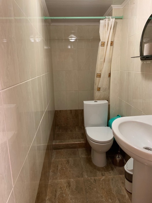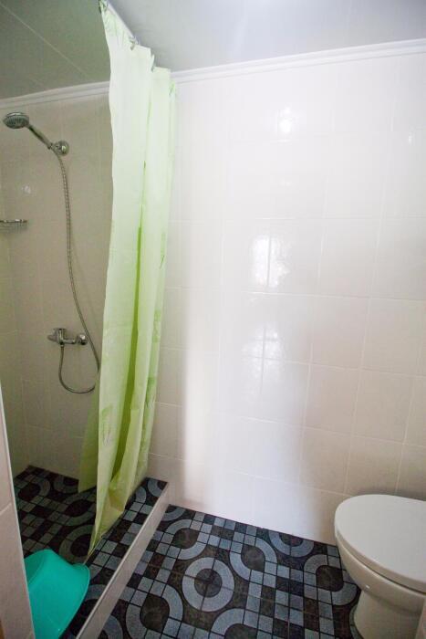 Номер на втором этаже, окна выходят на улицу. Четыре спальных места. Двуспальная кровать и двуспальная кровать-диван. В номере туалет, душ, кондиционер, телевизор, холодильник. Из мебели: плательный шкаф, парфюмерный столик, тумбочка под телевизор, два журнальных столика, стулья. Кухня рядом с номером на три семьи.