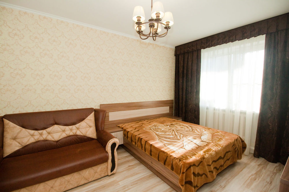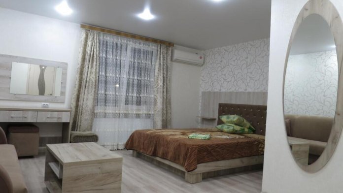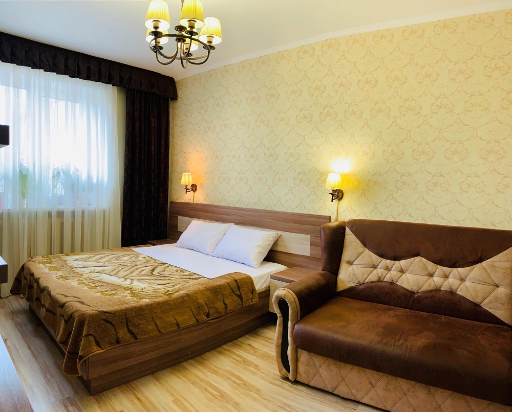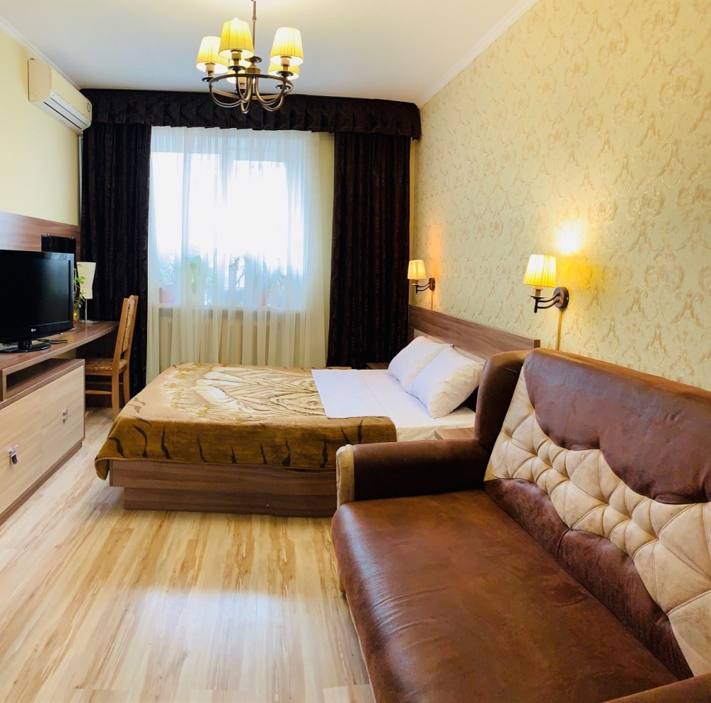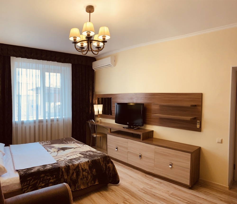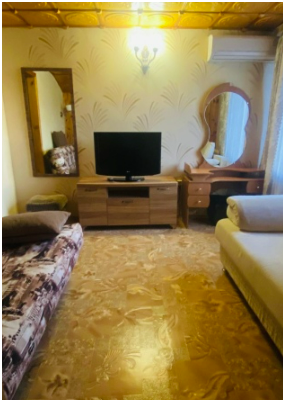 Номер на первом этаже, большое окно выходит на улицу, на окне решетка. Четыре спальных места. Двуспальная кровать и мягкий двуспальный диван. В номере туалет, душевая кабинка. Из техники: кондиционер, телевизор, холодильник утюг. Из мебели: платяной шкаф, парфюмерный столик, тумбочки под телевизор, два журнальных столика, стулья. Кухня в номере: имеет вытяжку, электроплитку, СВЧ-печь, посуда вся не обходимая - для готовки завтраков, обедов, ужинов, электрочайник, столик.