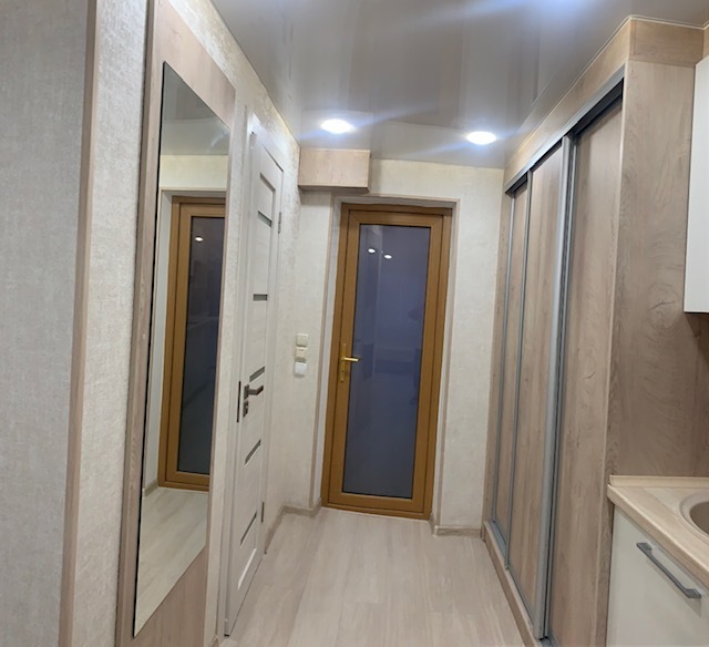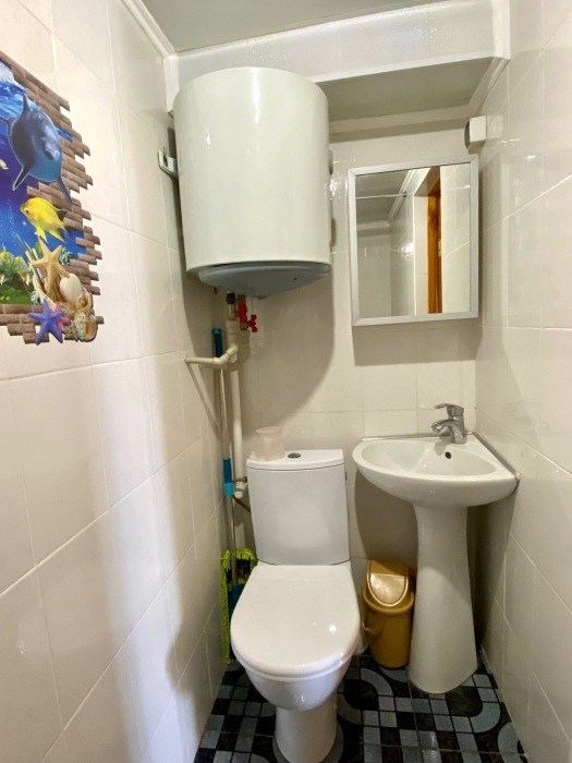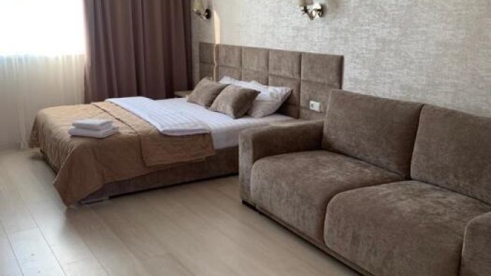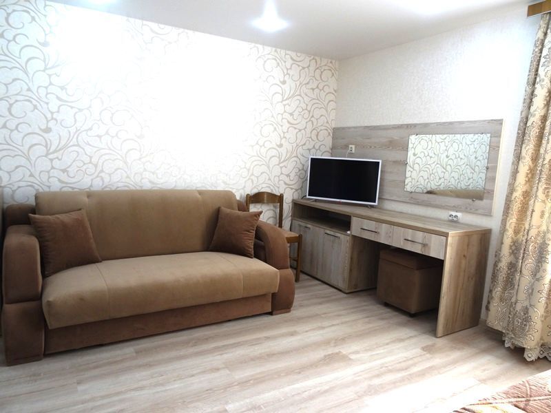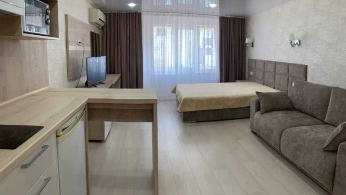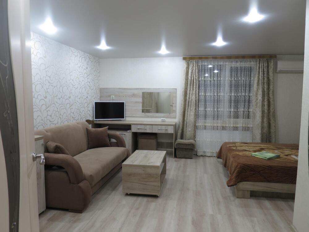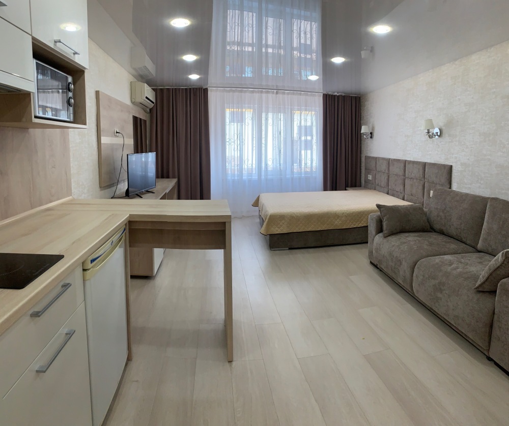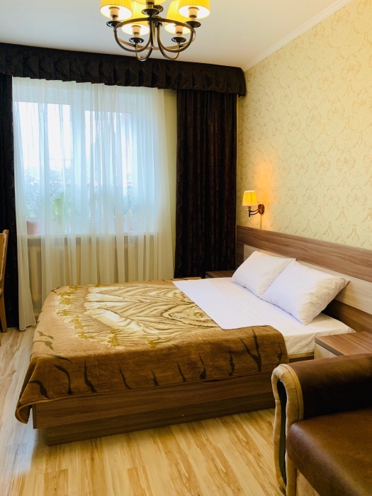 Номер на первом этаже, большое окно выходит на улицу, на окне решетка. Четыре спальных места. Двуспальная кровать и мягкий двуспальный диван. В номере туалет, душевая кабинка. Из техники: кондиционер, телевизор, холодильник утюг. Из мебели: платяной шкаф, парфюмерный столик, тумбочки под телевизор, два журнальных столика, стулья. Кухня в номере: имеет вытяжку, электроплитку, СВЧ-печь, посуда вся не обходимая - для готовки завтраков, обедов, ужинов, электрочайник, столик.