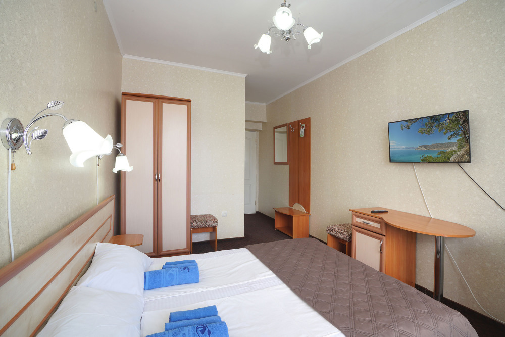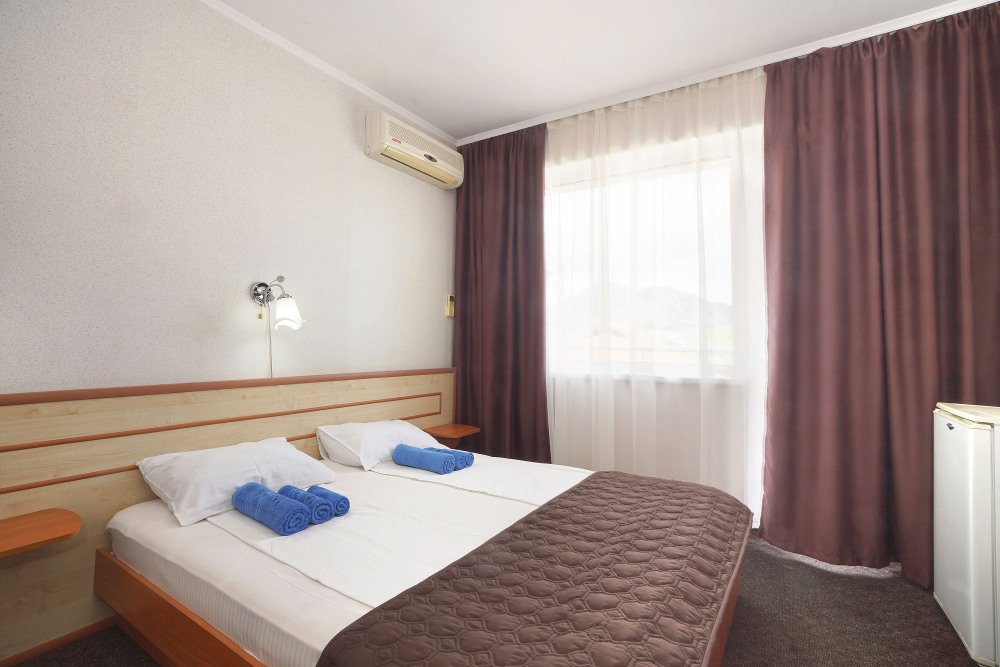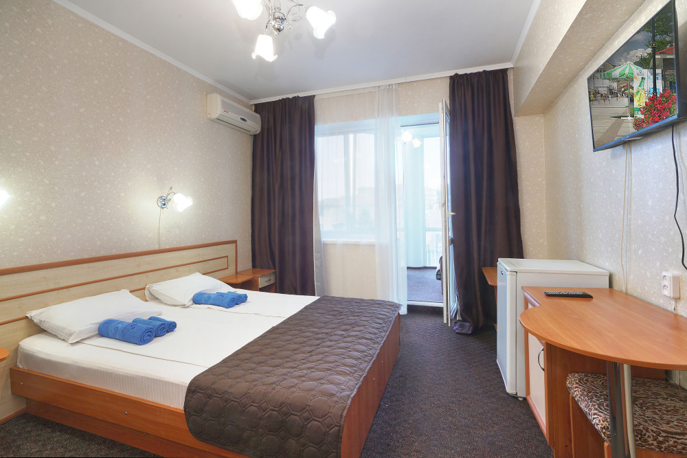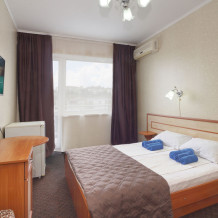 Однокомнатный номер общей площадью 18 кв. м. , оформленный в традиционном стиле. В номере есть все необходимое для комфортного проживания: двуспальная кровать (или две односпальные) с удобным матрасом, балкон, шкаф для хранения одежды, прикроватные тумбы, холодильник, ЖК-телевизор, сплит-система, собственная ванная комната с душевой кабиной и туалетными принадлежностями, набор для приготовления чая/кофе. Вид из номера на город и горы. Номера расположены на 3, 4 и 5 этажах.
