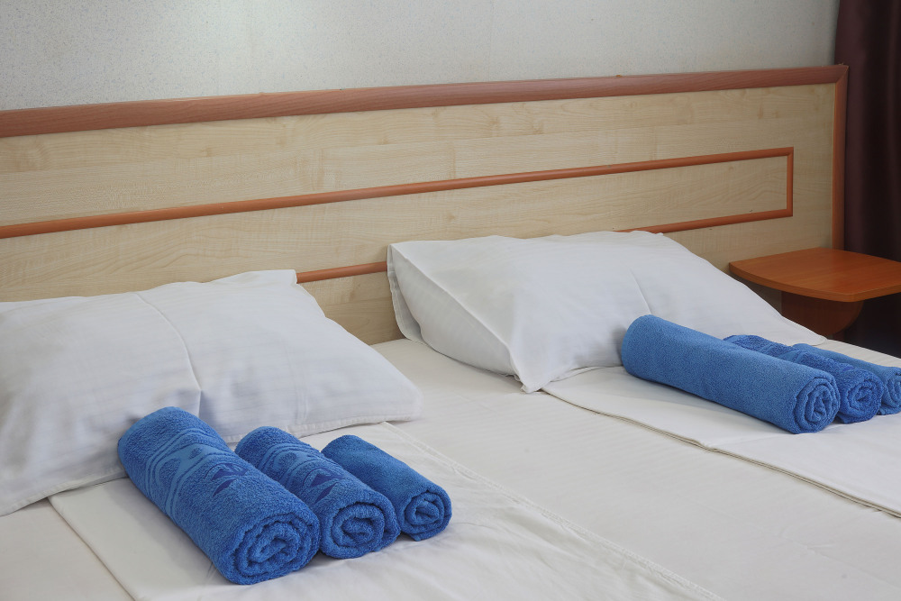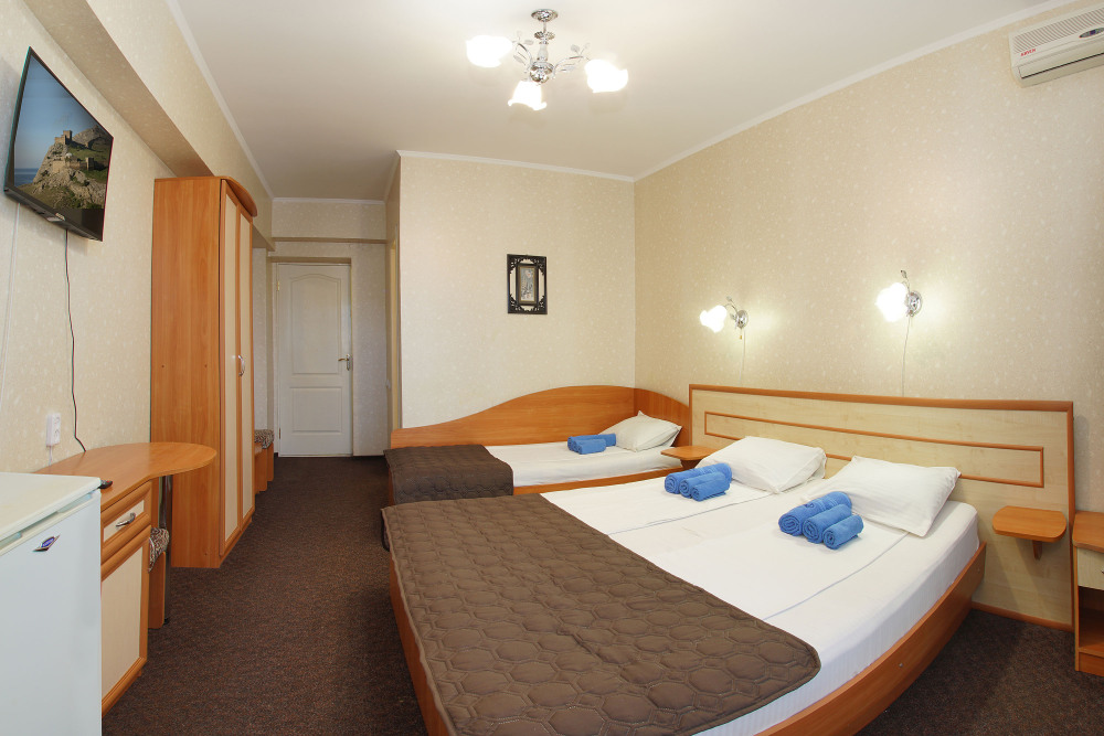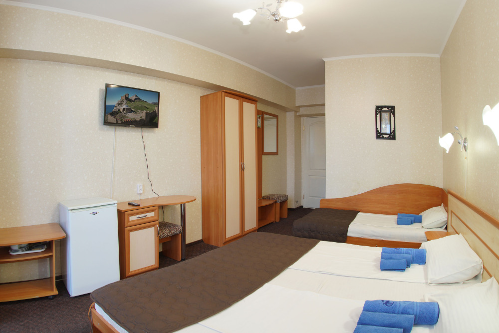 Однокомнатный номер общей площадью 20 кв.м., оформленный в традиционном стиле. В номере есть все необходимое для комфортного проживания: двуспальная кровать и односпальная (или три односпальные) с удобным матрасом, балкон, шкаф для хранения одежды, прикроватные тумбы, холодильник, ЖК-телевизор, сплит-система, собственная ванная комната с душевой кабиной и туалетными принадлежностями, набор для приготовления чая/кофе. Вид из номера на город и горы. Номера расположены на 3, 4 и 5 этажах.
