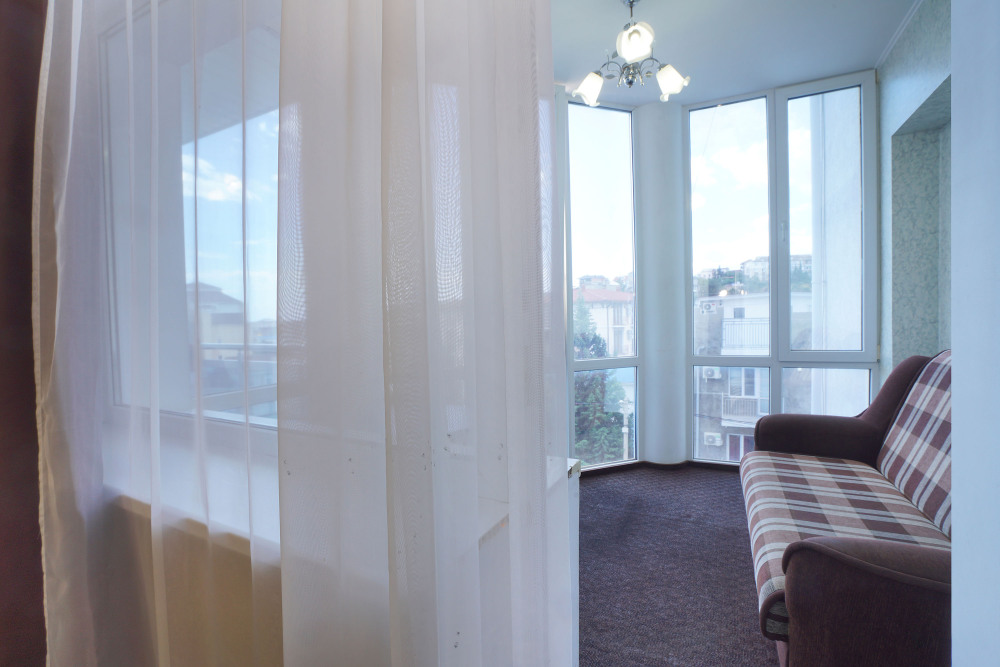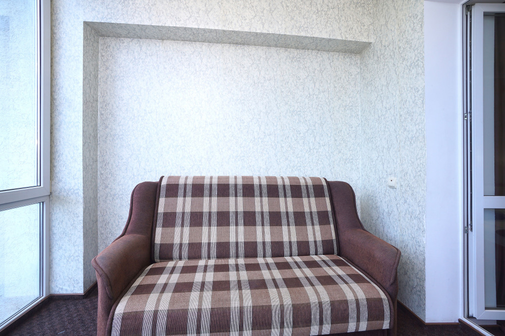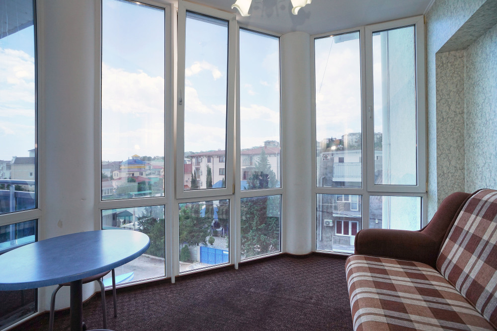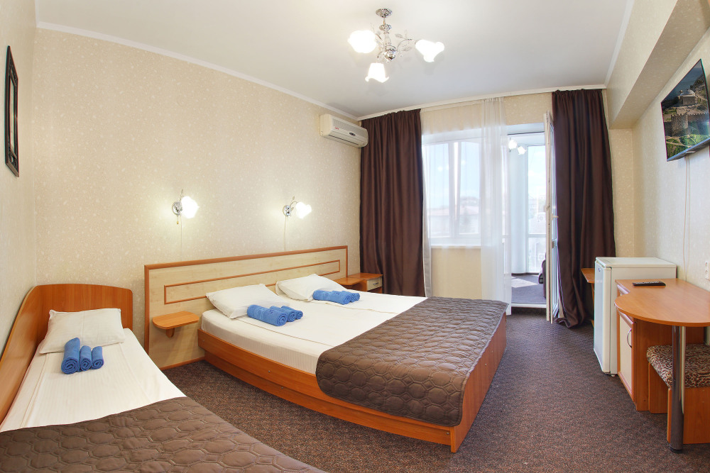 Двухкомнатный номер общей площадью 25 кв.м., оформленный в традиционном стиле. В основной комнате двуспальная кровать и односпальная кровать. На лоджии с панорамными окнами расположен раскладной двуспальный диван. В номере есть все необходимое для комфортного проживания: тумба для размещения багажа, шкаф для хранения одежды, прикроватные тумбы, холодильник, ЖК-телевизор, письменный стол, сплит-система, собственная ванная комната с душевой кабиной и туалетными принадлежностями, набор для приготовления чая/кофе. Вид из номера на город и горы. Номера расположены на 3, 4 и 5 этажах