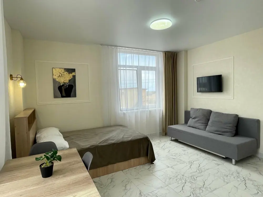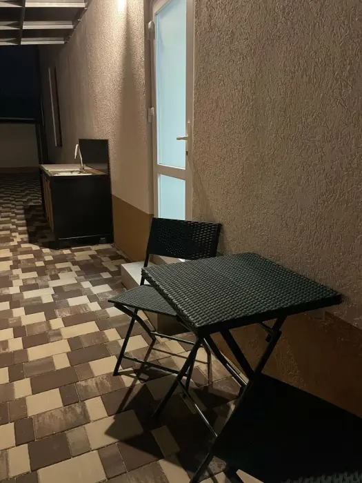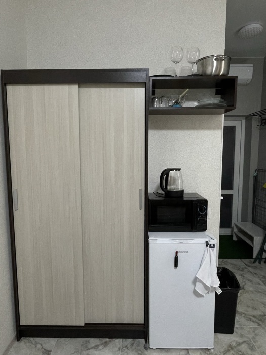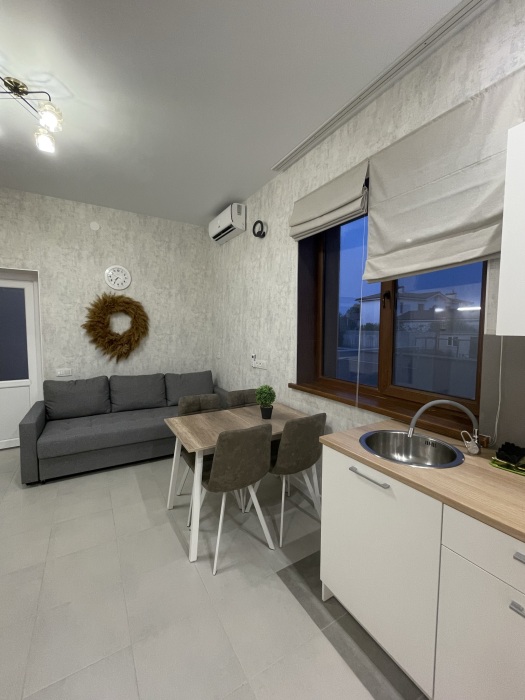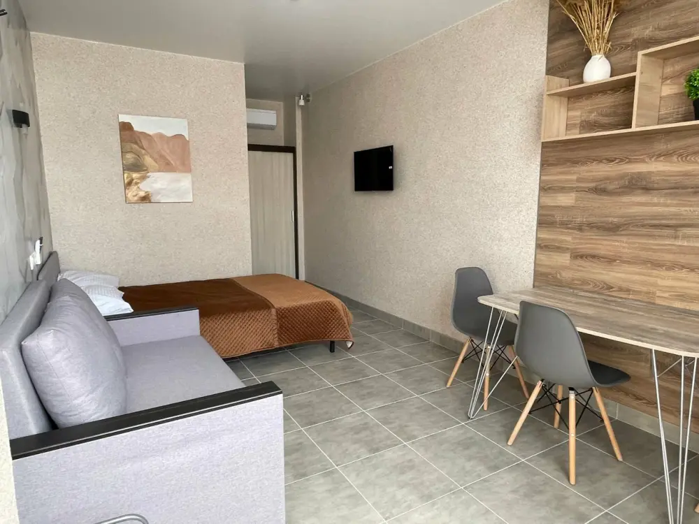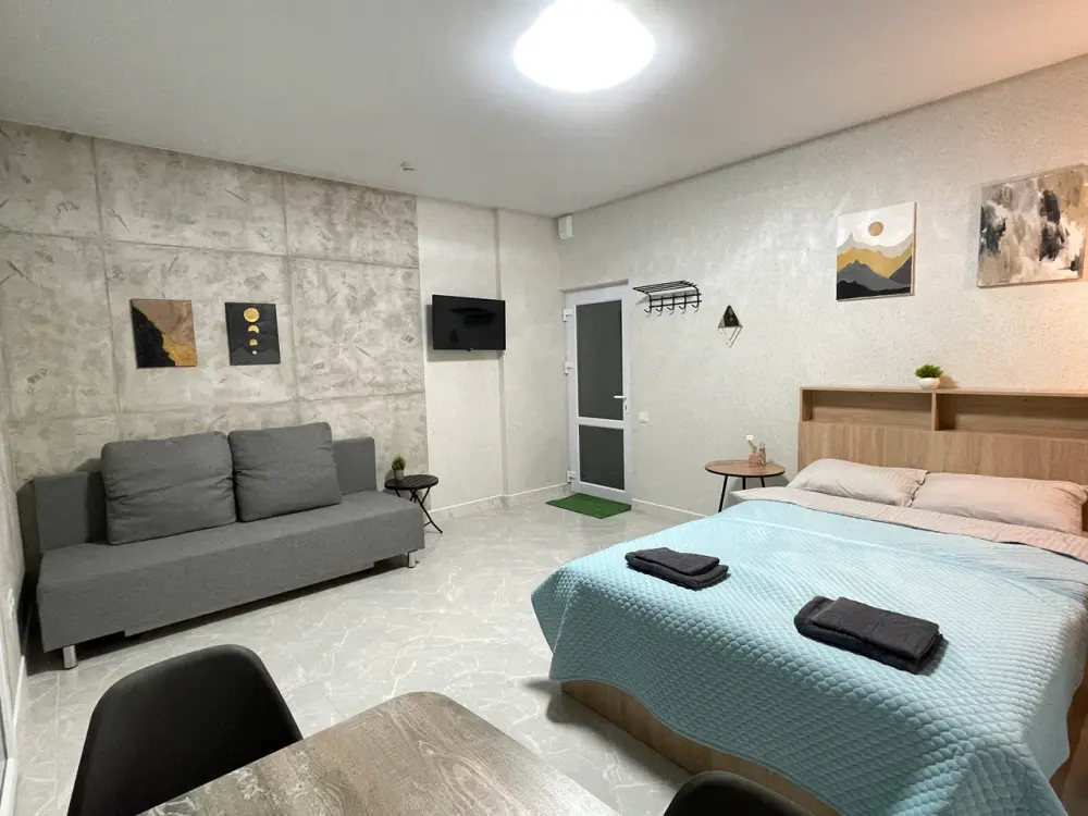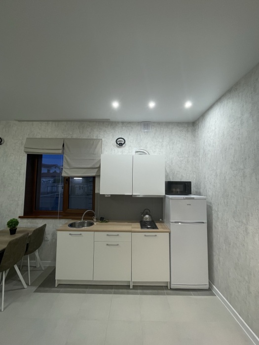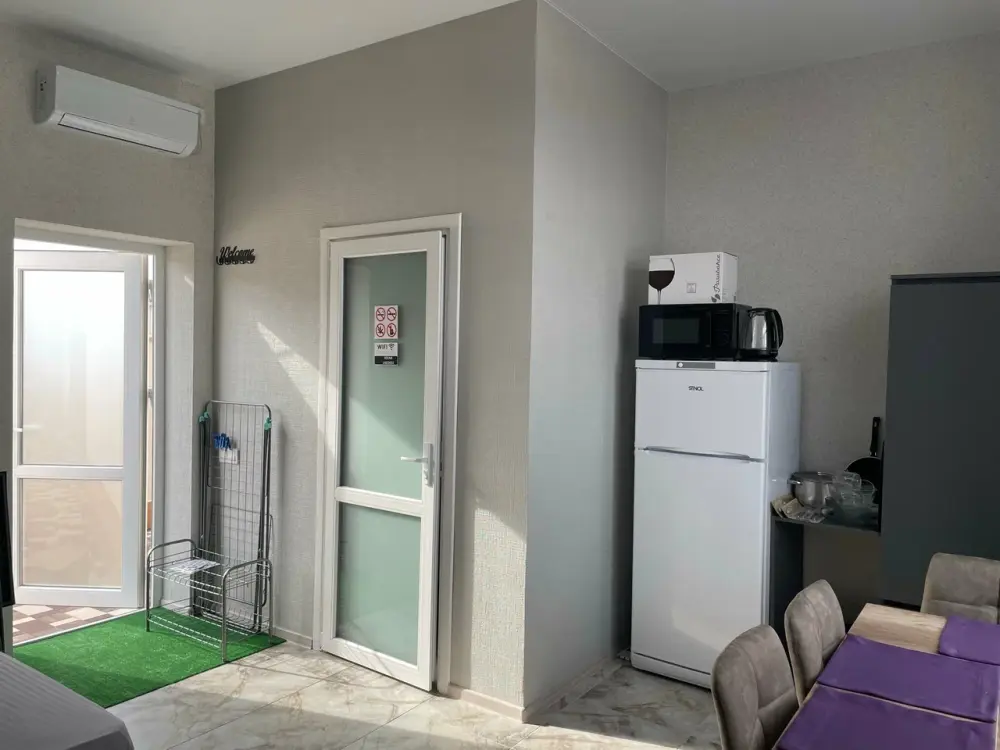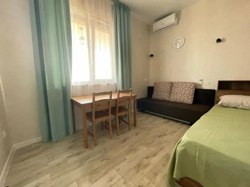 Большая кровать 140х200, двуспальный диван, шкаф, стол, стулья, холодильник, микроволновая печь, чайник. Постельное бельё, банные принадлежности. Бесплатно подогреваемый бассейн, шезлонги, беседка. Стирка, сушка, утюг. Парковка с видеонаблюдением. Хаммам и баня на территории за доп. плату.