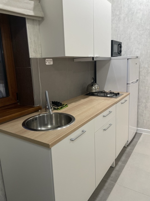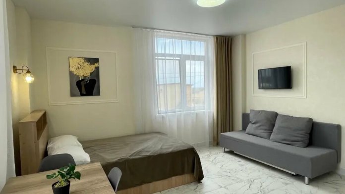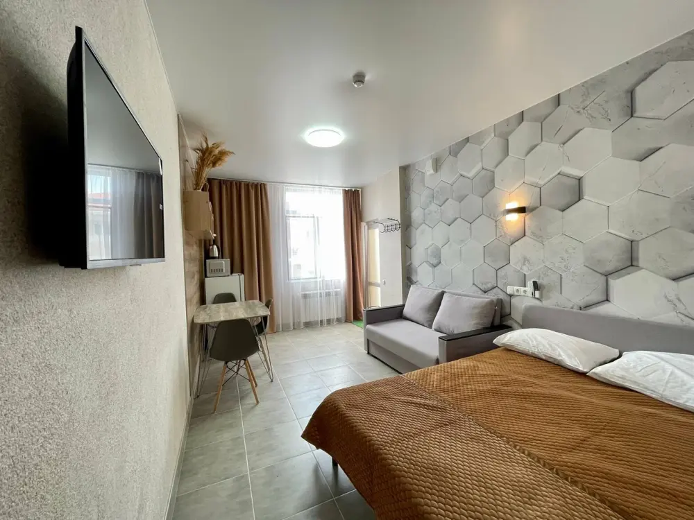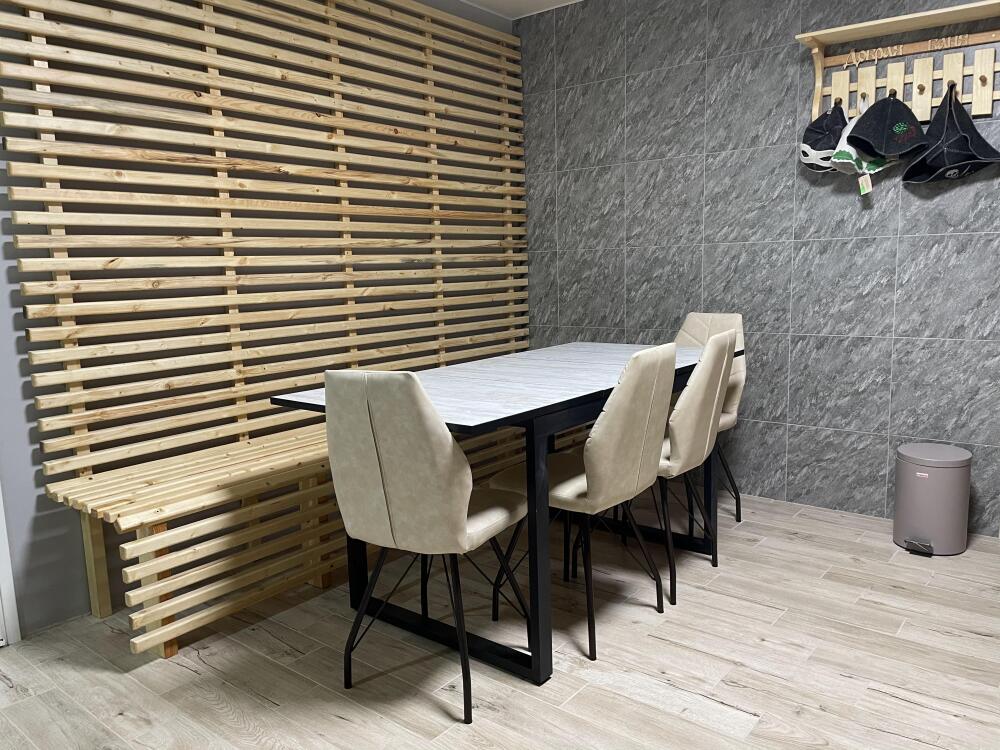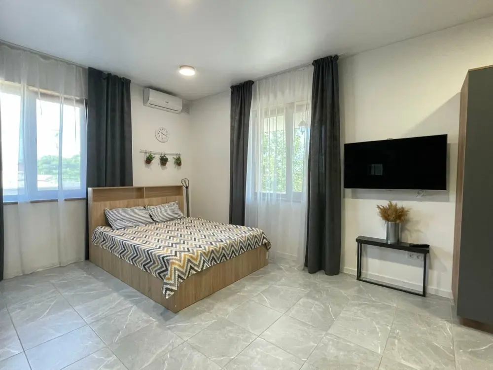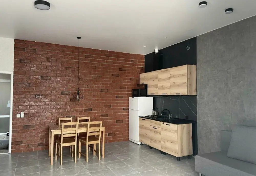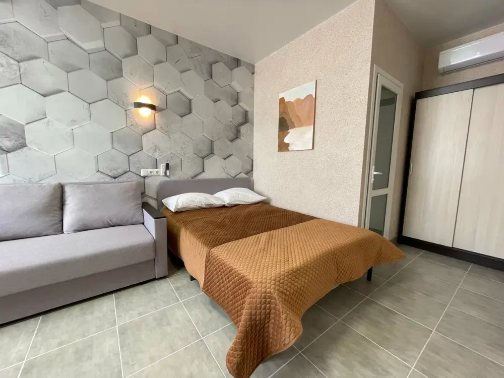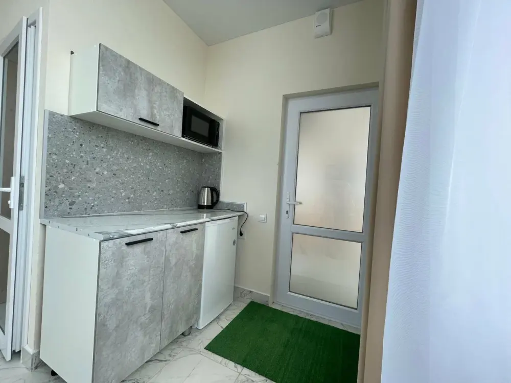 Большая кровать 140х200, двуспальный диван, шкаф, стол, стулья, холодильник, микроволновая печь, чайник. Постельное бельё, банные принадлежности. Бесплатно подогреваемый бассейн, шезлонги, беседка. Стирка, сушка, утюг. Парковка с видеонаблюдением. Хаммам и баня на территории за доп. плату.