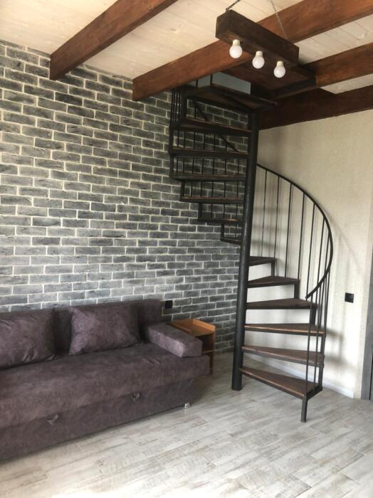Двухуровневый вариант размещения, 1 этаж -гостиная совмещена с кухней и отдельно санузел, 2 этаж -две спальни и балкон,до 7 спальных мест.