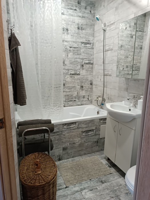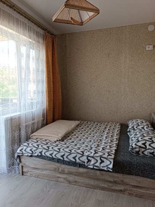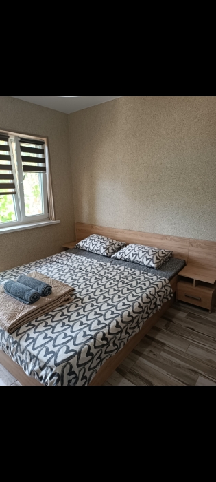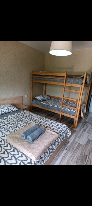 Двухуровневый номер, 1 этаж -гостиная совмещена с кухней и отдельно санузел, 2 этаж -две изолированные спальни и балкон,6 спальных мест, возможность доп. места.