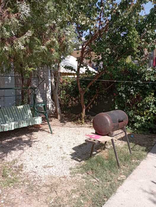 Небольшая и уютная территория хорошо подходит для отдыха с детьми и без, на территории зеленый двор, цветы, туи, можжевельник, есть мангал, общая кухня с посудой, газовая плита, большой холодильник, беседка с детскими игрушками, качеля. Парковка во дворе и рядом с домом, улица не проездная, есть видеонаблюдение.