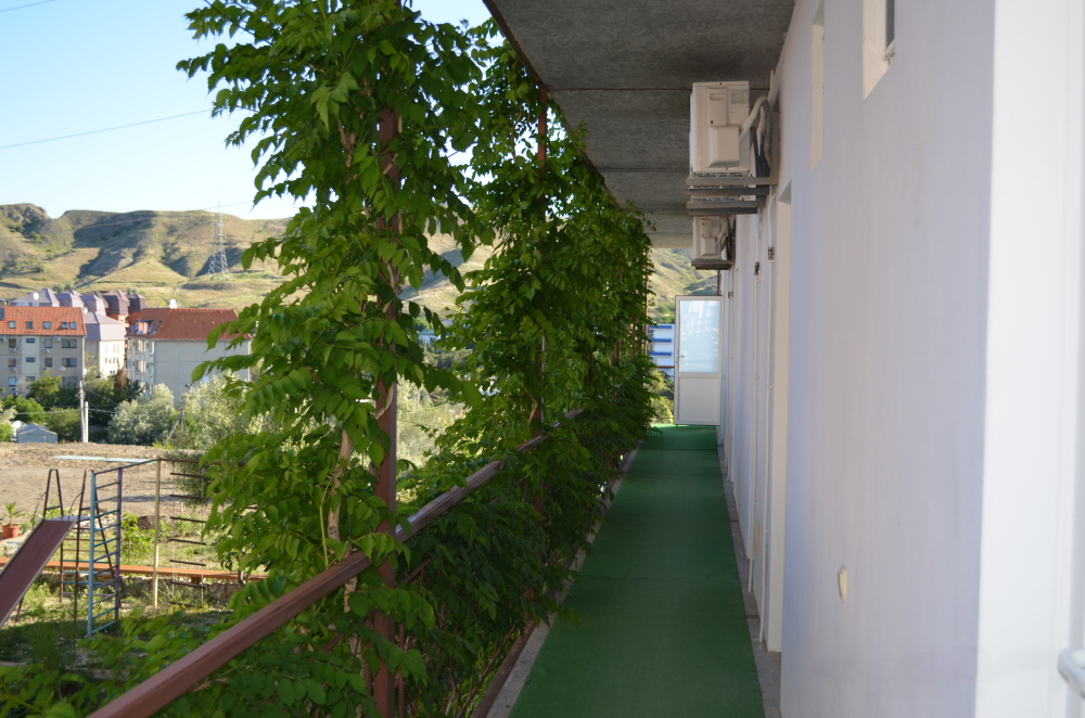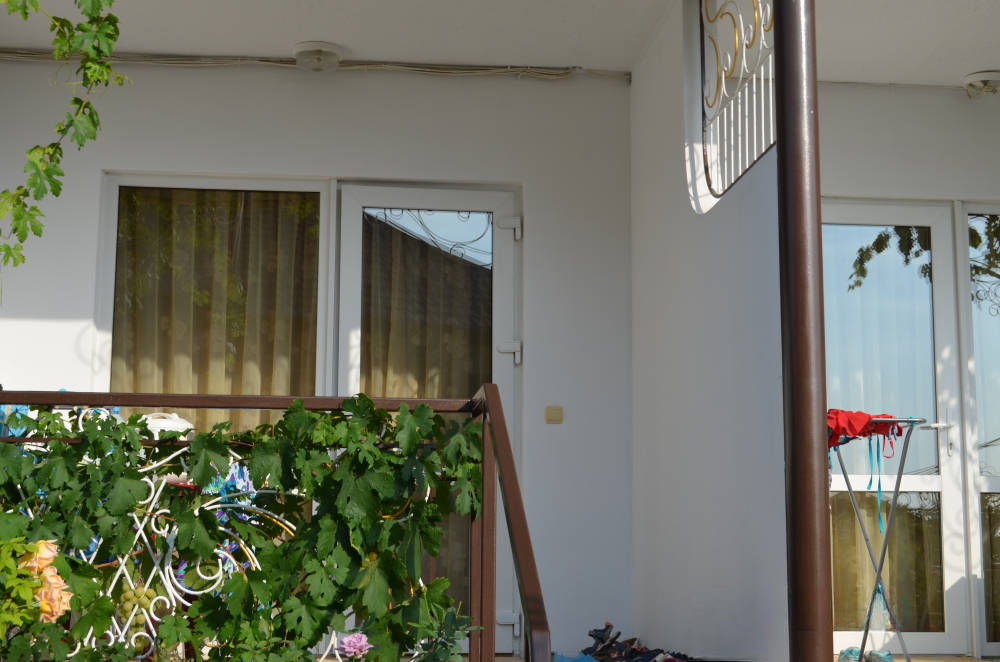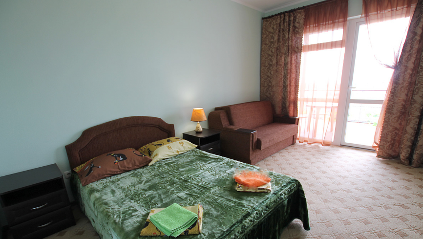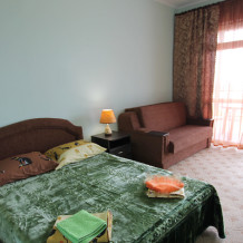В номере большой балкон на 2 комнаты, увитый виноградом, где Вы можете отдохнуть и покушать в тени. Большая комната обставлена двуспальной кроватью, диваном, есть прикроватные тумбочки, прихожая и вешалка, в меньшей комнате 2 односпальные кровати, комод, зеркало, раковина.