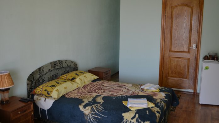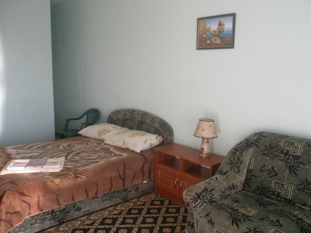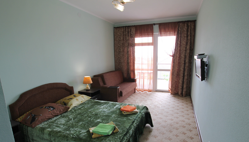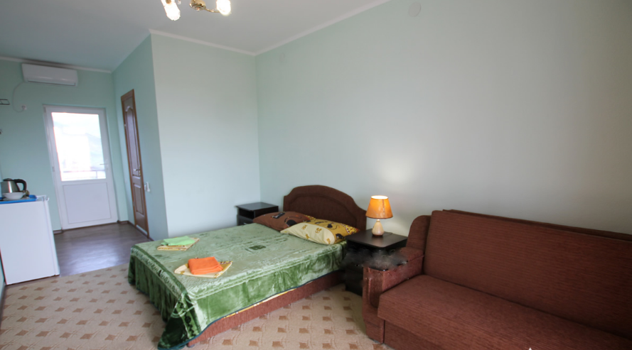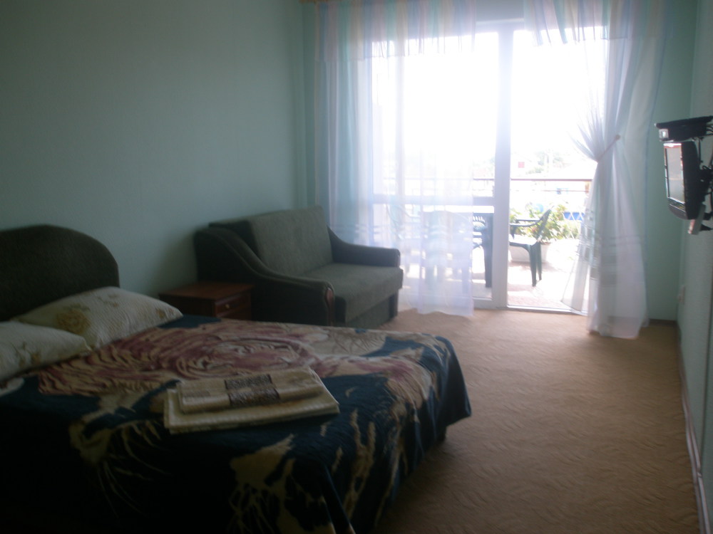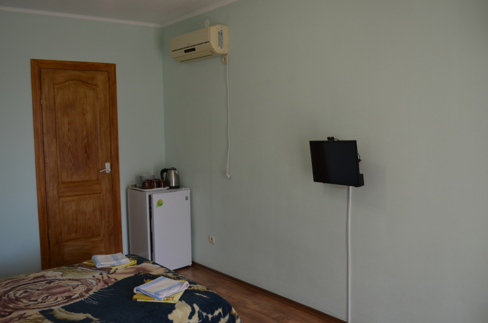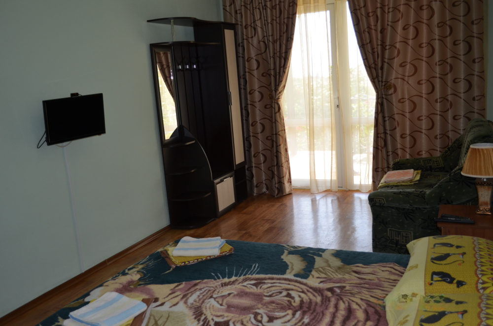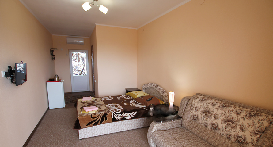 В однокомнатном номере есть большой балкон, увитый виноградом, где Вы можете отдохнуть и покушать в тени. Мягкая мебель: двуспальная кровать и диван. Прикроватные тумбочки. Красивое постельное белье, полотенца, посуда. Бытовая техника: кондиционер, холодильник, бойлер, ж/к телевизор, спутниковое ТВ, электрочайник, интернет wi-fi. Санузел: душ, раковина, унитаз. Холодная и горячая вода круглосуточно. Туалетные принадлежности: мыло, бумага.