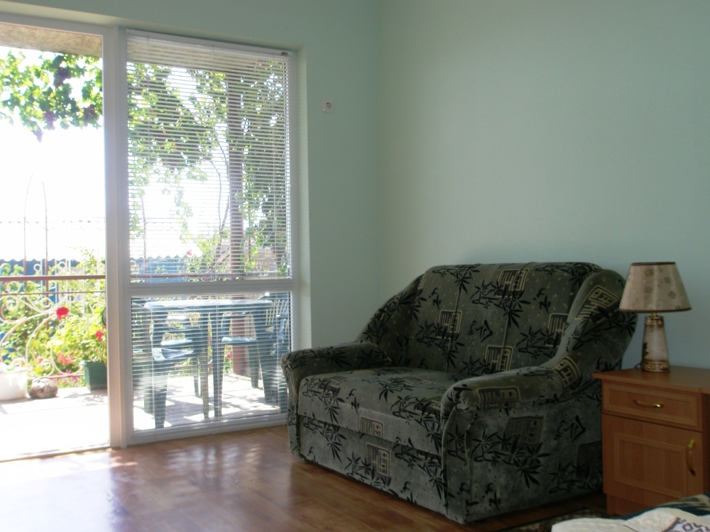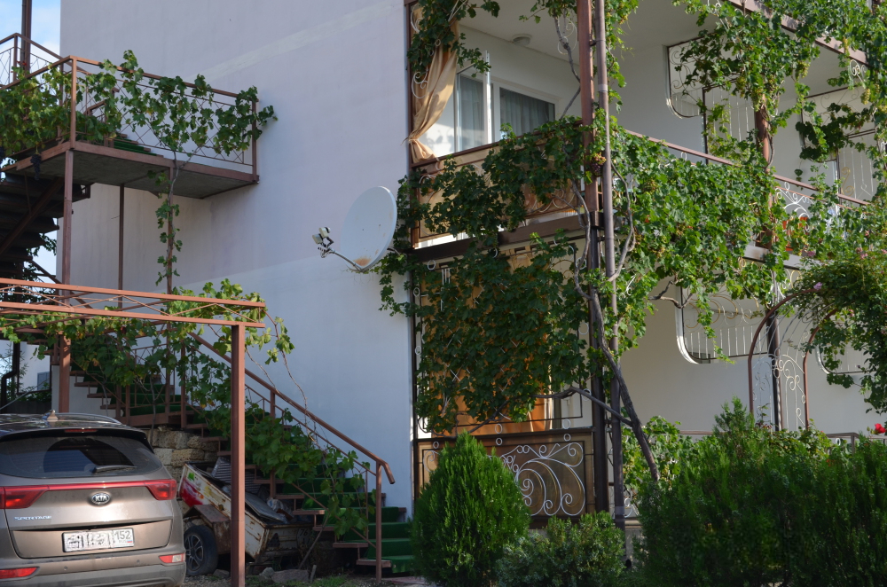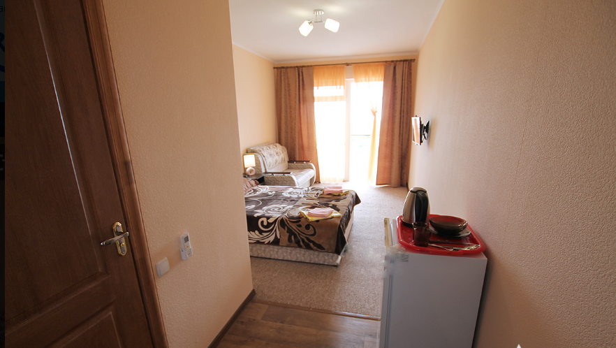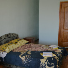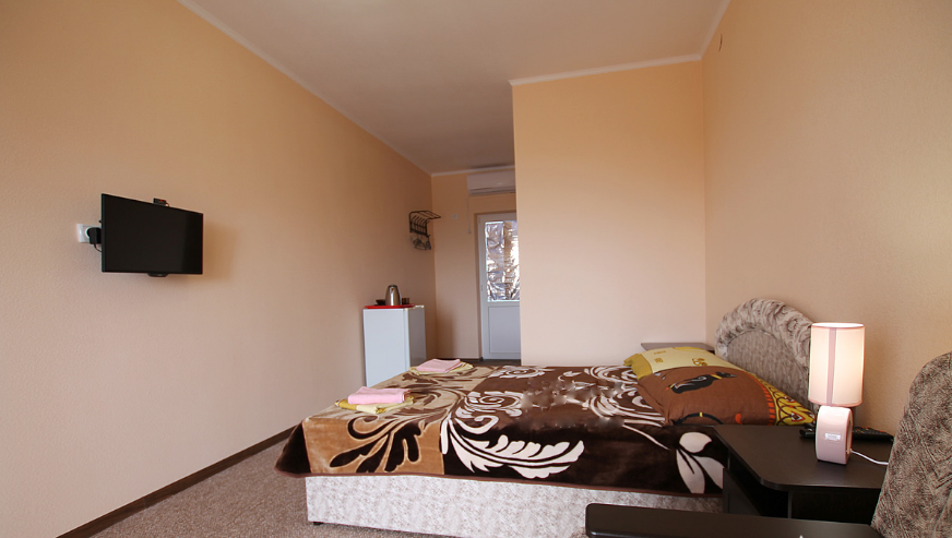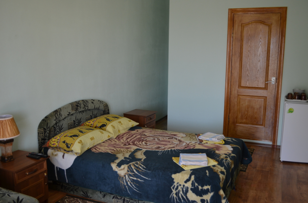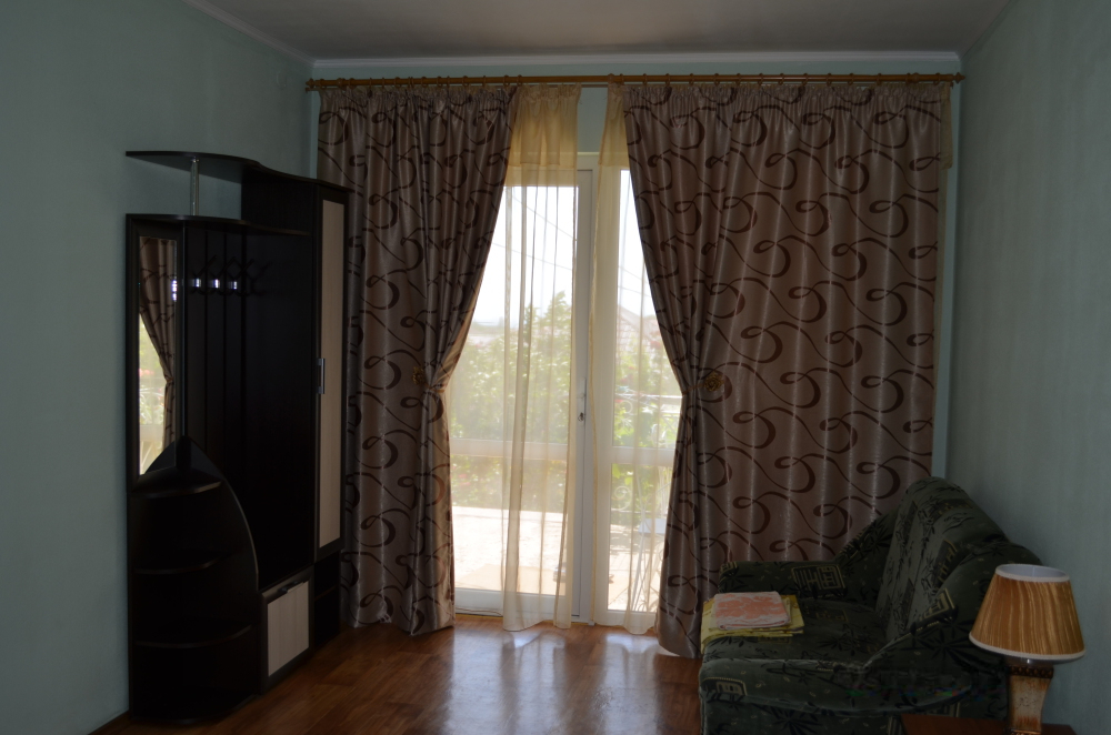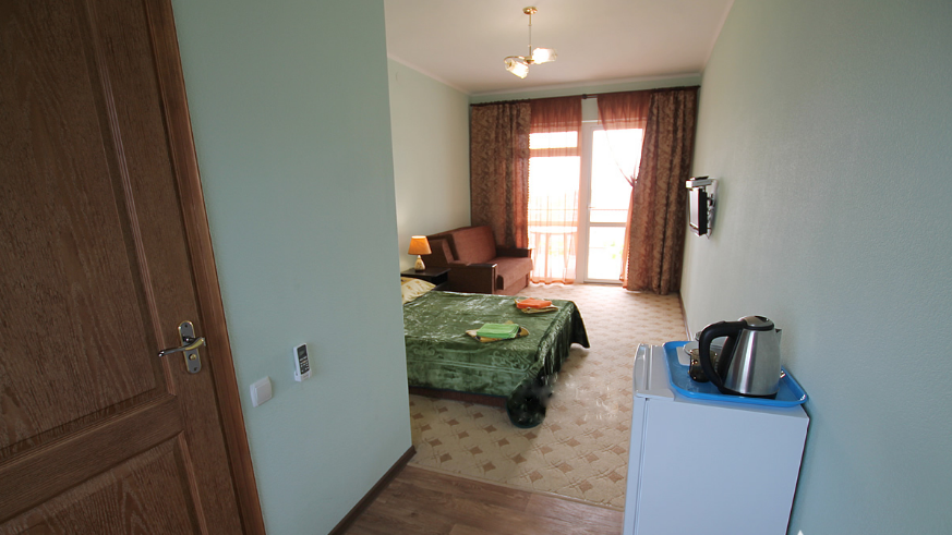 В однокомнатном номере есть большой балкон, увитый виноградом, где Вы можете отдохнуть и покушать в тени. Мягкая мебель: двуспальная кровать и диван. Прикроватные тумбочки. Красивое постельное белье, полотенца, посуда. Бытовая техника: кондиционер, холодильник, бойлер, ж/к телевизор, спутниковое ТВ, электрочайник, интернет wi-fi. Санузел: душ, раковина, унитаз. Холодная и горячая вода круглосуточно. Туалетные принадлежности: мыло, бумага.