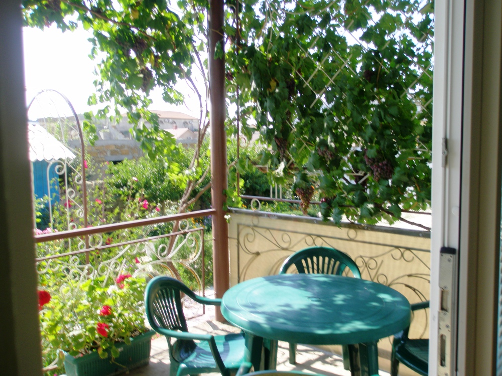 В номере есть большой балкон, увитый виноградом, где Вы можете отдохнуть и покушать в тени. Мягкая мебель: двуспальная кровать и диван. Прикроватные тумбочки. Красивое постельное белье, полотенца, посуда.