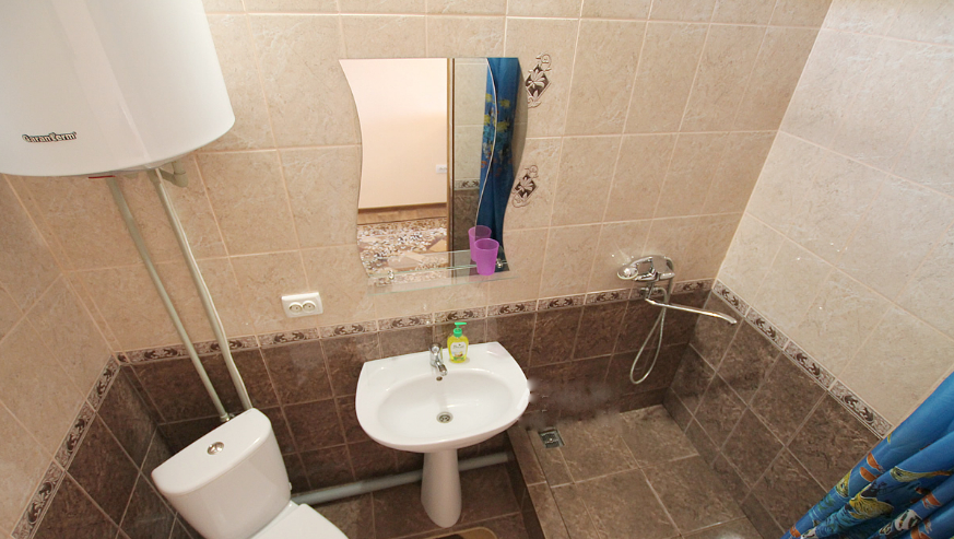 Санузел: душ, раковина, унитаз. Холодная и горячая вода круглосуточно. Туалетные принадлежности: мыло, бумага.