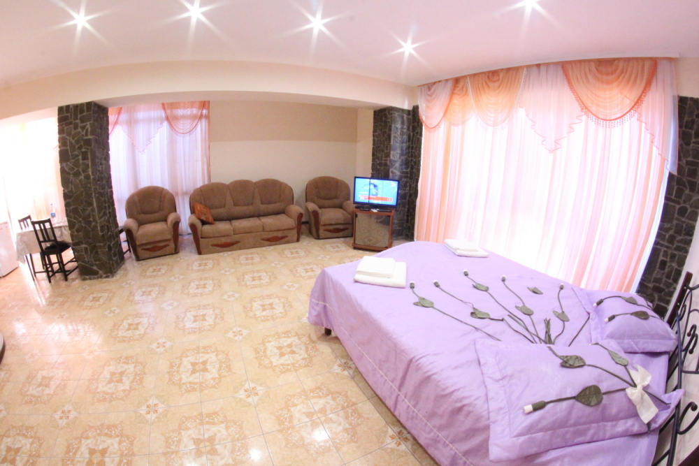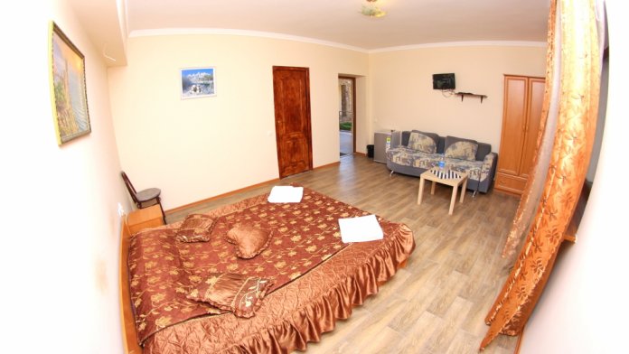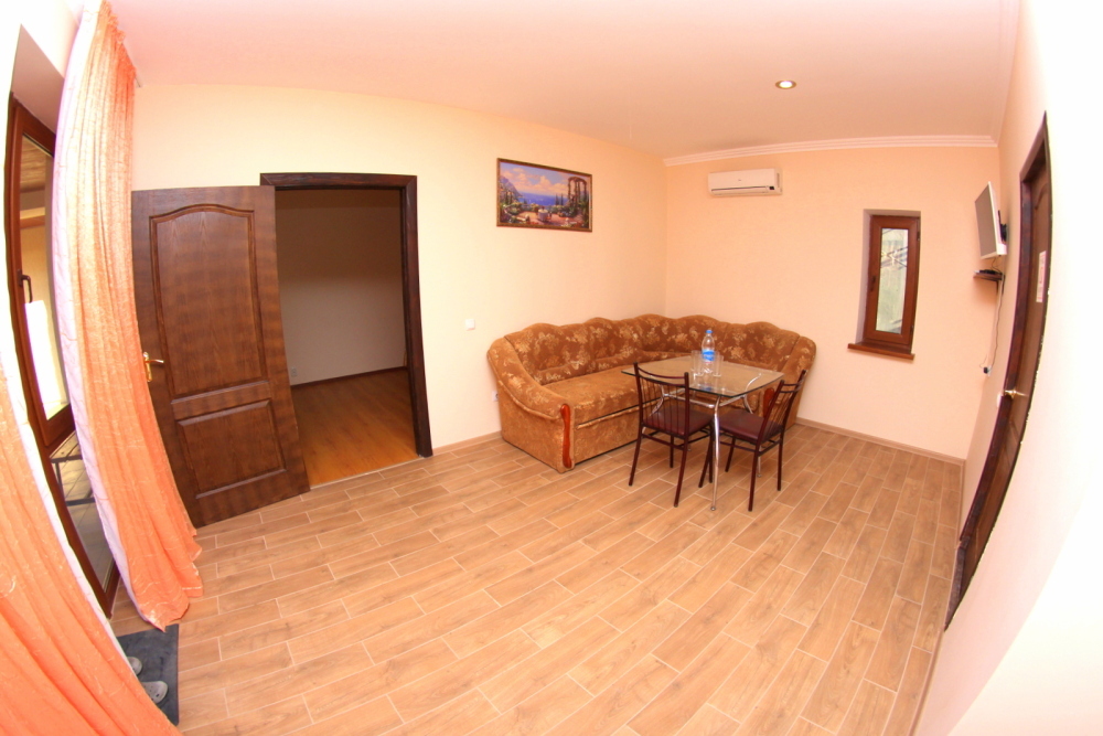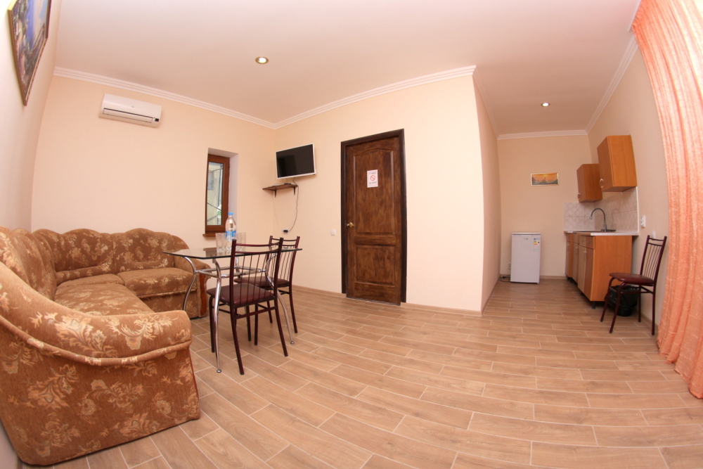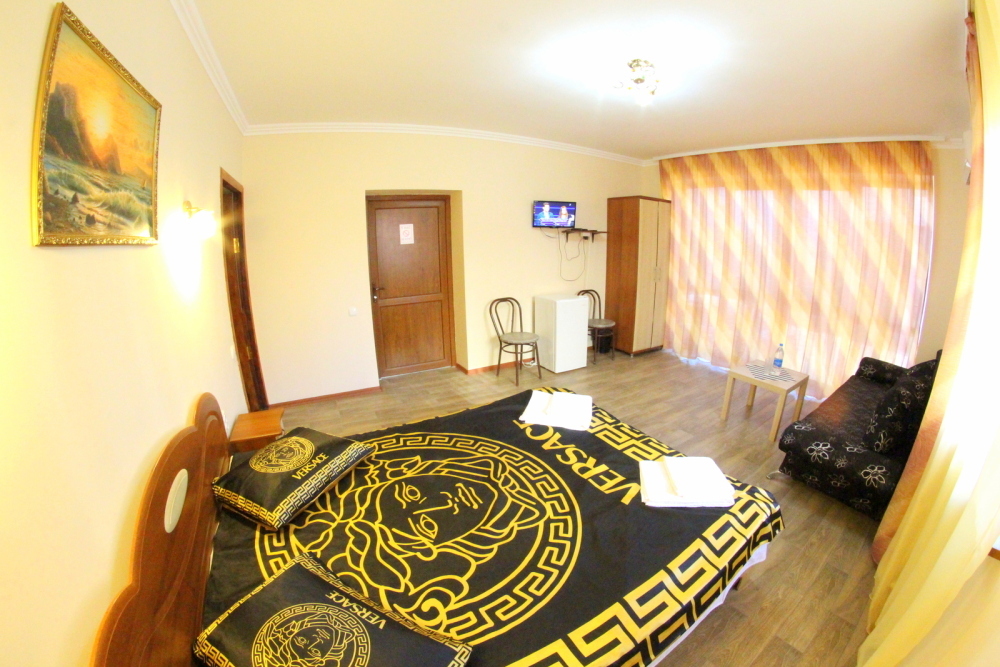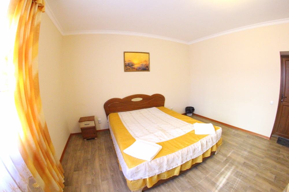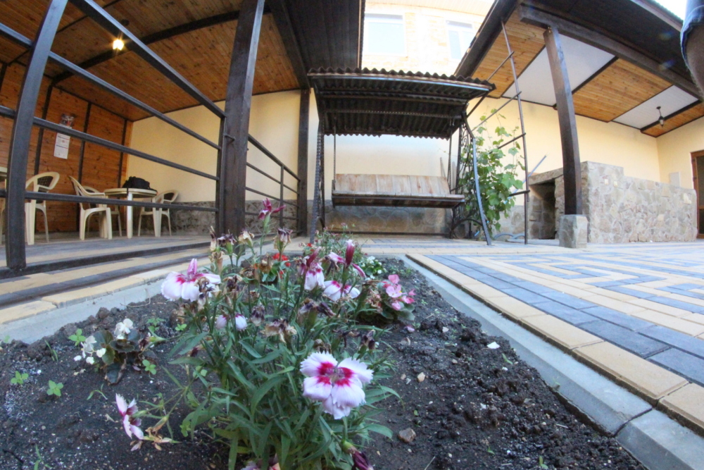 Во дворе отдельная кухня, мангальная зона и бассейн. В каждом номере свой отдельный санузел с душем, телевизором, кондиционером и холодильником. Бесплатный интернет Wi-Fi, трансфер. Пляж и центральная набережная расположены в 800 метрах от гостевого дома.