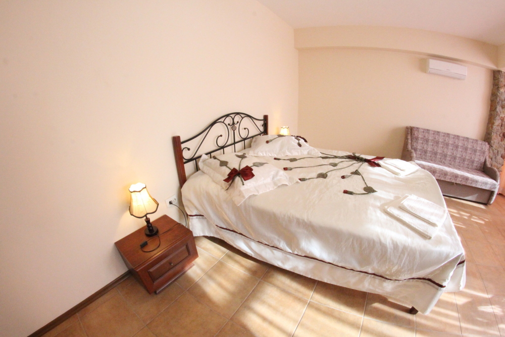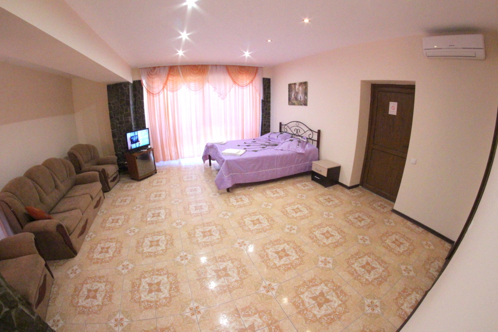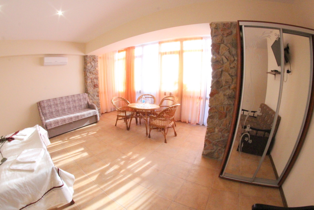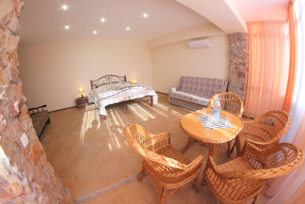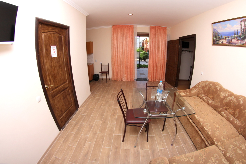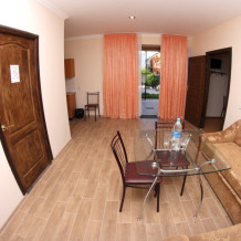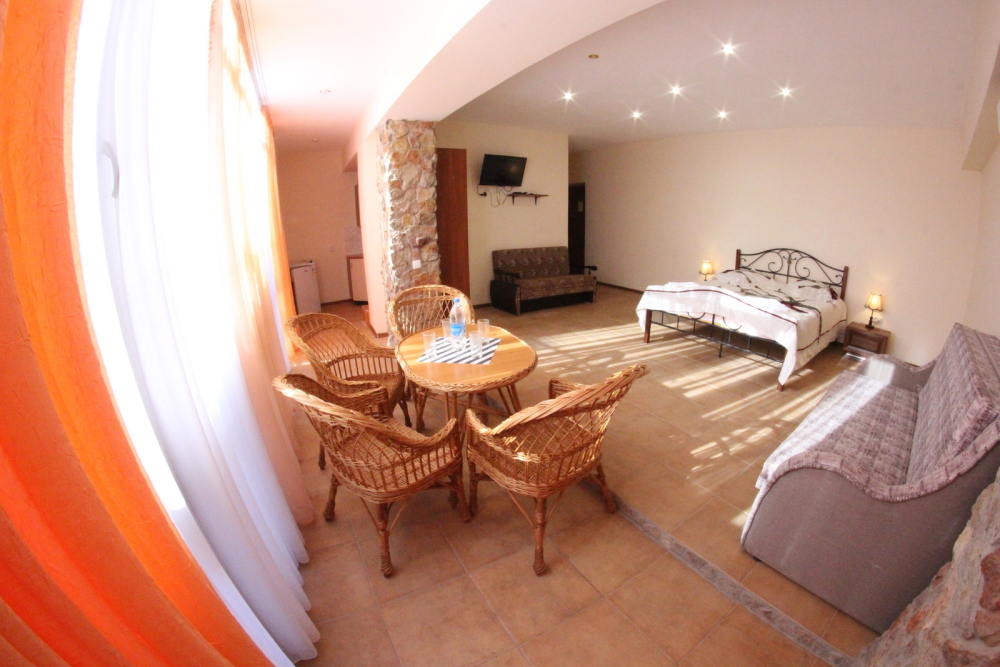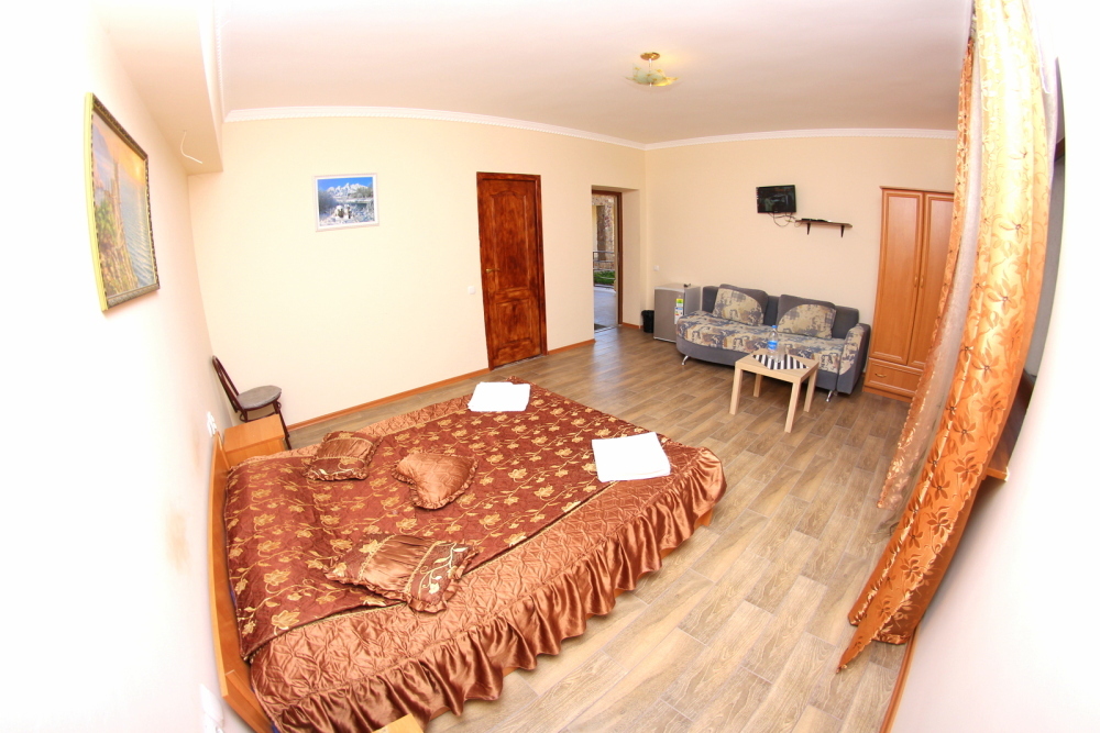 Во дворе отдельная кухня, мангальная зона и бассейн. В каждом номере свой отдельный санузел с душем, телевизором, кондиционером и холодильником. Бесплатный интернет Wi-Fi, трансфер. Пляж и центральная набережная расположены в 800 метрах от гостевого дома.