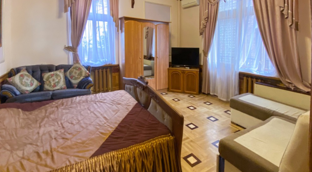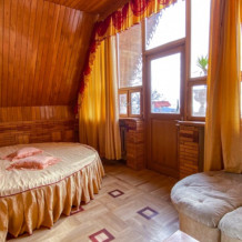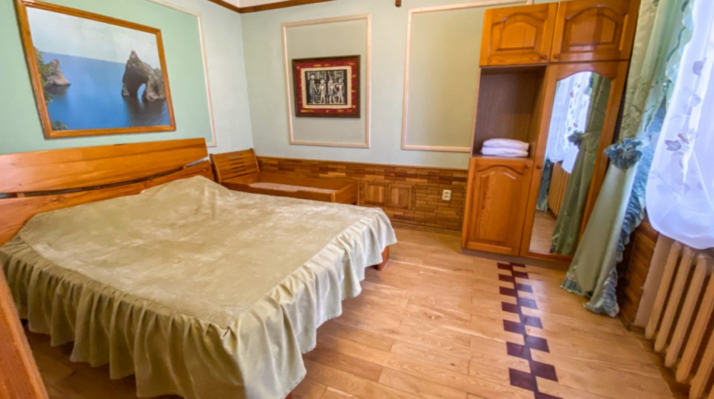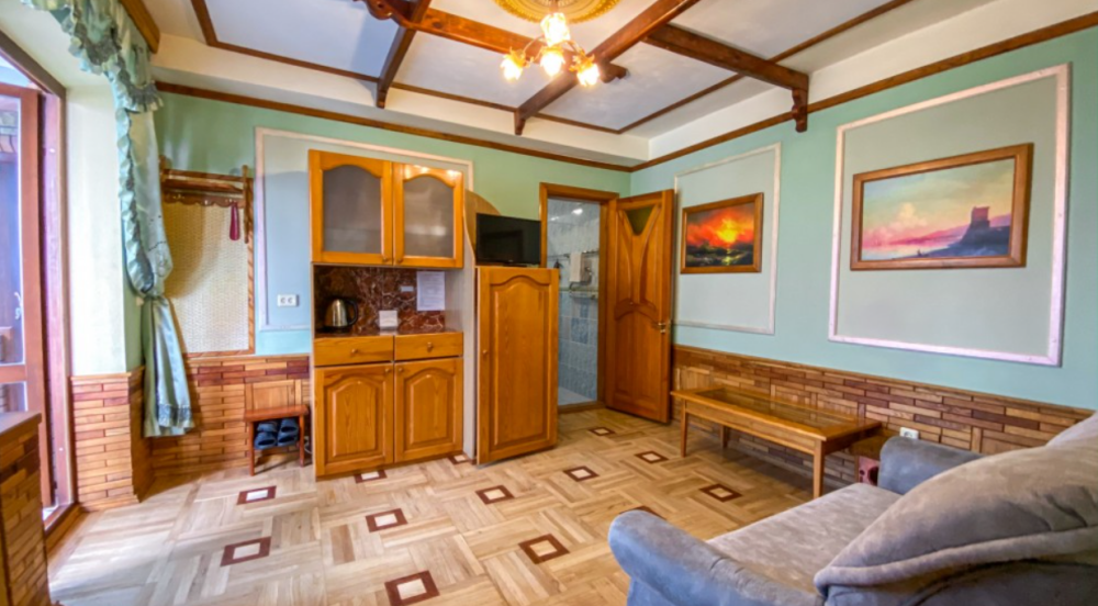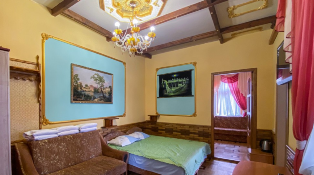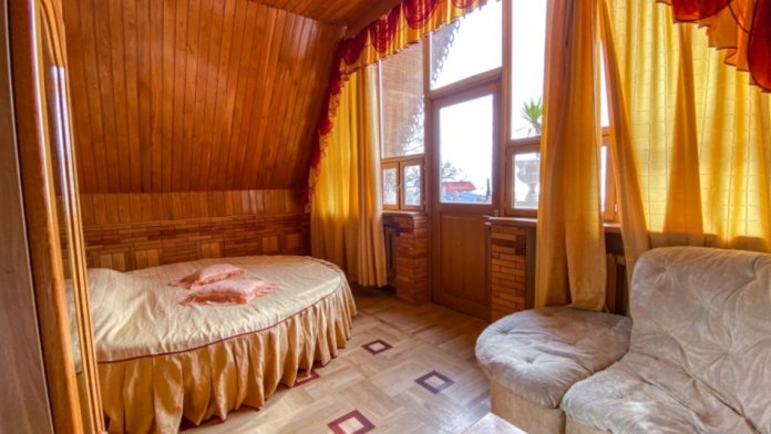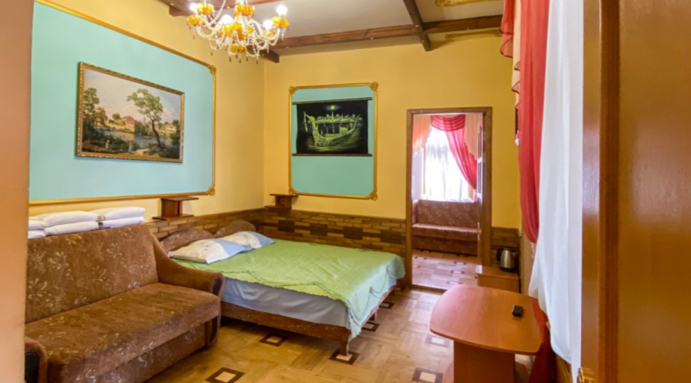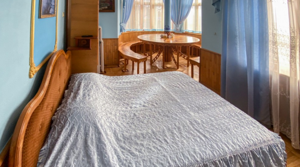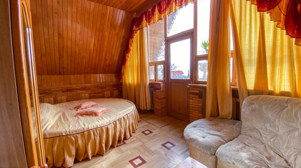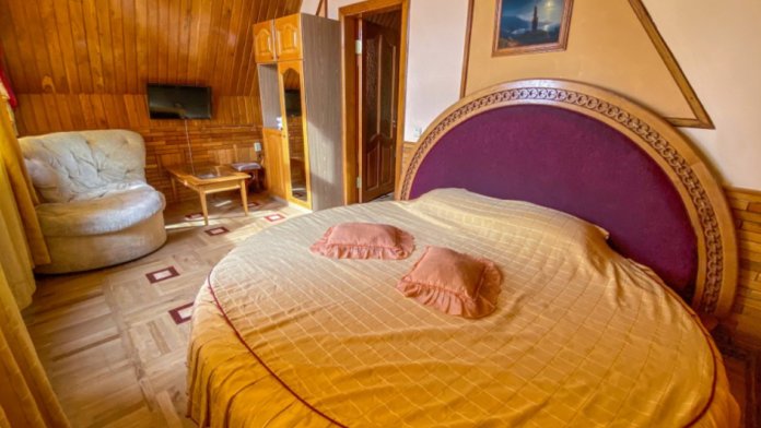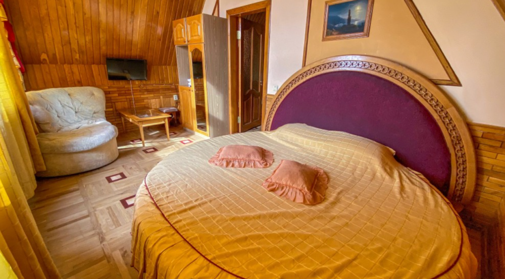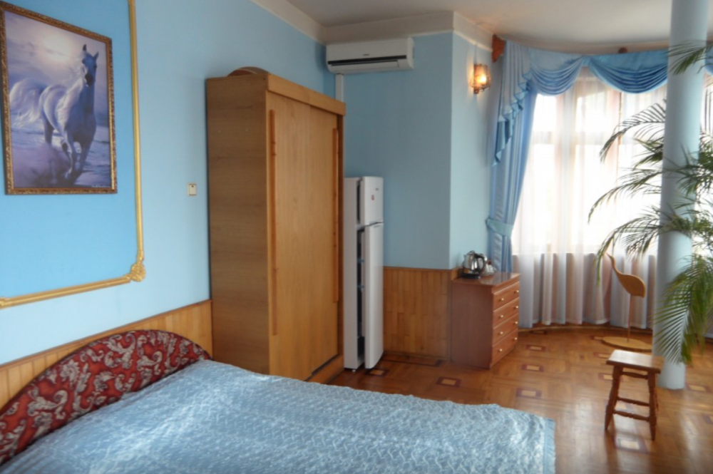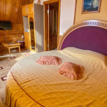 Двухкомнатный Номер люкс с балконом на 2 осн (+2 доп. человека)+ (возможно 5 –е место для ребенка), с полноценным санузлами (ванная, биде, унитаз, умывальник, фен), кондиционер, холодильник, чайник, посуда, кровати: 1 двухспальная круглая и 1 двухспальный раскладной диван, балкон.