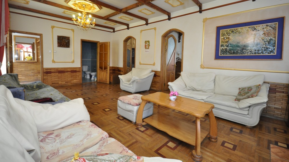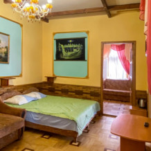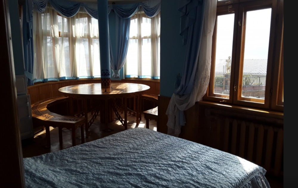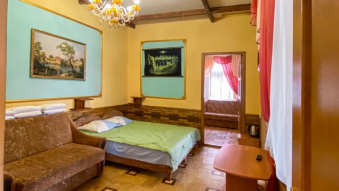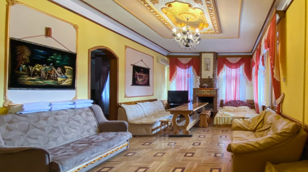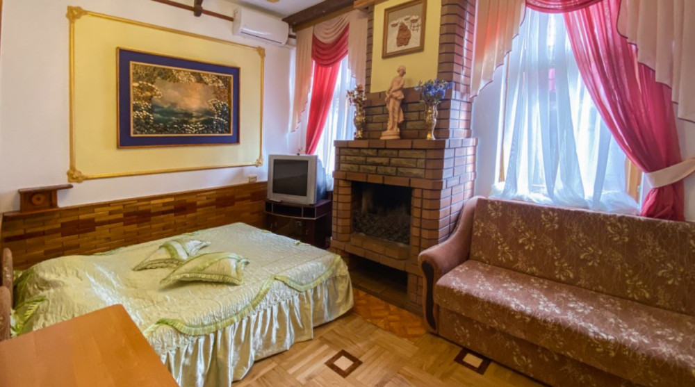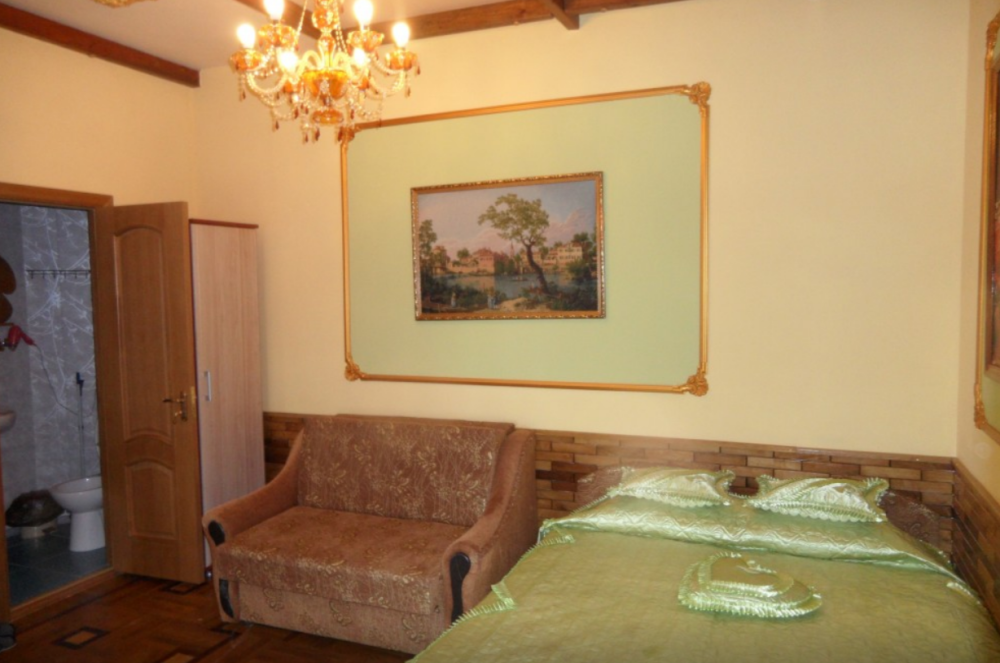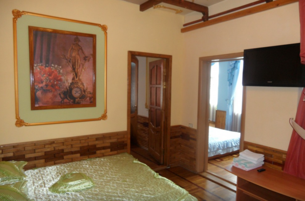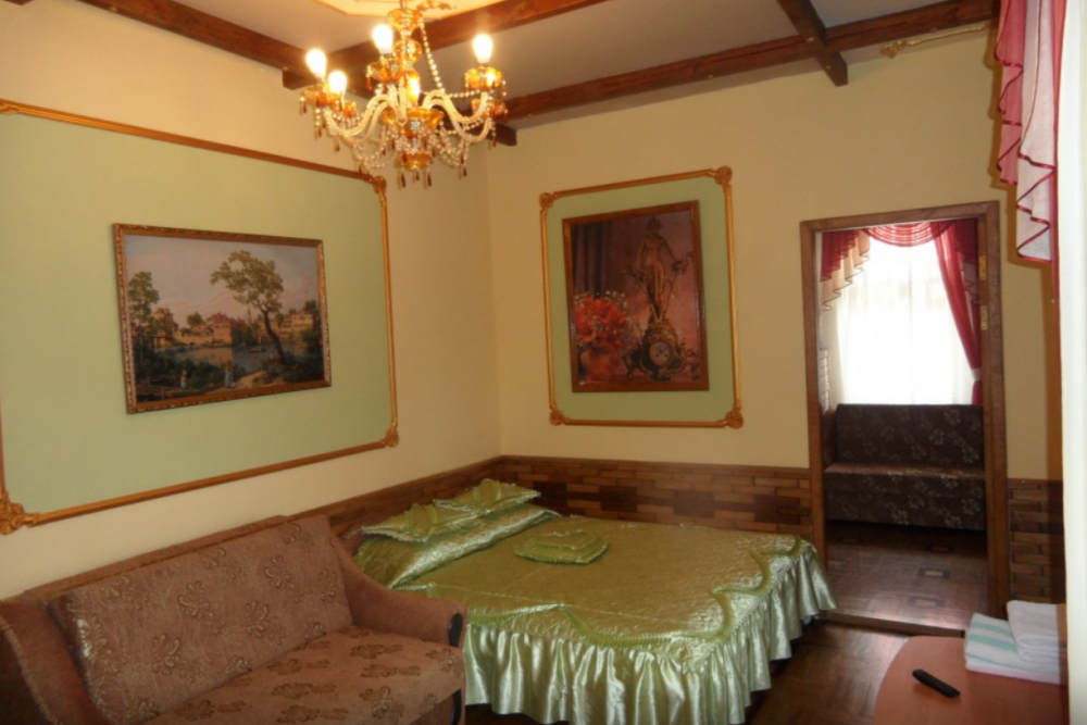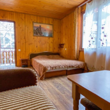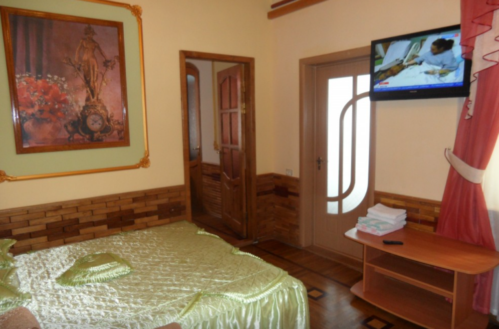 Двухкомнатный Номер люкс с балконом на 2 осн (+2 доп. человека)+ (возможно 5 –е место для ребенка), с полноценным санузлами (ванная, биде, унитаз, умывальник, фен), кондиционер, холодильник, чайник, посуда, кровати: 1 двухспальная круглая и 1 двухспальный раскладной диван, балкон.