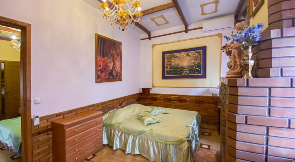 В номере 2 большие спальни, каминный зал (холл), кухня, 2 санузла, 3 кондиционера, камин, большая терраса, 2 телевизора, балкон, 2 фена, холодильник, посуда, чайник, микроволновая печь, 4 дивана - что позволяет дополнительно размещать детей и гостей, 2 двухспальных кровати.
