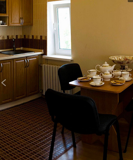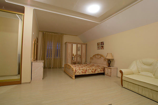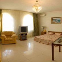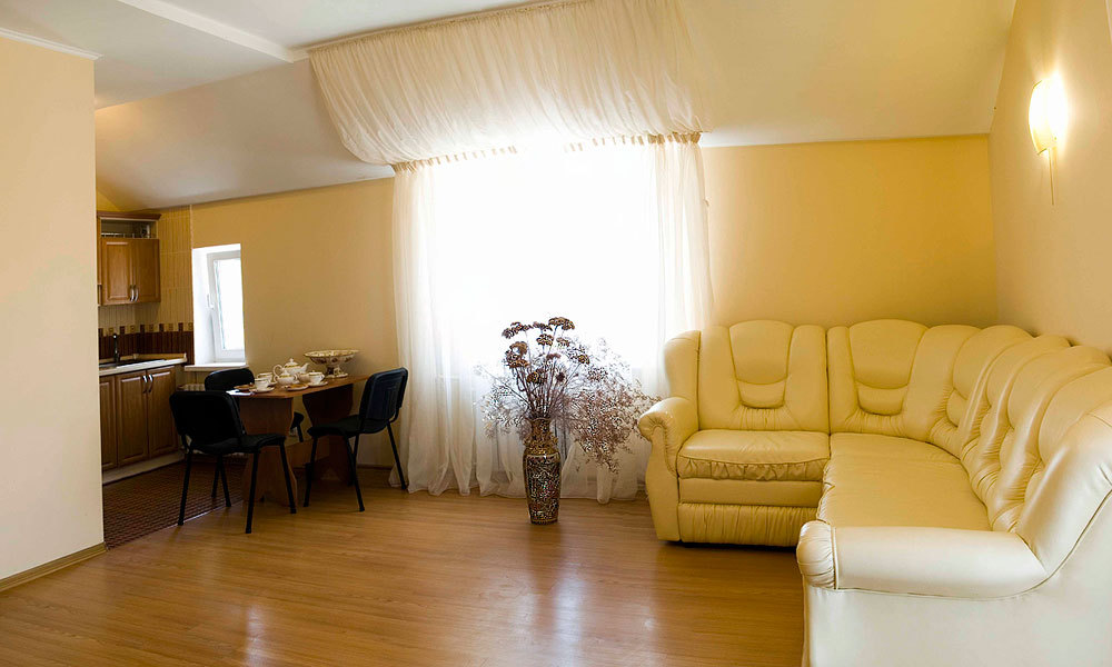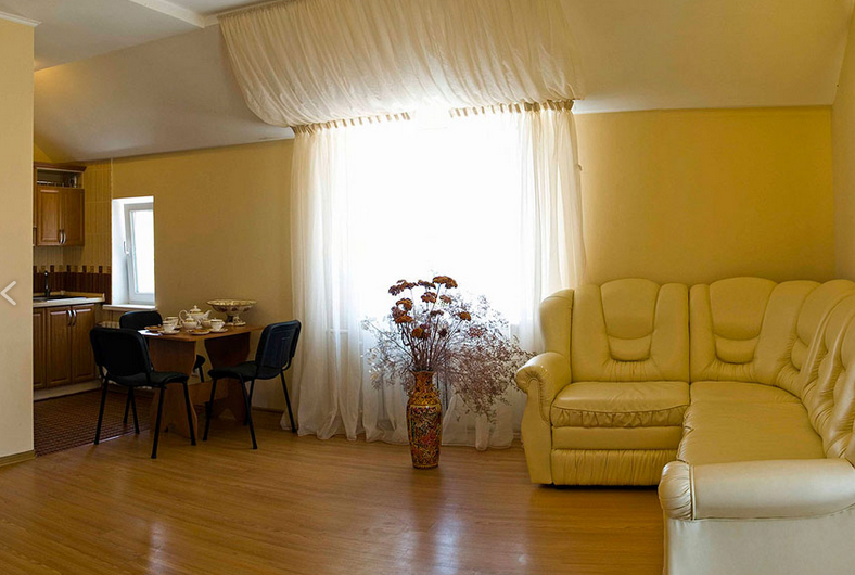 В номере есть кухня с посудой, шкаф-купе, тумбочки, стол со стульями. Стиральная машина в коридоре на три люкса. Смена белья и уборка по графику.