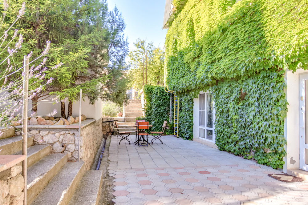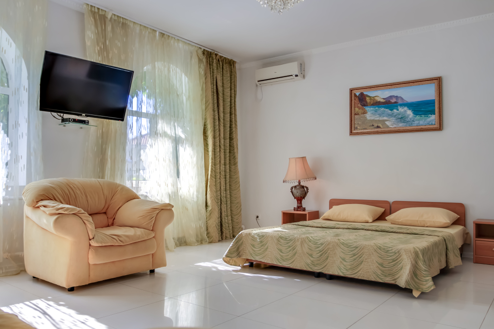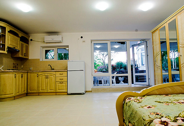 В гостевом доме предусмотрено все самое необходимое для того, чтобы семейный отдых на море оставил незабываемые впечатления. На территории есть несколько беседок для отдыхающих, обвитых ветвями сортового винограда. Отличительной особенностью гостевого дома является большая, очень красивая и уютная зеленая зона, где растут экзотические пальмы, знаменитый крымский можжевельник и множество видов плодовых деревьев, таких как персик, инжир, слива.