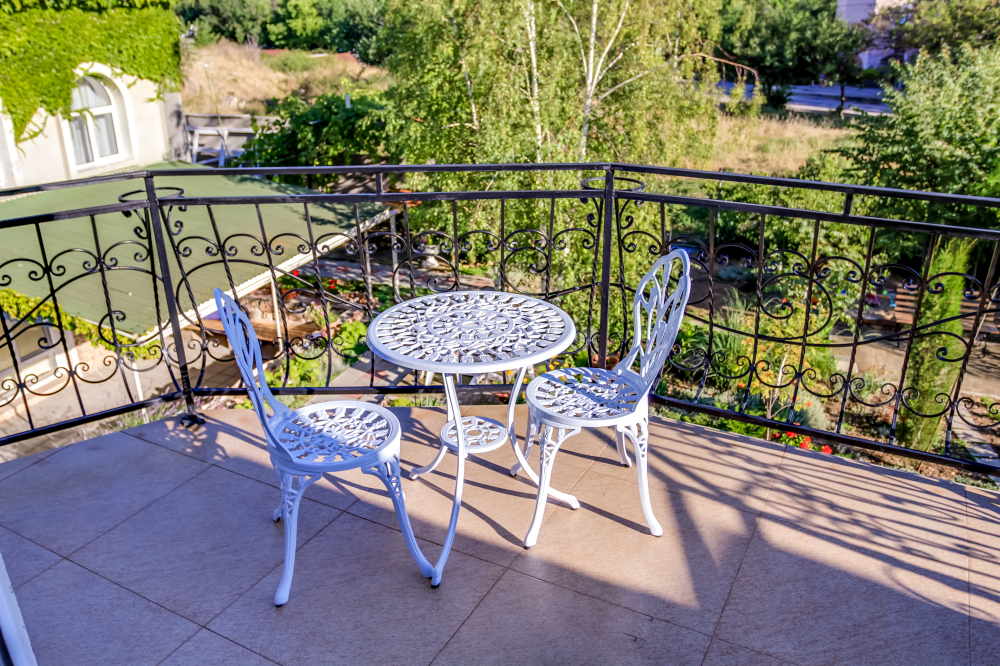 Номер на первом этаже с зоной отдыха – открытая веранда в 24 кв. м. с летней садовой мебелью среди цветов и деревьев.