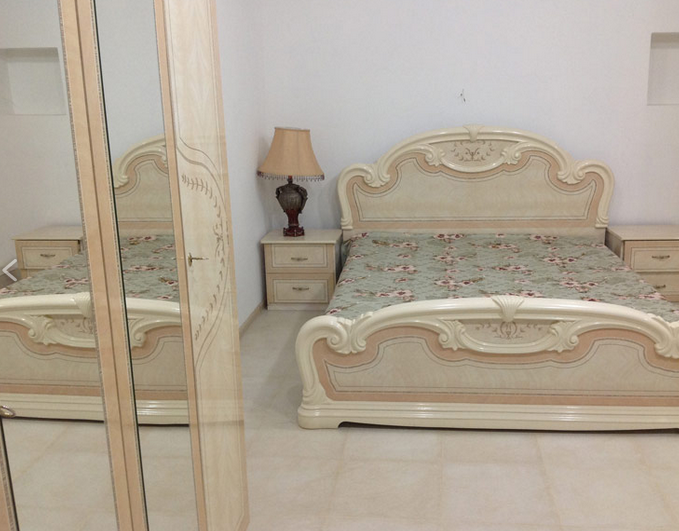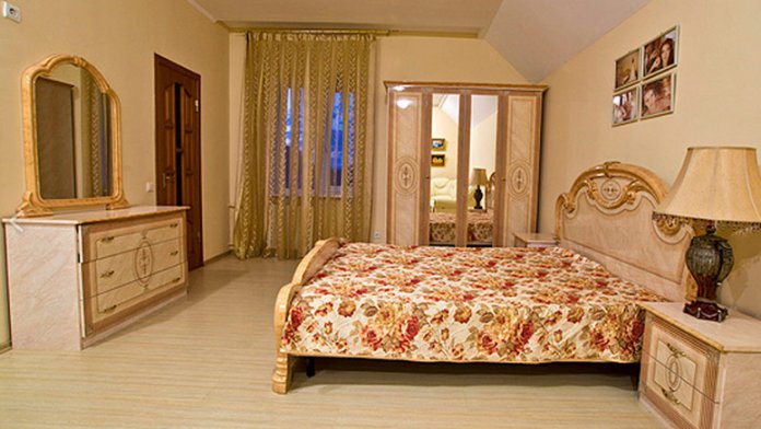 В номере есть кухня с посудой, шкаф-купе, тумбочки, шкаф, комод с зеркалом, стол со стульями.
