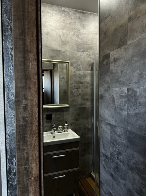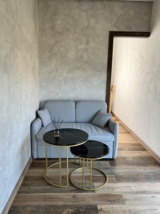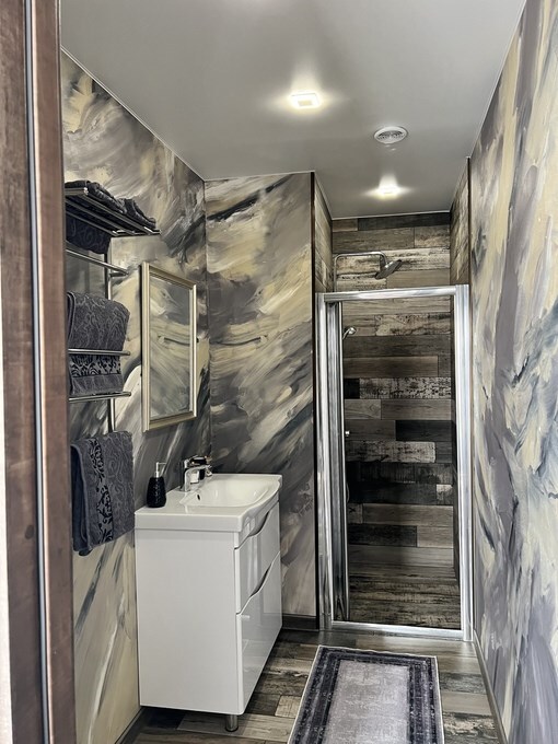 Вместительный двухкомнатный домик с новейшим стильным дизайном. В первой комнате Вас ждет мини кухня со всем необходимым для приготовления завтрака обеда и ужина, а так же удобный диван и журнальный столик для отдыха. Вторая комната - спальная зона с большой двухместной кроватью.