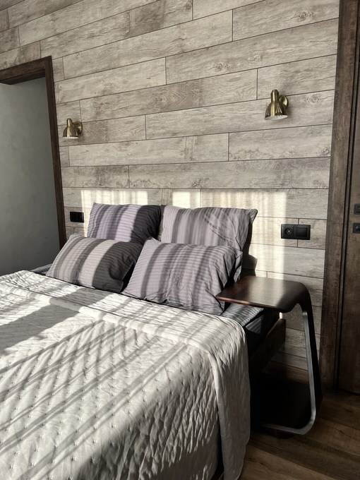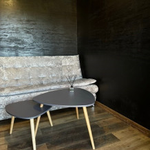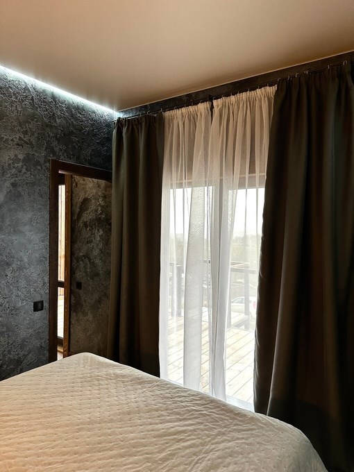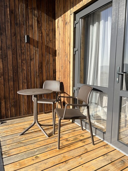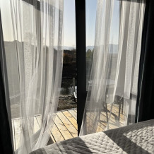 Вместительный двухкомнатный домик с новейшим стильным дизайном. В первой комнате Вас ждет мини кухня со всем необходимым для приготовления завтрака обеда и ужина, а так же удобный диван и журнальный столик для отдыха. Вторая комната - спальная зона с большой двухместной кроватью и выходом на террасу.