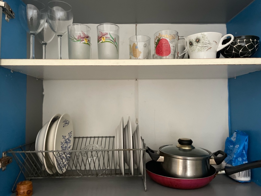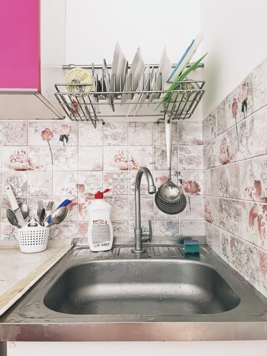 На кухне плитка, холодильник, посуда, электрочайник, кухонная мойка, а также полотенца, моющие средства, губки.