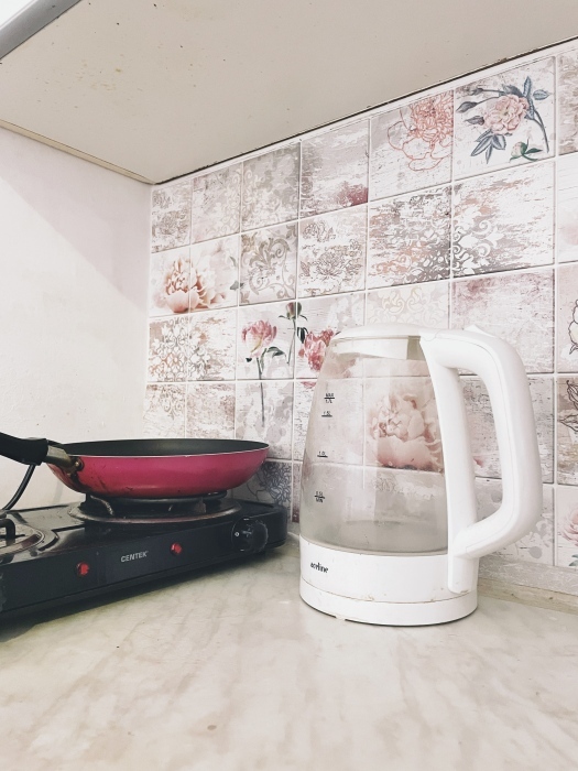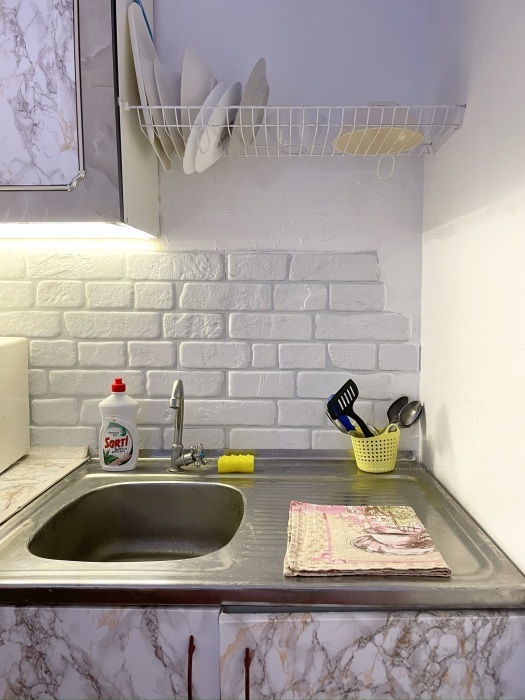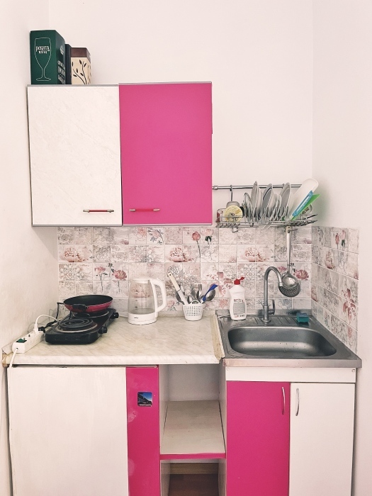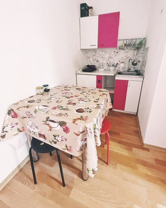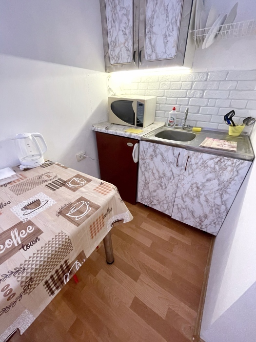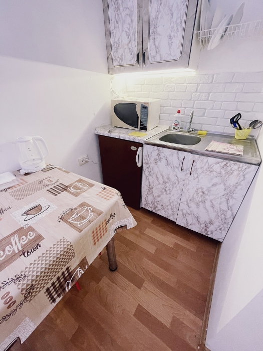 - Кухонная зона оборудована: электроплитой, холодильником, электрочайником, посудой и всеми необходимыми принадлежностями для готовки.