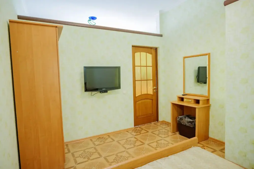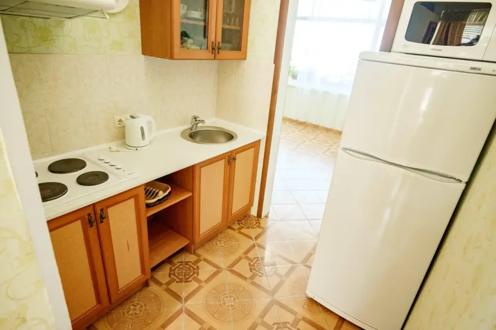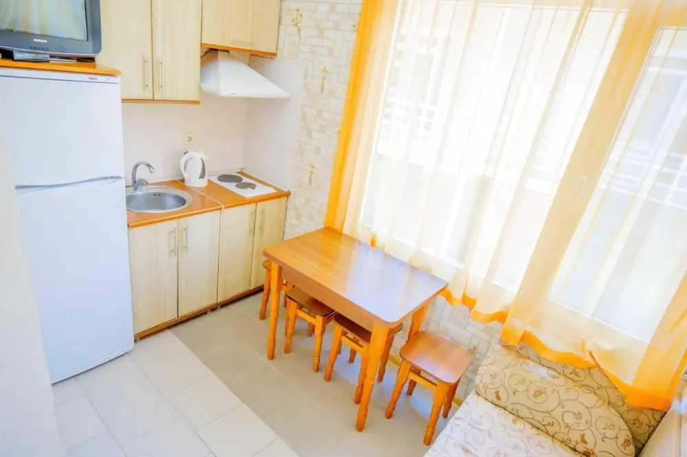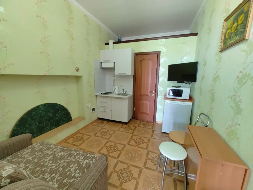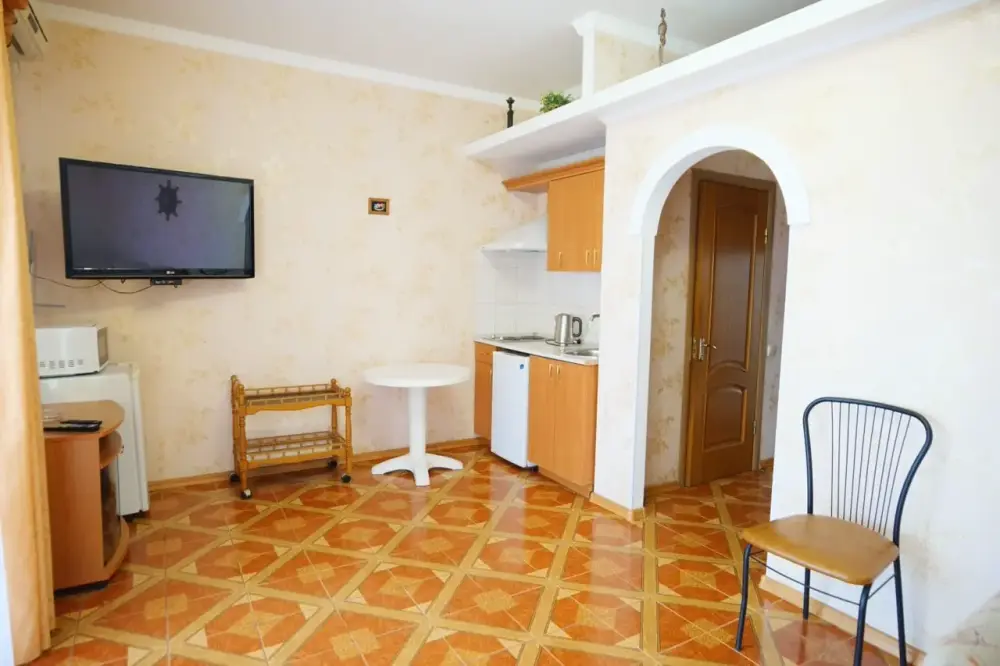 Четырехместный номер с телевизором, кухней, оснащенной плитой, холодильником, микроволновой печью. Также имеется выход на балкон.