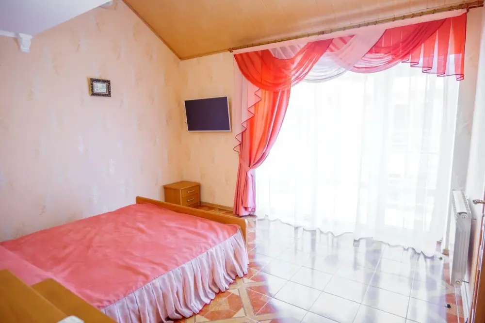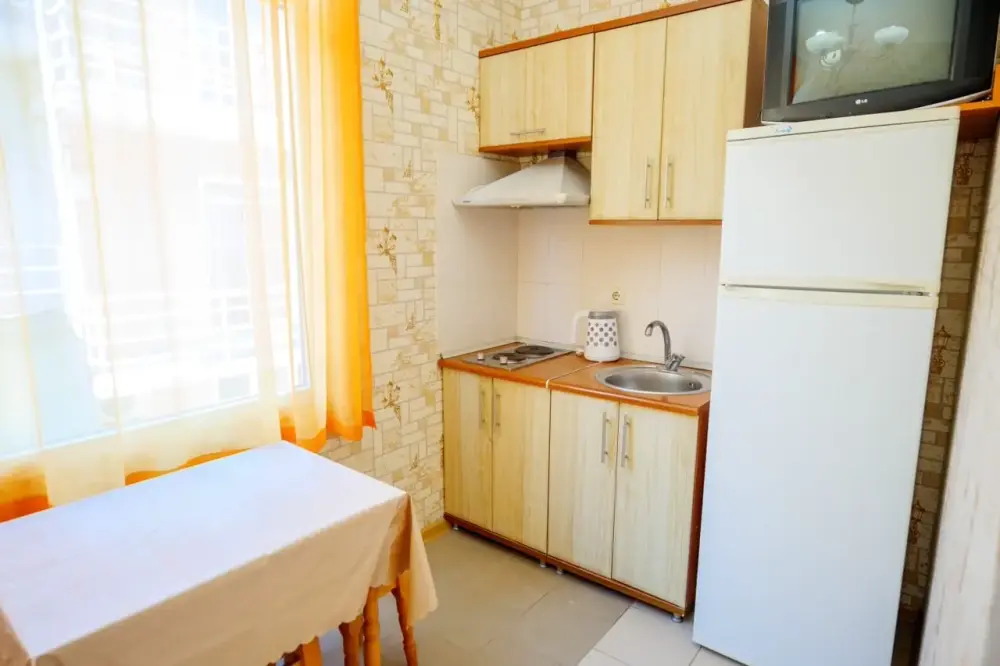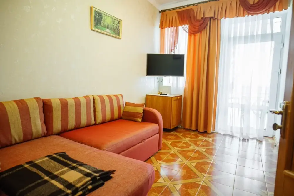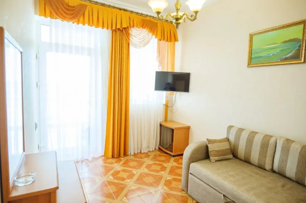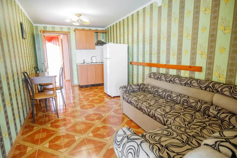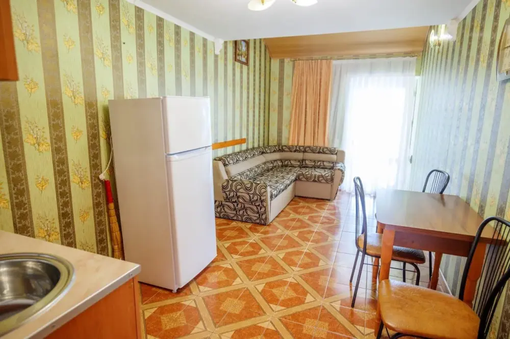 Четырехместный номер с телевизором, кухней, оснащенной плитой, холодильником, микроволновой печью. Также имеется выход на балкон.